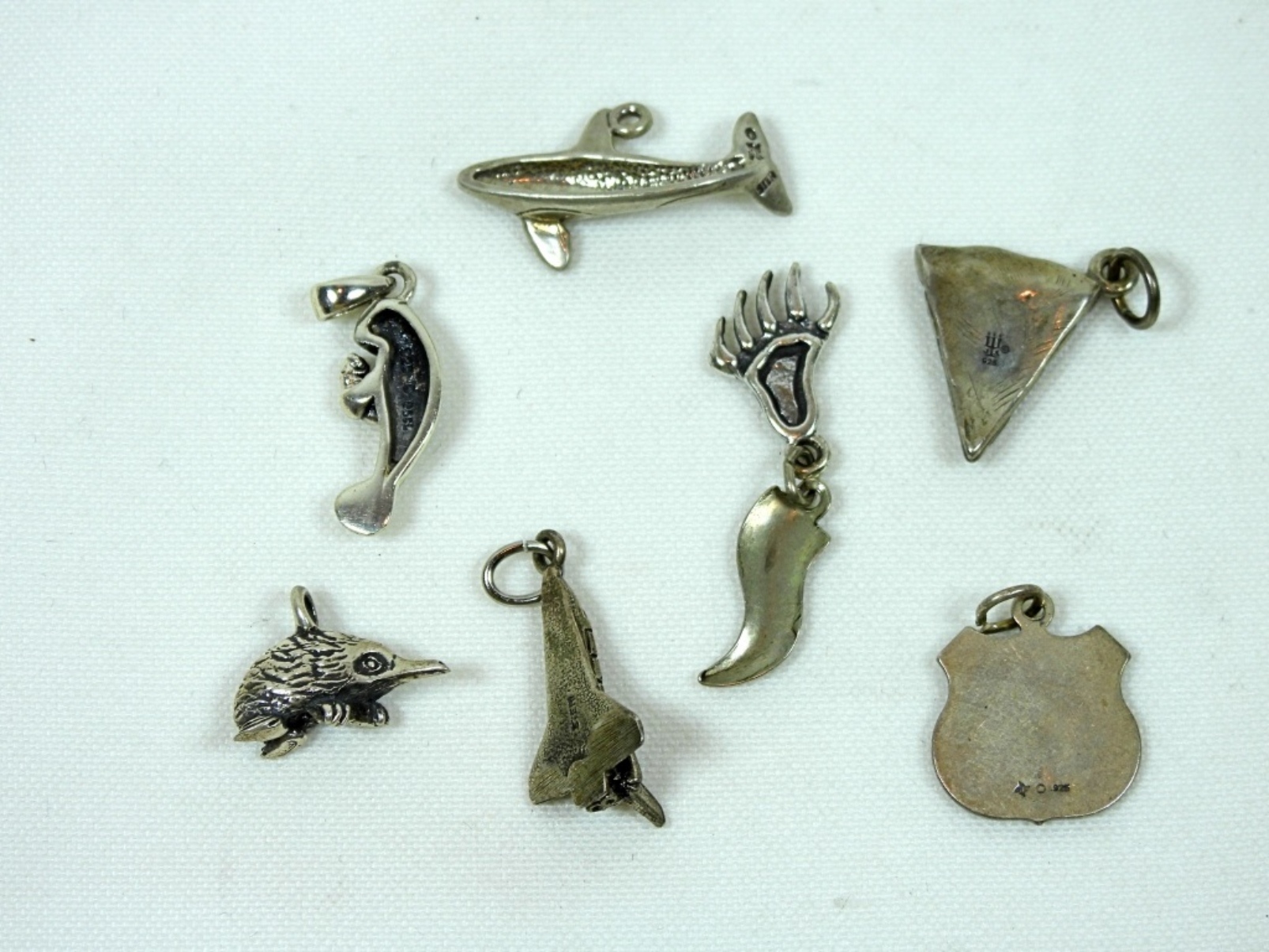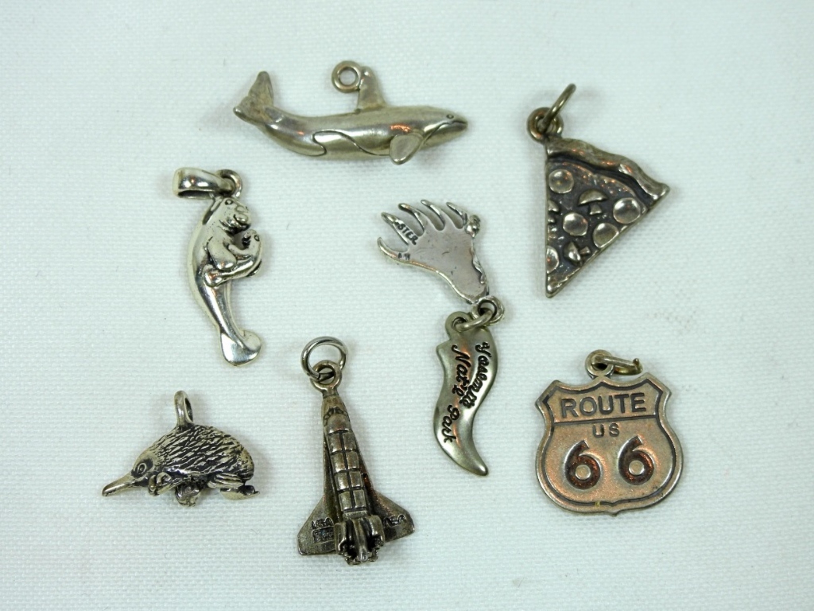 7 VARIETY STERLING PENDANTS, ROUTE 66, DOLPHIN, OTTER, CLAW, PIZZA, SPACESHIP, HEDGEHOG, DWT (9.7)