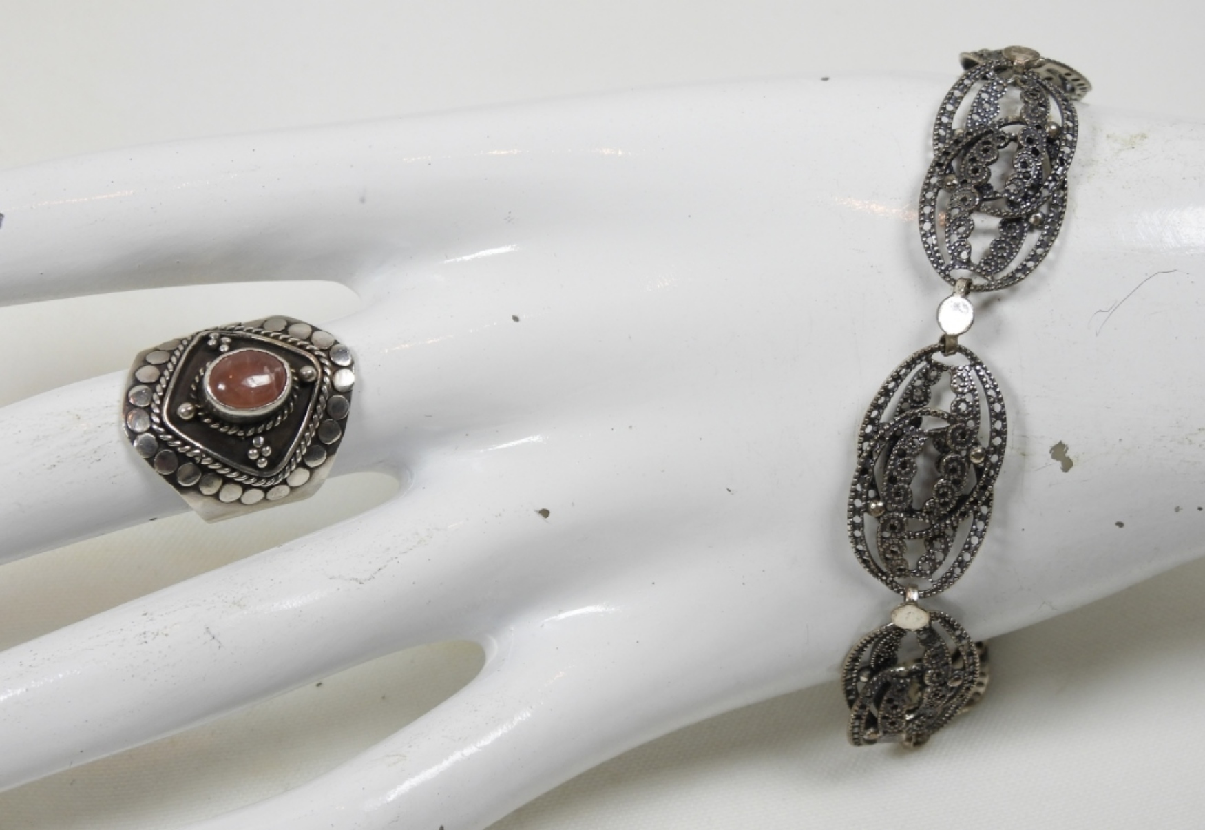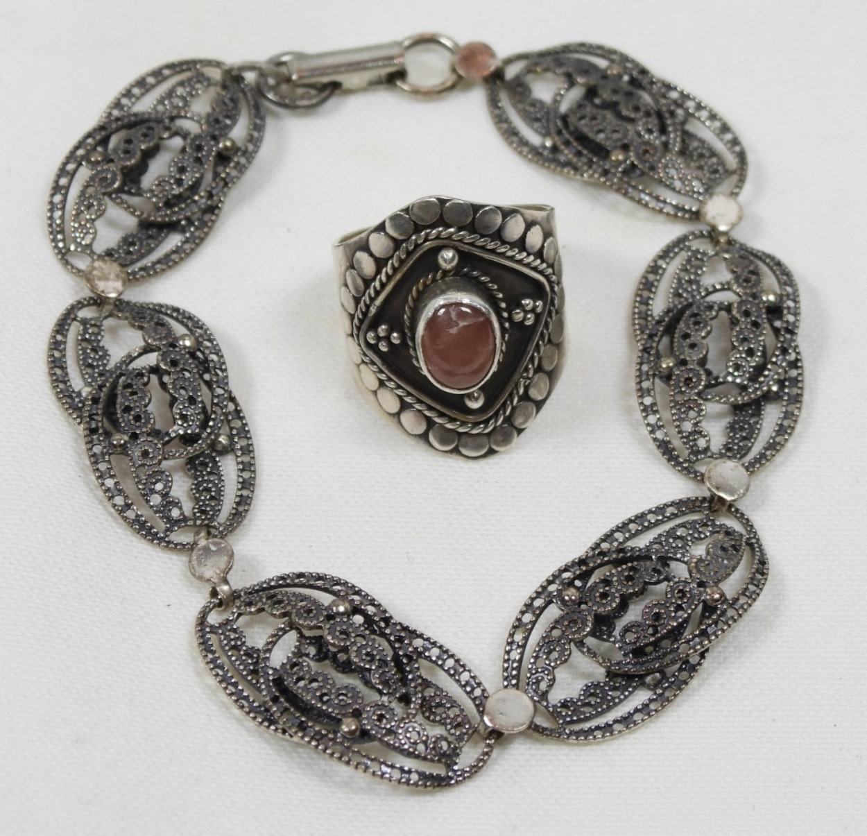 11DWT, PINK GEMSTONE RING SIZE 6 MARKED 925, STERLING BRACELET IS ABOUT 8IN LONG