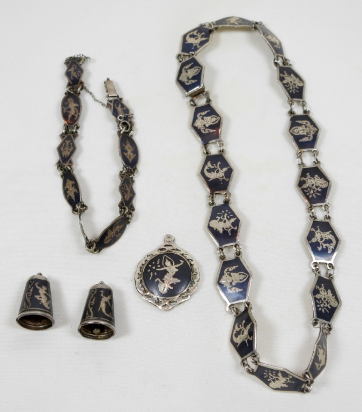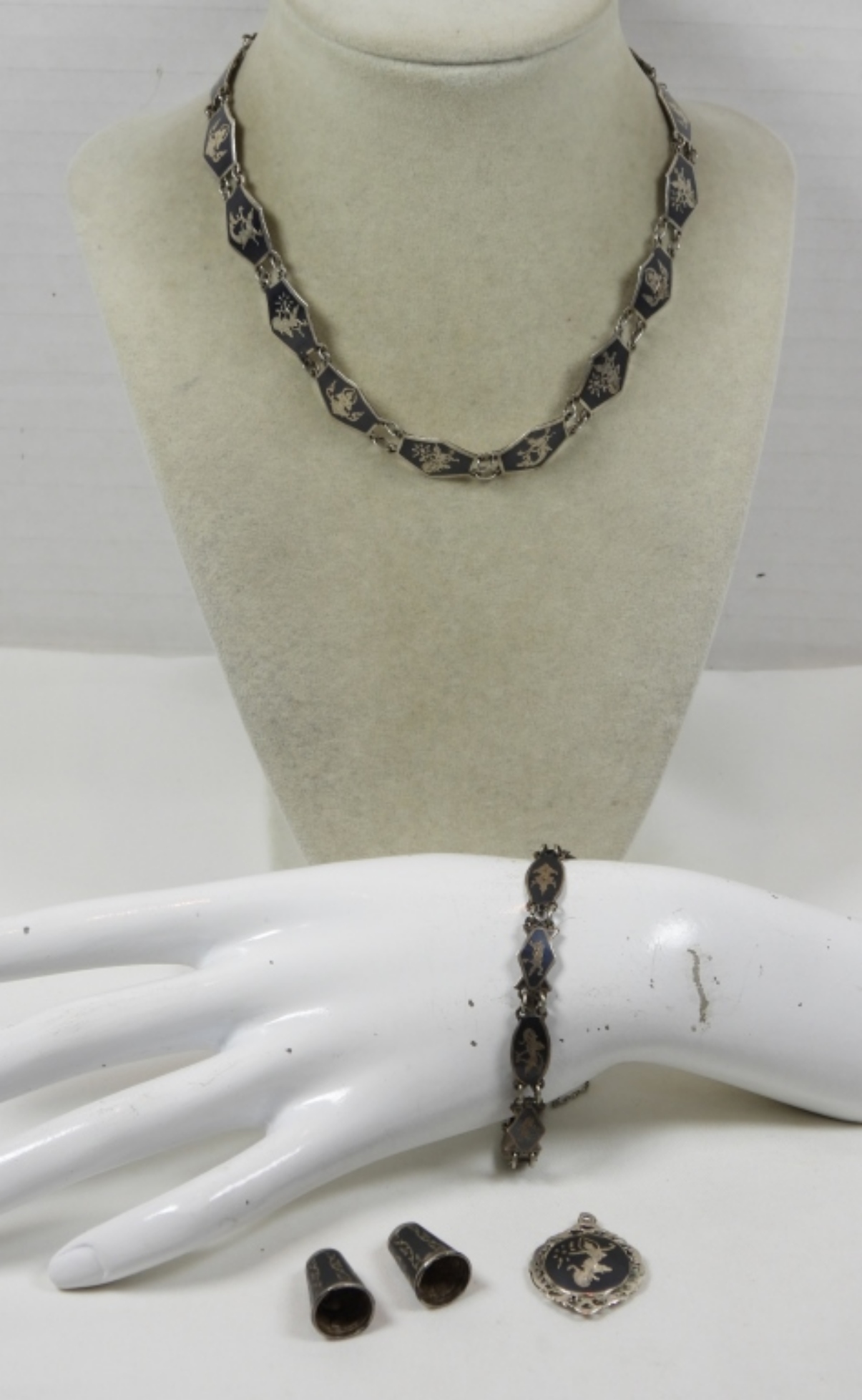 29DWT, NECKLACE 15IN LONG, BRACELET NEAR 8IN LONG, 2 BELL CHARMS AND 1 PENDANT, NECKLACE AND BRACELET IS MARKED SIAM STERLING