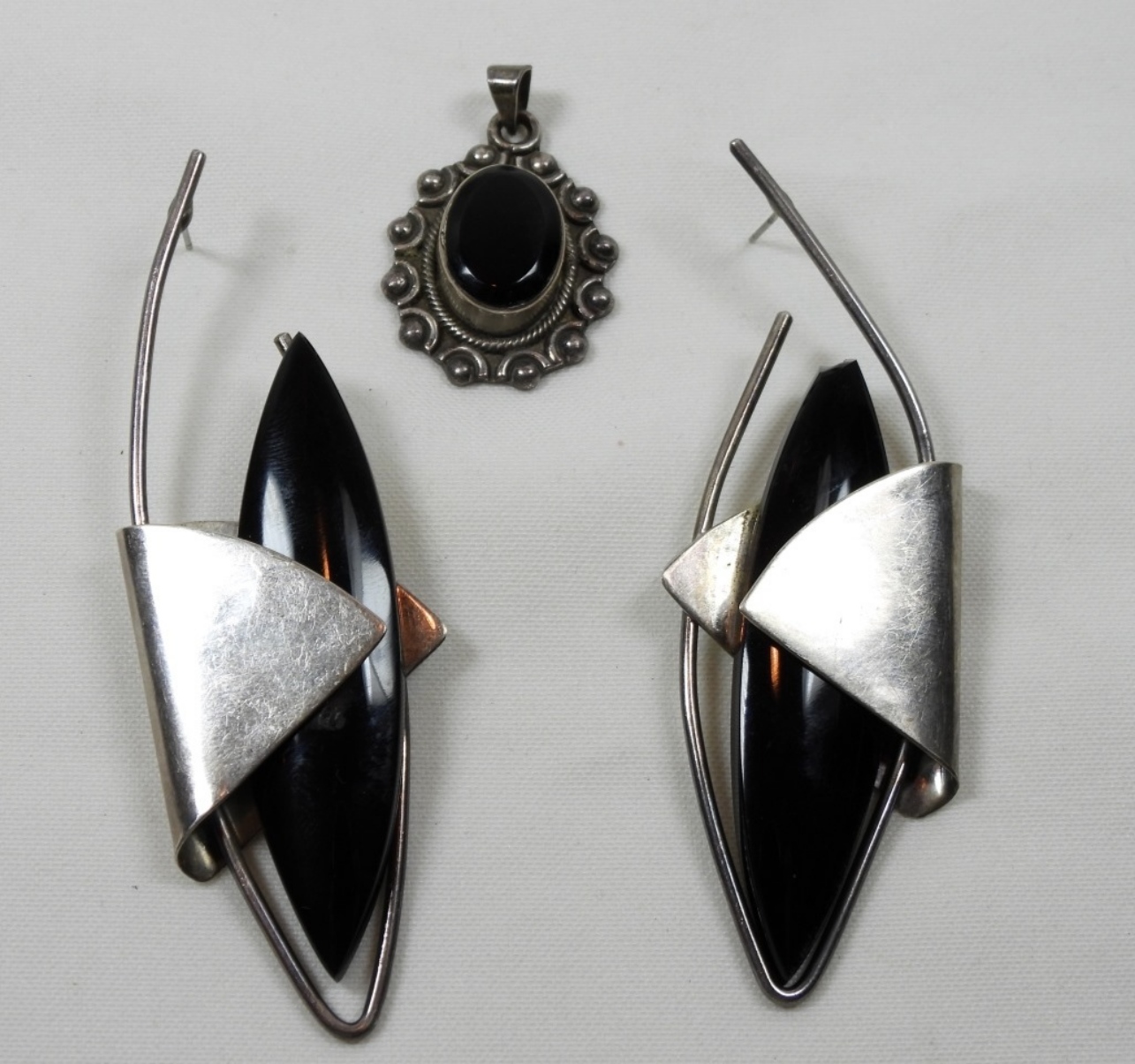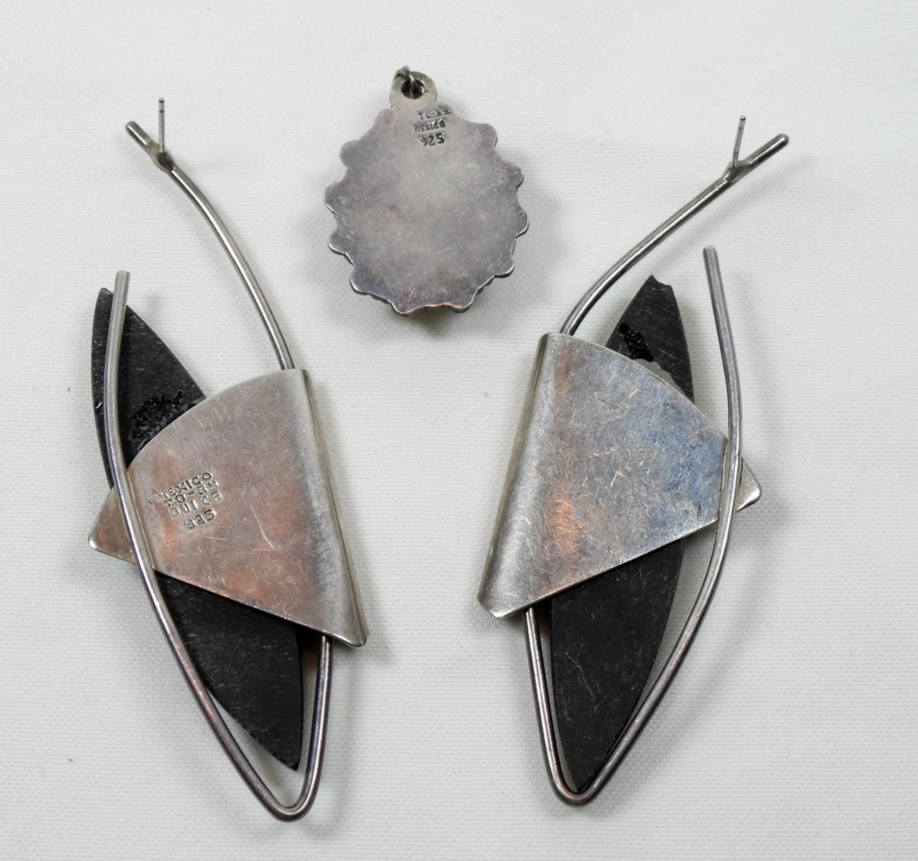 31DWT, A PAIR OF PIERCED EARRINGS STAMPED MEXICO TO-34 DULCE 925, PENDANT 1 1/2IN LONG STAMPED TL-76 MEXICO 925