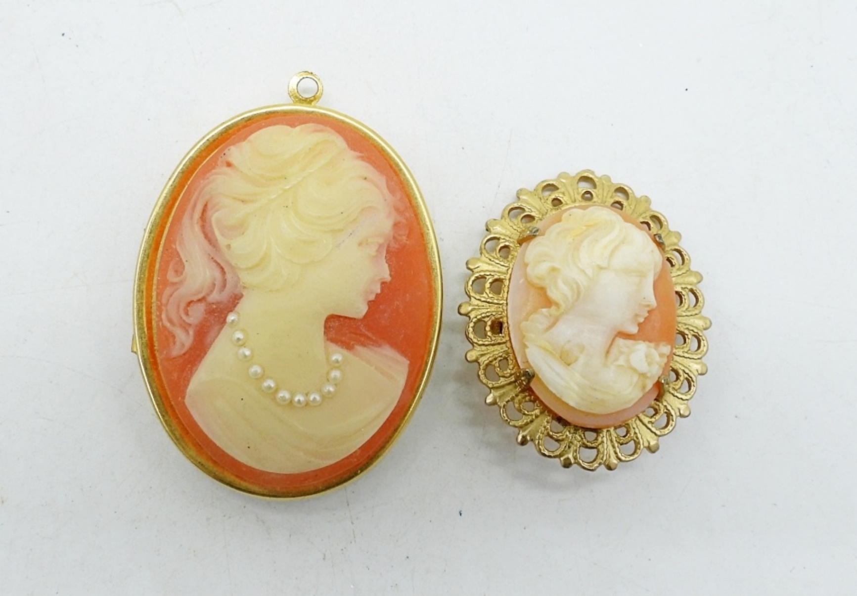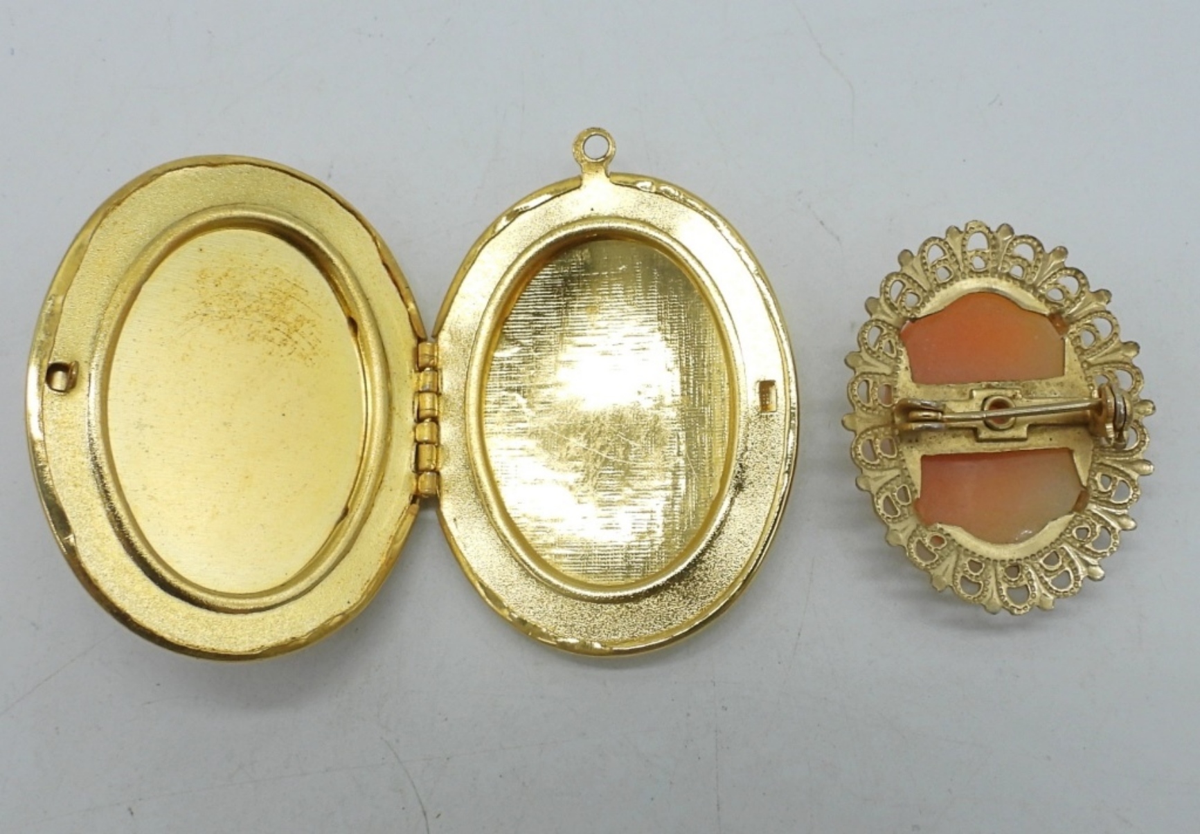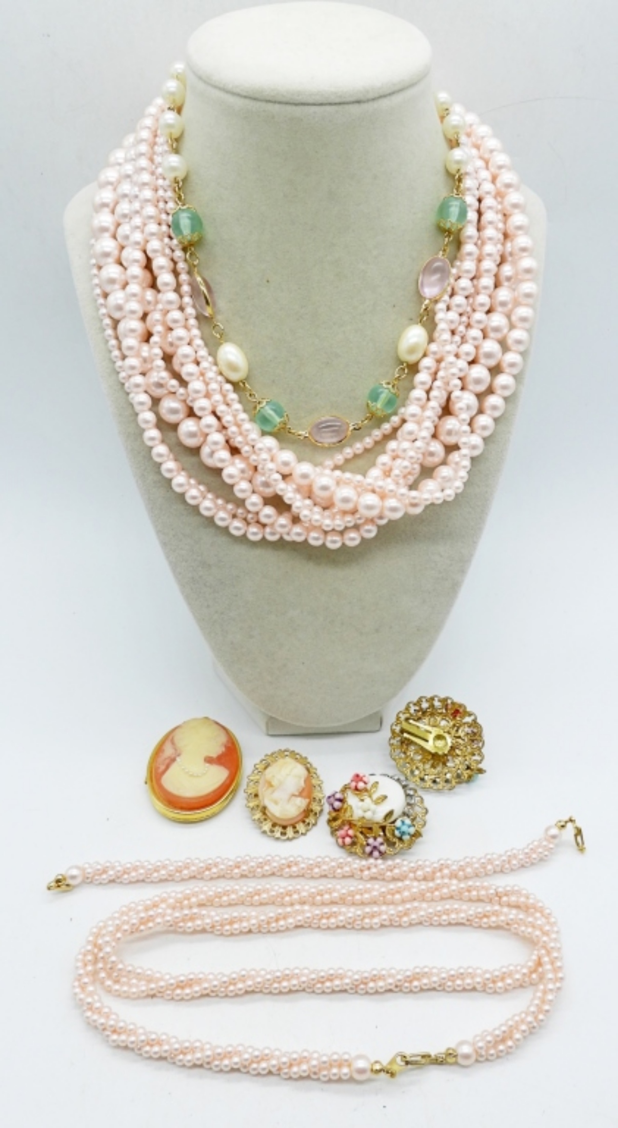 CAMEO BROOCH, CAMEO LOCKET PENDANT, 1.5″ & 2″. MULTI STRAND PINK FAUX PEARL NECKLACE, 18″. SINGLE STRAND PINK FAUX PEARL NECKLACE 12″ WITH MATCHING BRACELET, 7.5″. 1928 BRAND FAUX PEARL NECKLACE, 18″. PRETTY
