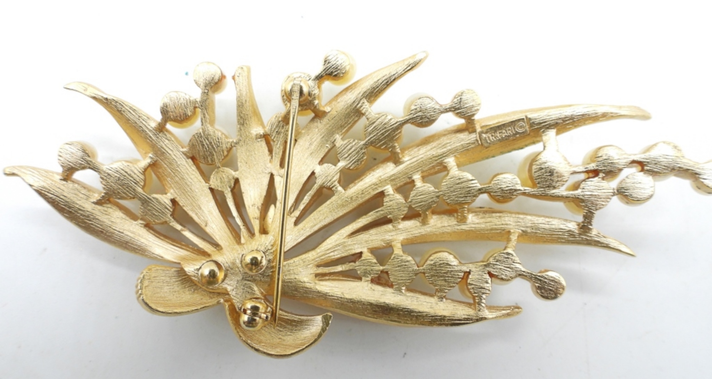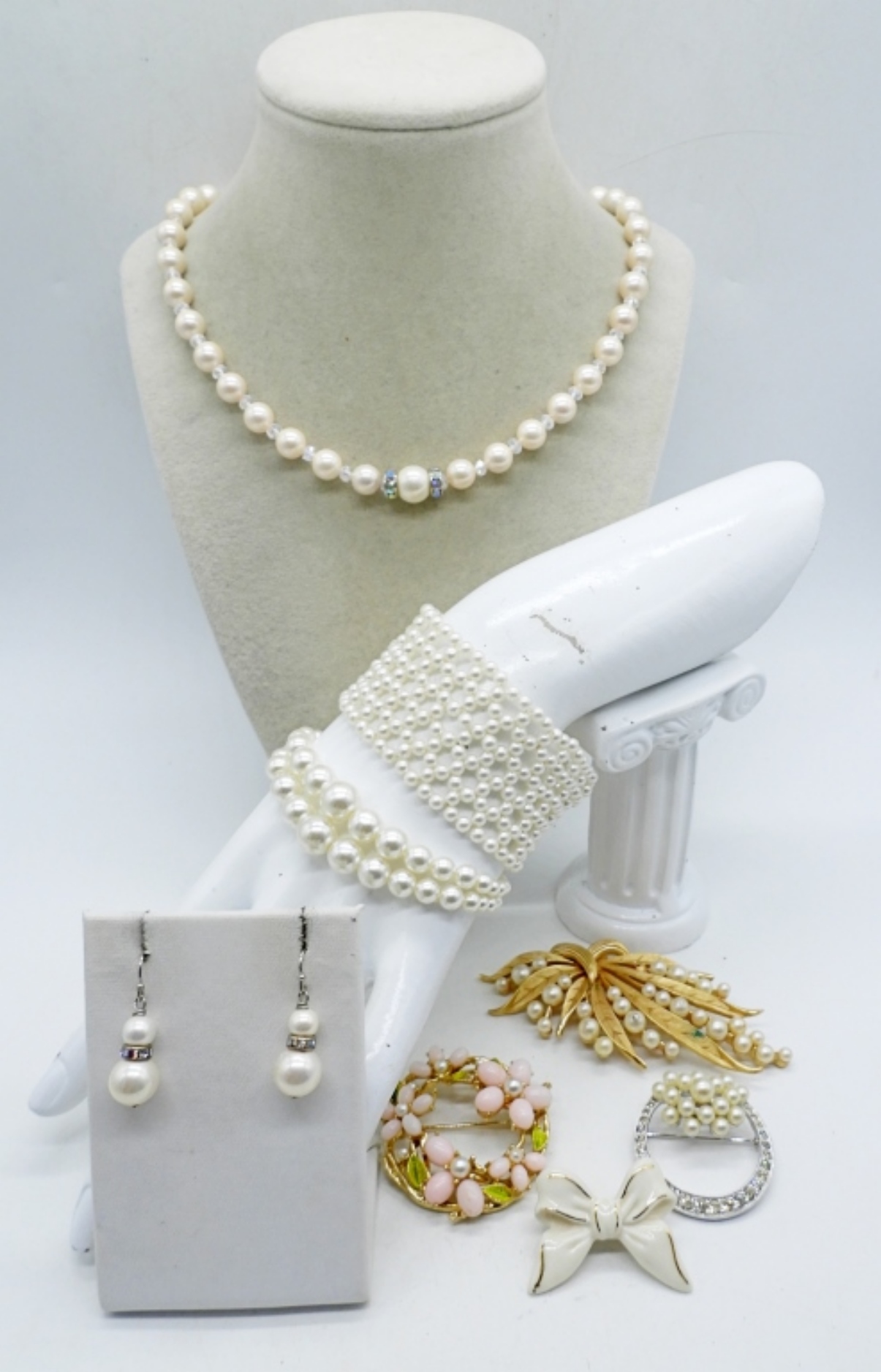 TRIFARI GOLD TONE PEARL BROOCH (MISSING ONE PEARL) 4″. FAUX PEARL NECKLACE 20″. STRETCHY BRACELET & 8″. 3 OTHER BROOCHES. ONE PAIR OF FAUX PEARL PIERCED EARRINGS.