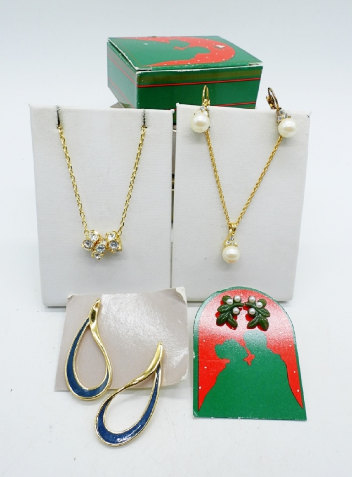 AVON CRYSTAL RING TRIO NECKLACE CLEAR 22″. AVON GOLD TONE PEARL NECKLACE 18″ & PIERCED EARRINGS. AVON MISTLETOE EARRINGS 1986. AVON COLOR SWIRL EARRINGS, MARINE BLUE.
