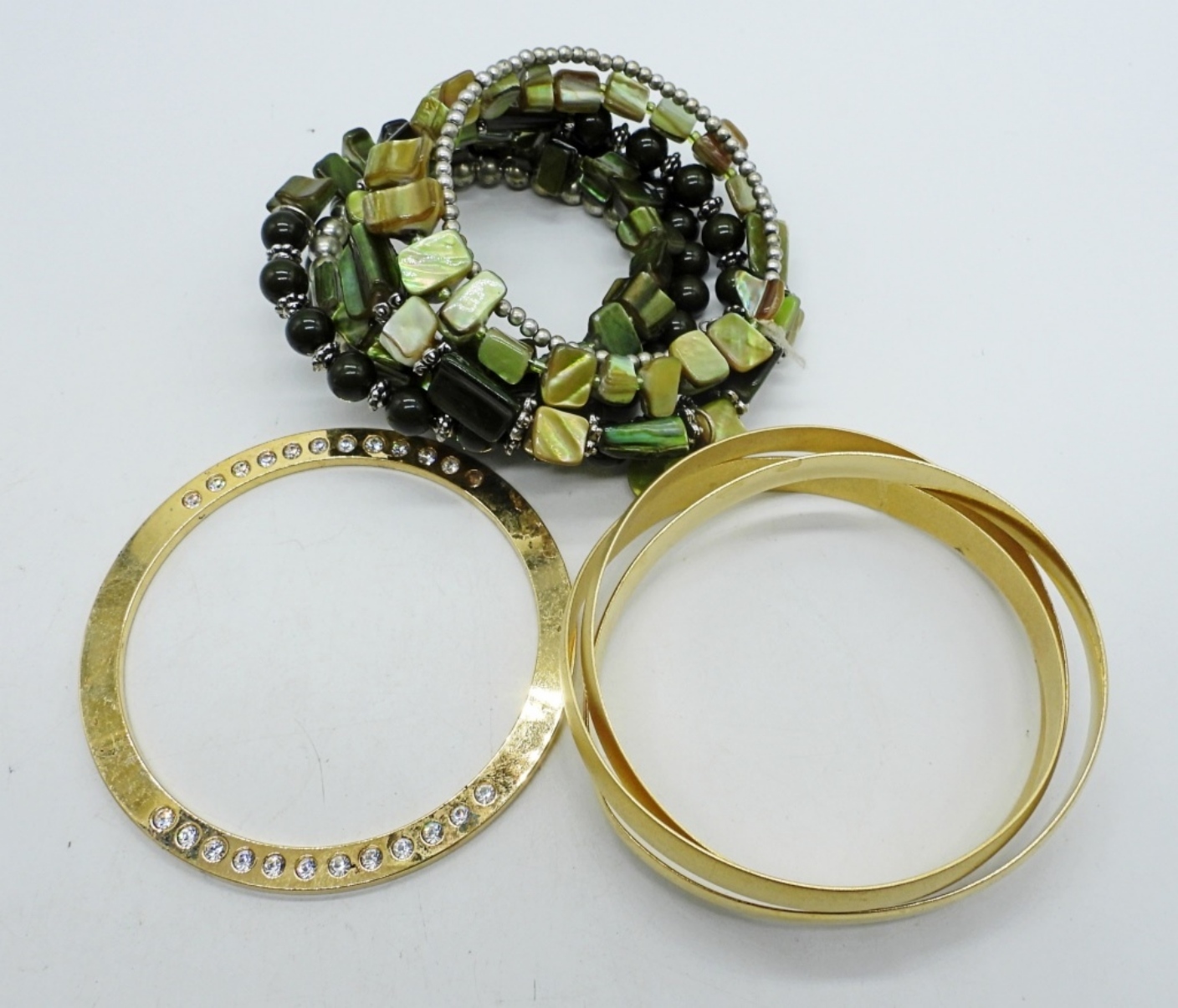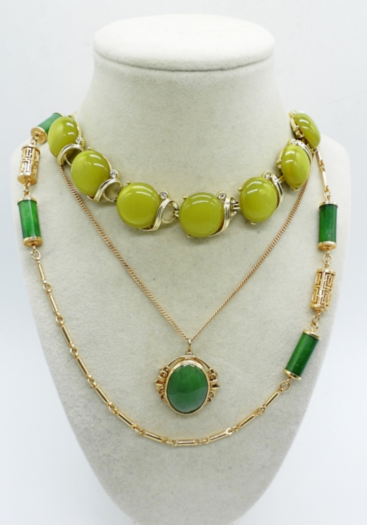 LISNER VINTAGE GOLD TONE, LIGHT GREEN STONE NECKLACE (17″). SARAH COVENTRY GOLD TONE FASHION NECKLACE (32″). VAN DELL GEMSTONE NECKLACE (1/20 12K GF) 18″. THREE BRACELETS.