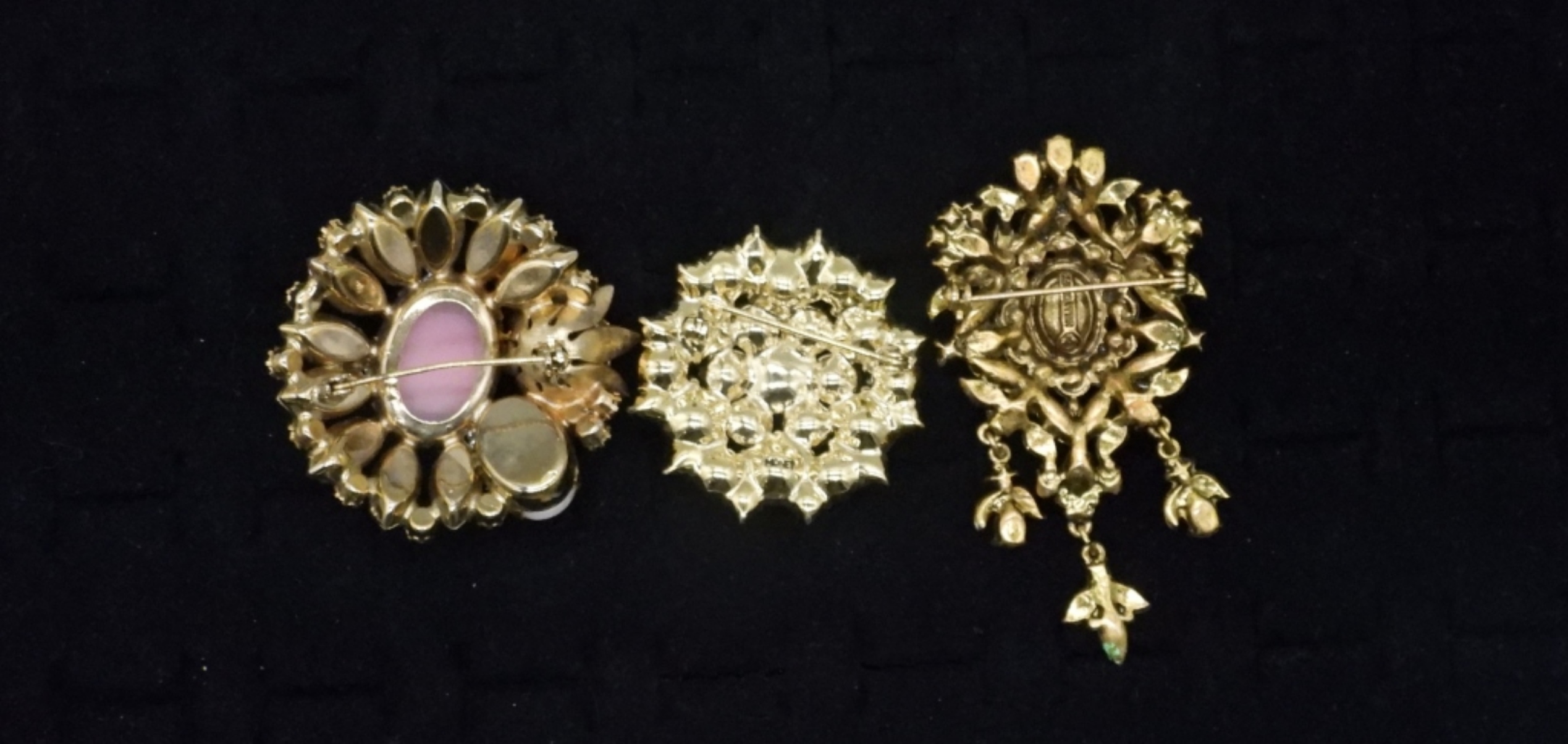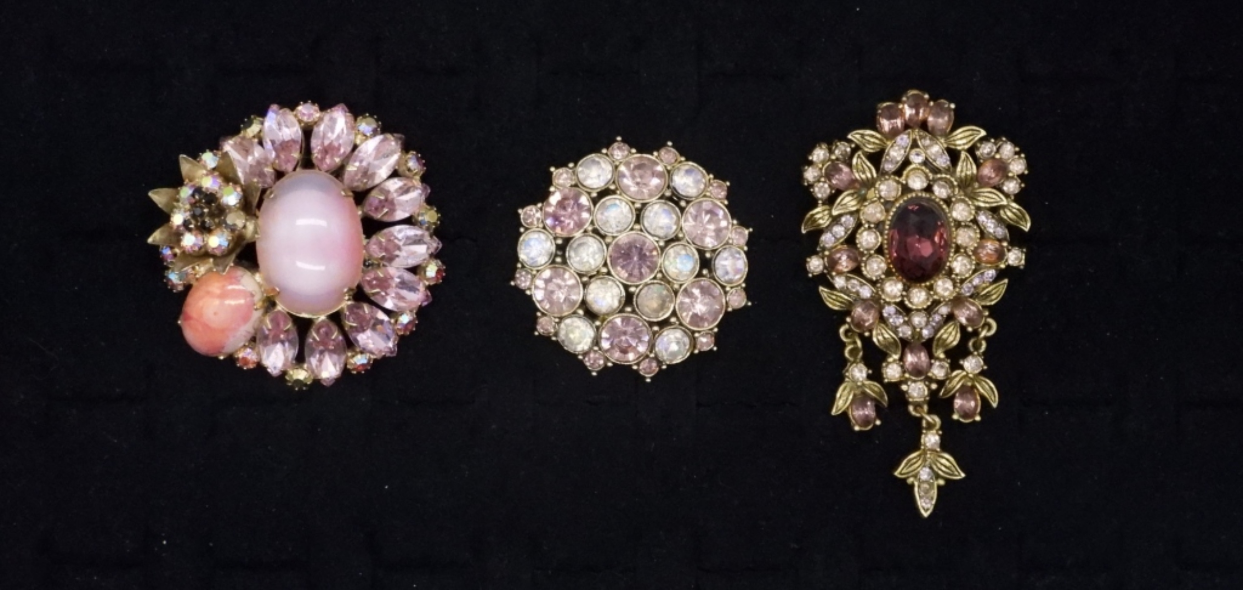 PINK GEMSTONE / RHINESTONE HOLLY CRAFT BROOCH AND TWO OTHER PRETTY BROOCHES. 2″ – 3″