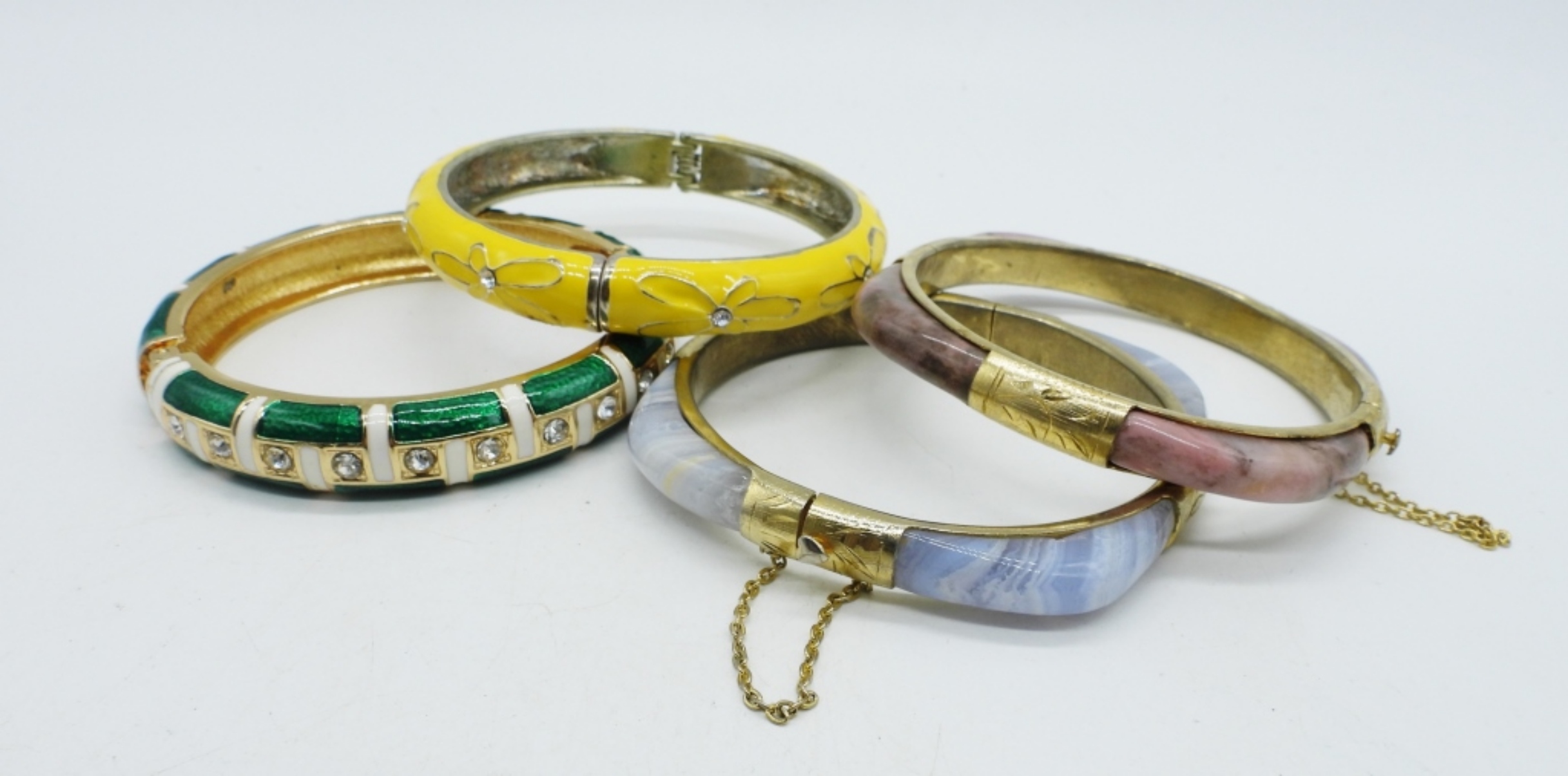 FOUR VERY COOL ENAMELED BANGLE HINGED BRACELETS. 8″.