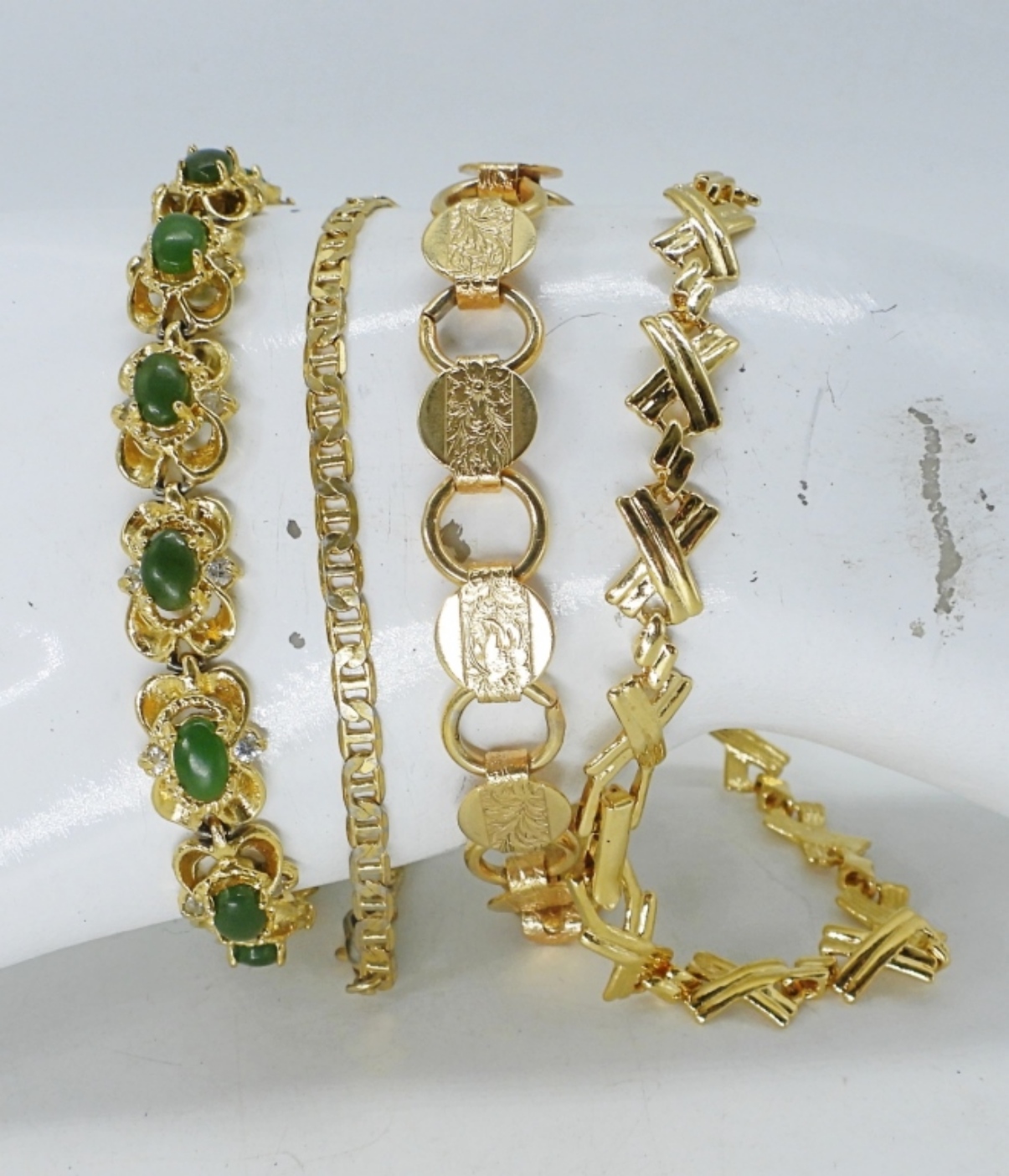 FOUR GOLD TONE FASHION BRACELETS, 7-8″