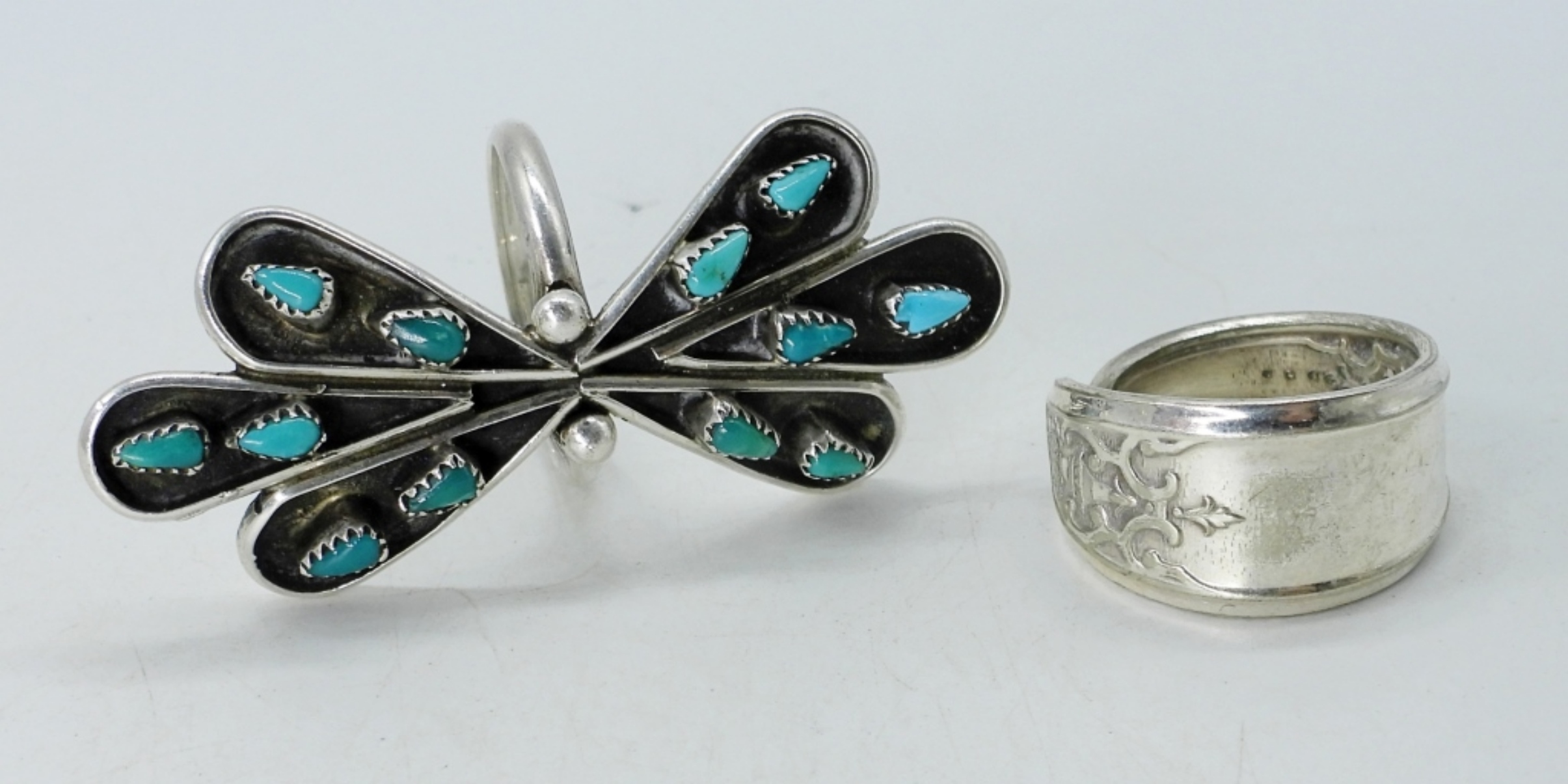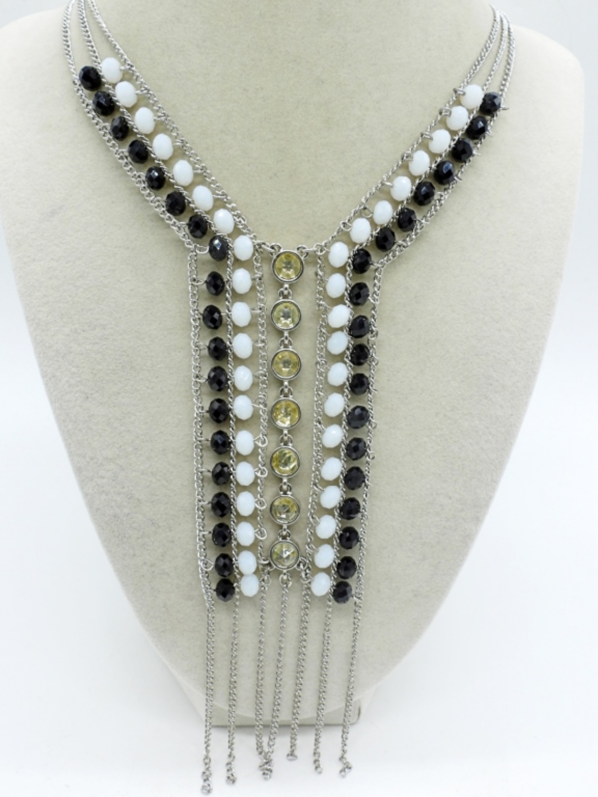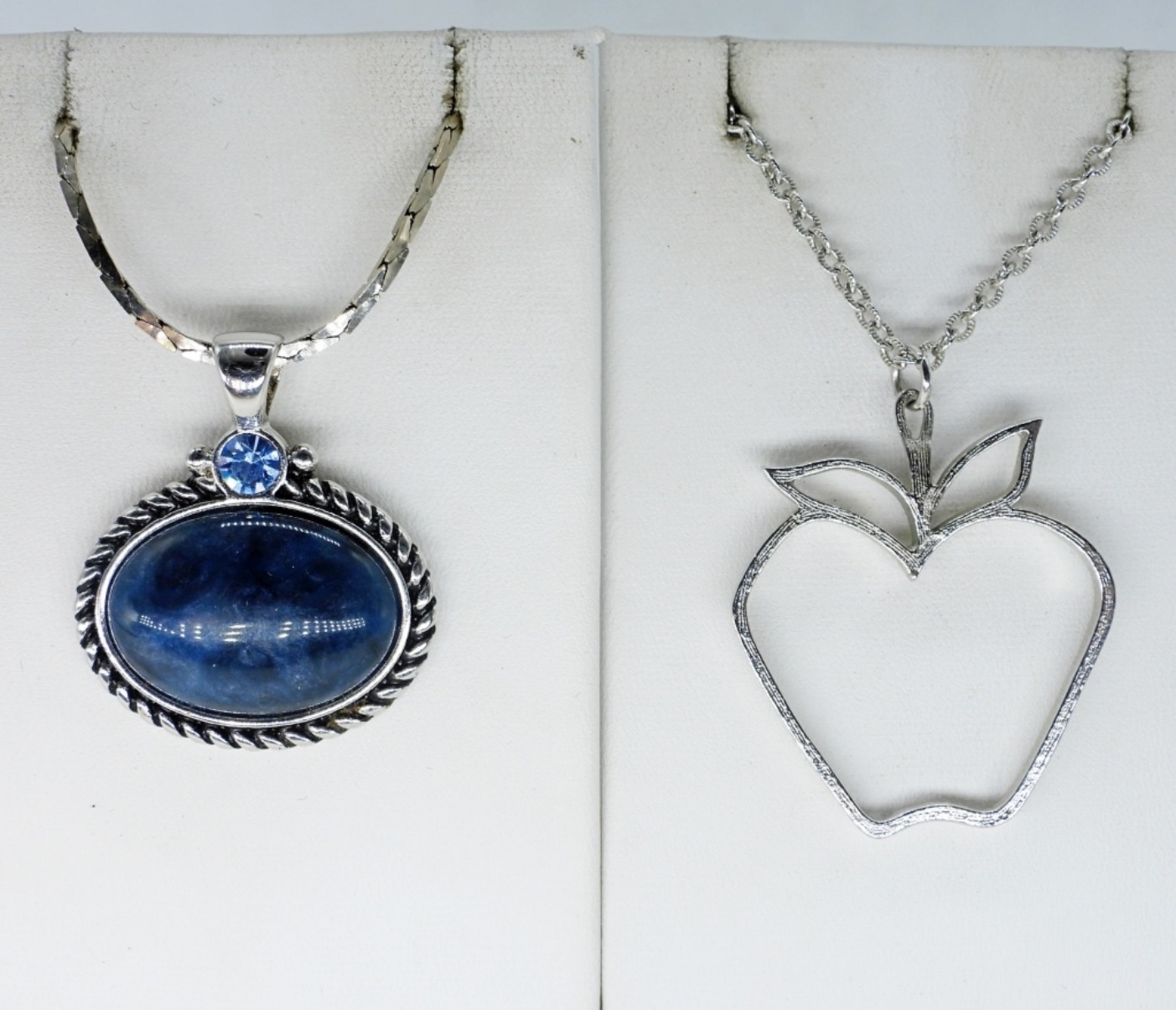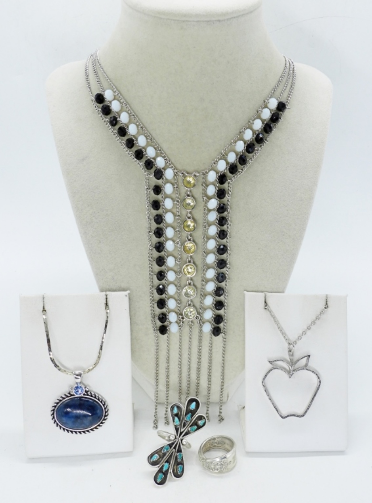 JESSICA SIMPSON 34″ FASHION NECKLACE. SARAH COVENTRY 18″ APPLE NECKLACE. LIA SOPHIA 22″ GEMSTONE NECKLACE. TWO RINGS, SIZES 6 & 7.