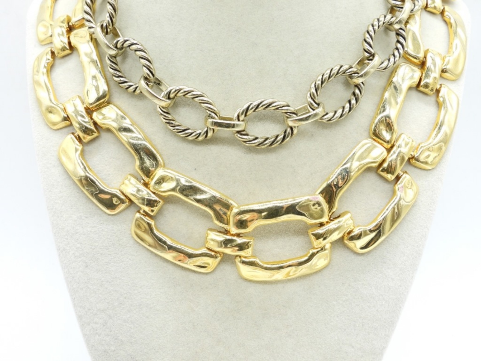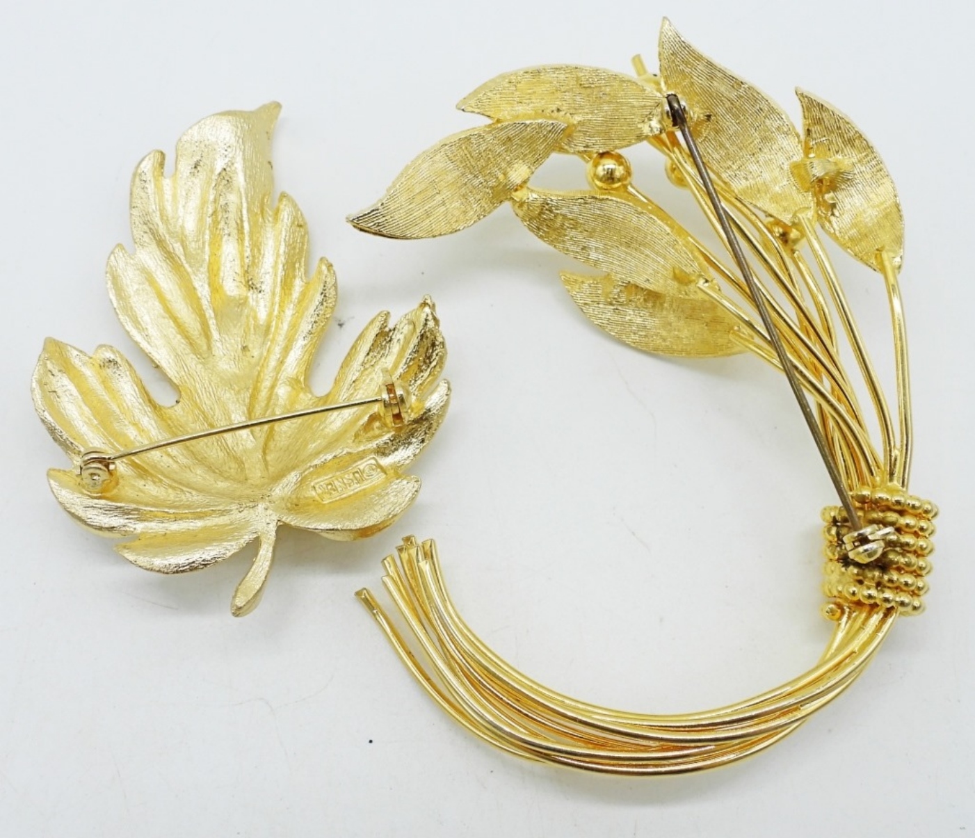 TWO BROOCHES, LISNER LEAF 3″, CALLA LILY 3″x3.5″. TWO GOLD TONE FASHION NECKLACES, 21″ & 24″. TWO GOLD TONE BRACELETS, HINGED & CUFF.