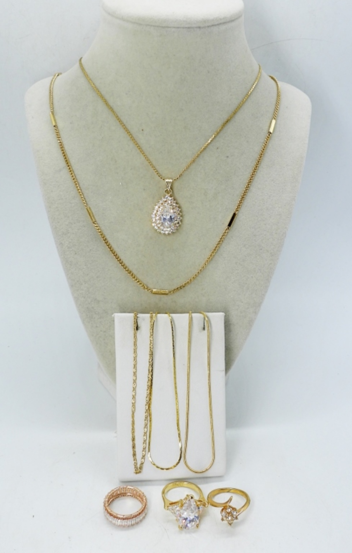FIVE NECKLACES, ALL GOLD TONE. ONE DIAMOND LIKE PENDANT. 18-32″. THREE GOLD TONE DIAMOND LIKE RINGS, SIZE 7 & 8