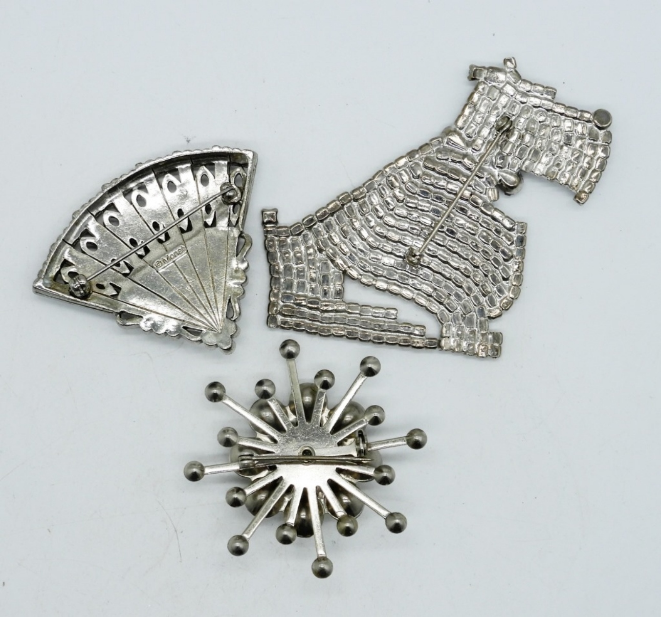 VINTAGE SCOTTY DOG RHINESTONE BROOCH, 3″ x 2″. TWO OTHER BROOCHES 2″