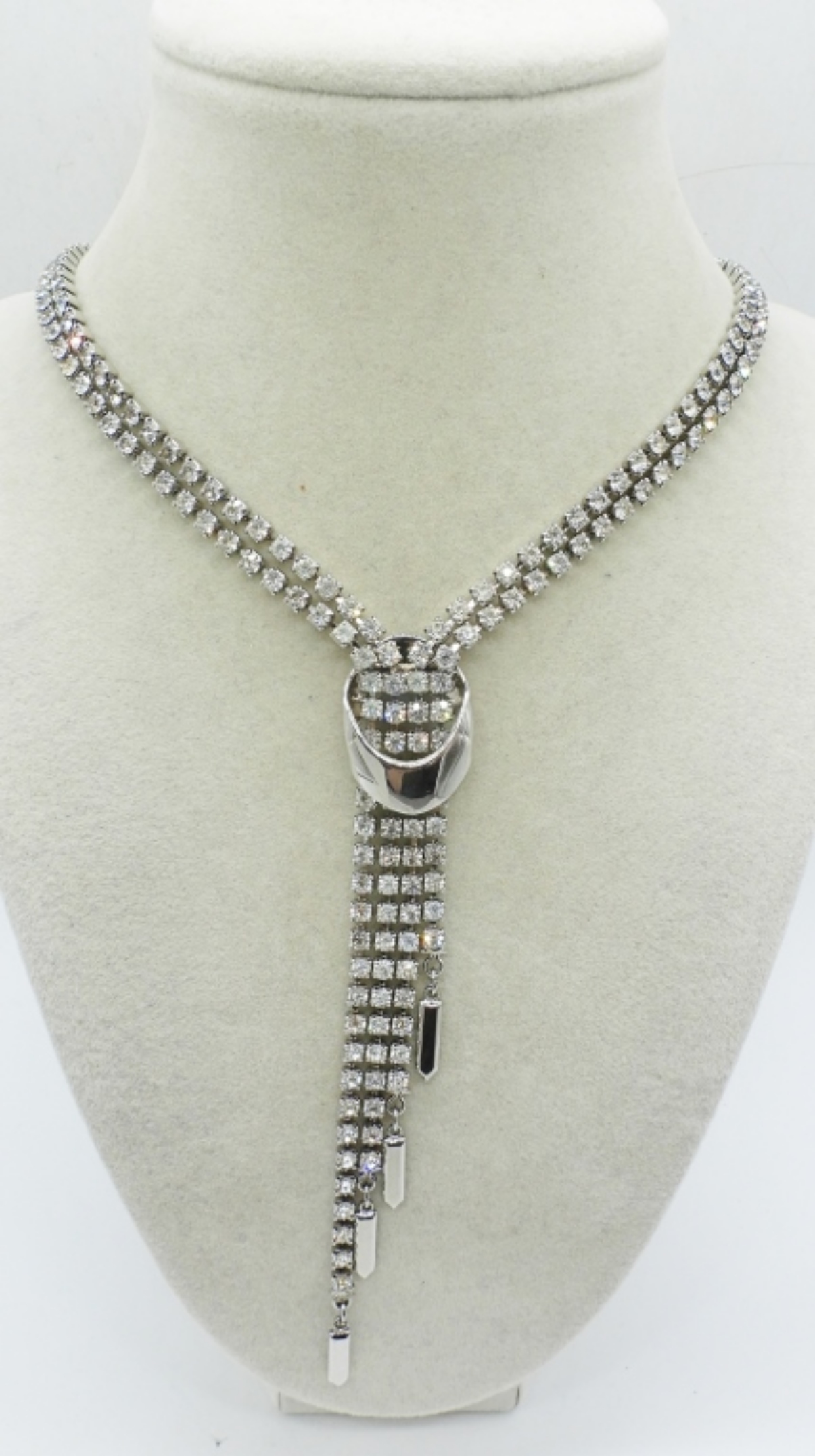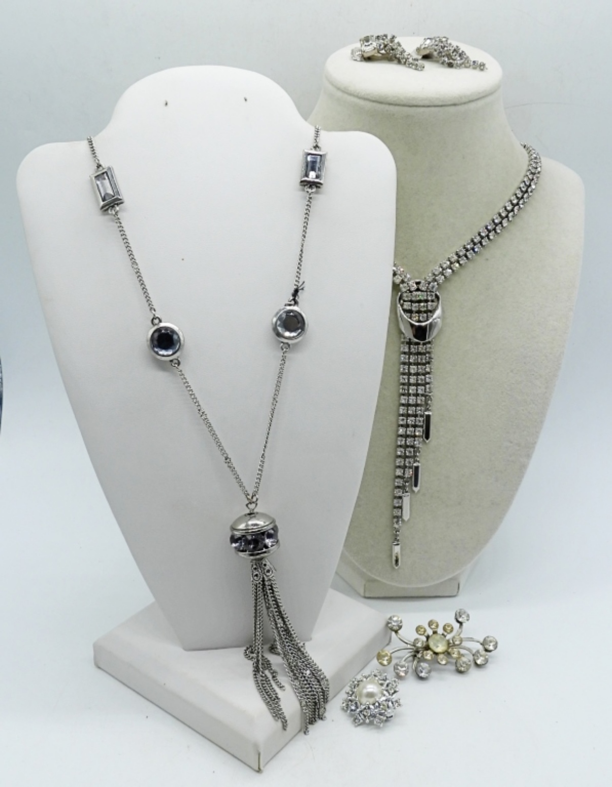 NECKLACES ARE 30″. VINTAGE RHINESTONE CLIP ON EARRINGS. TWO BROOCHES