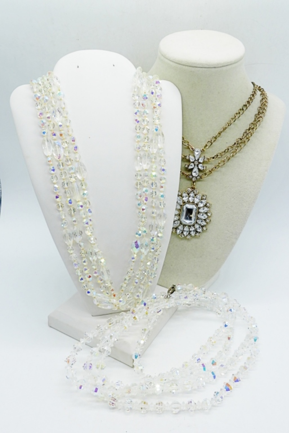 TWO VINTAGE LONG GLASS BEAD NECKLACES, 54″ & 52″. WHITE RHINESTONE CHAIN NECKLACE, 18″.