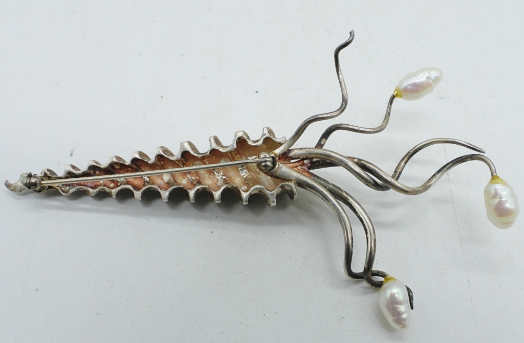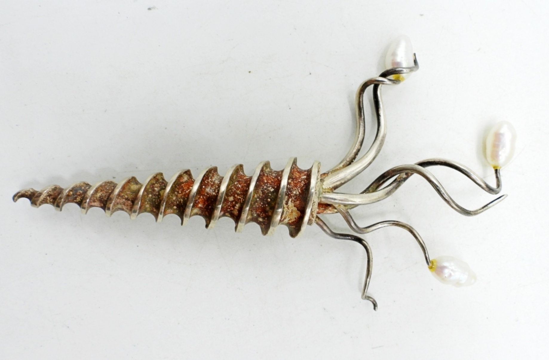 TWO NECKLACES, 18-20″. ONE BRACELET, 7″. SWEATER CLIP 7″. SILVER TONE, PEARL SPIRAL PIN, VERY SHARP!