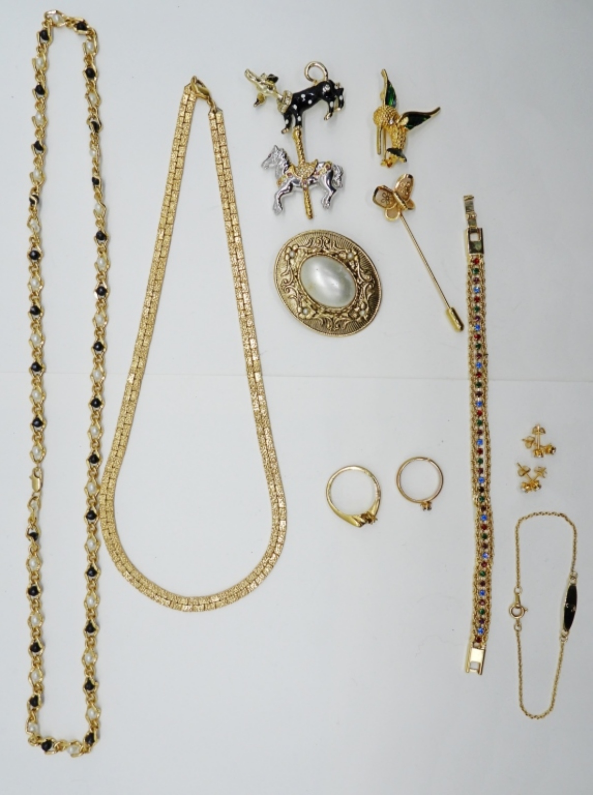 TWO NECKLACES, 18″ & 24″. TWO BRACELETS, 7-8″. TWO RINGS SIZES 6 & 8. 5 PINS. TWO PAIR EARRINGS