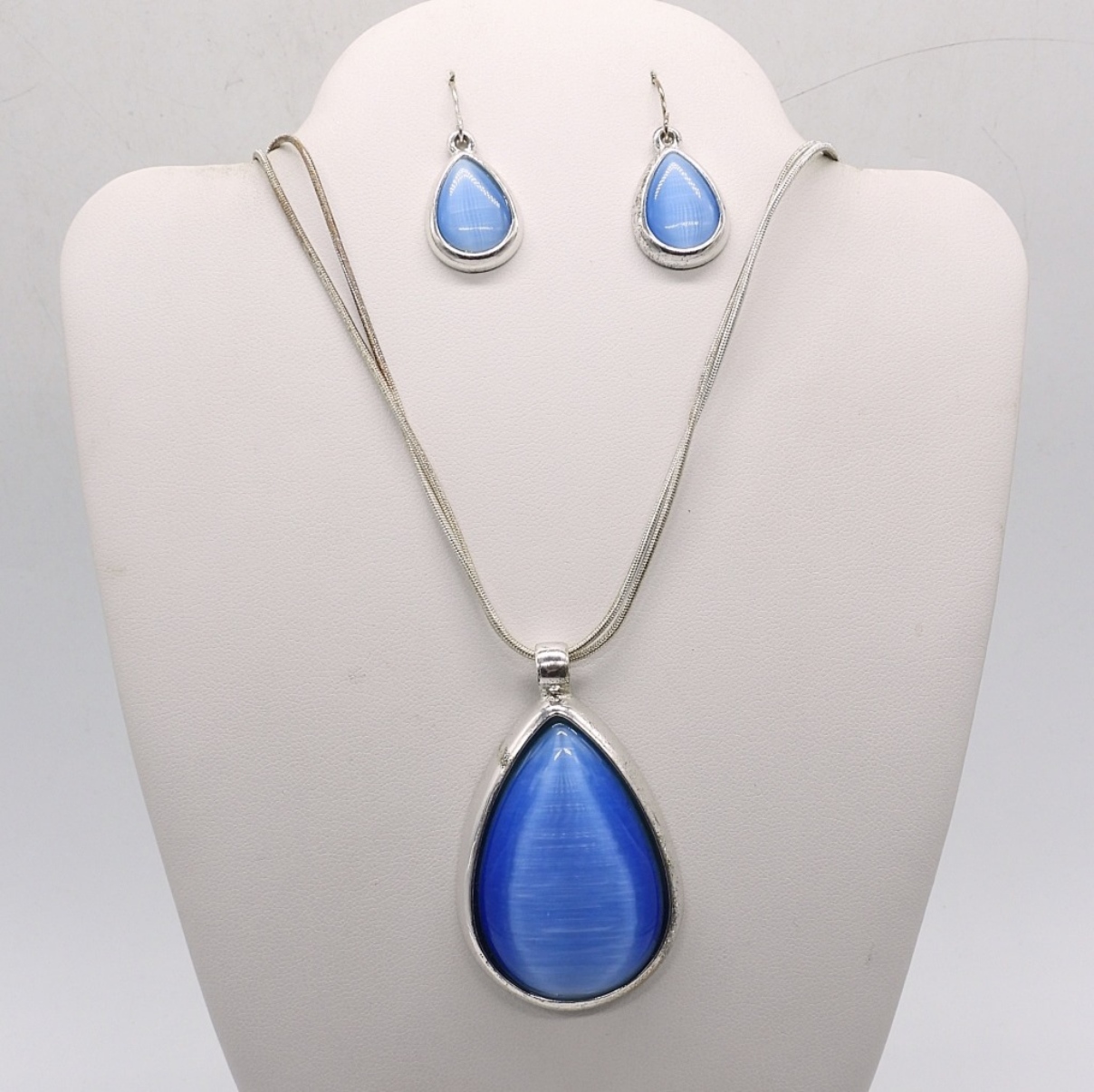 SILVER TONE, BLUE GEMSTONE NECKLACE 18″ & PIERCED EARRINGS.