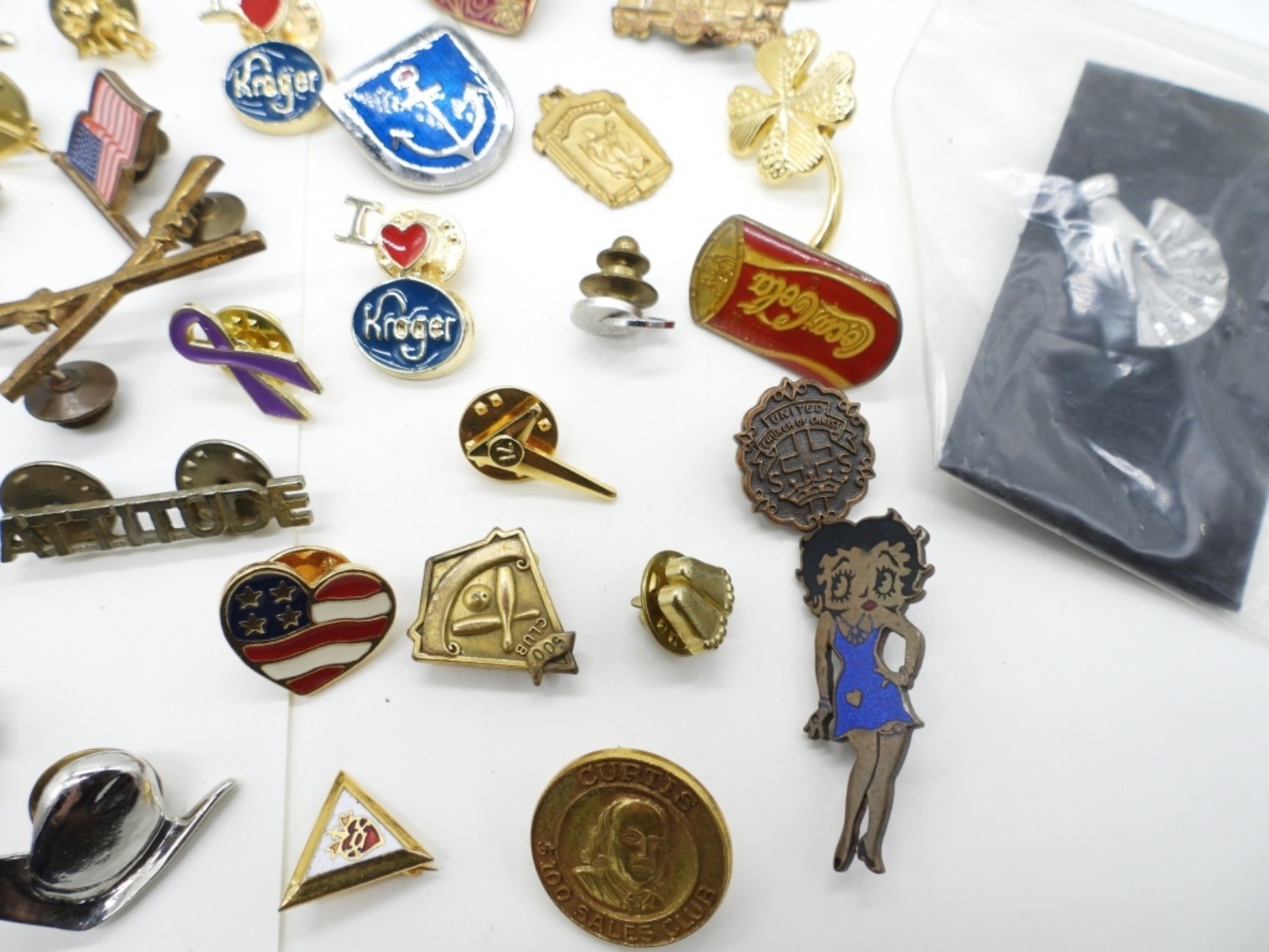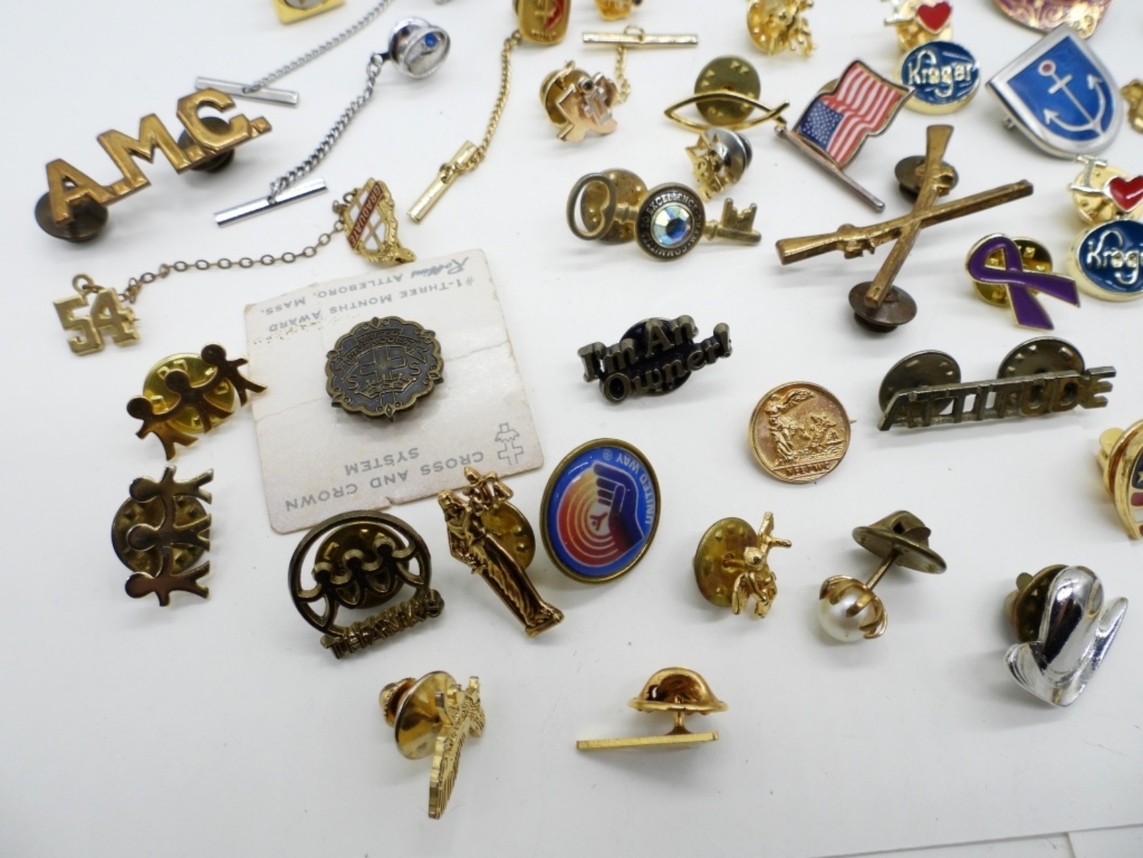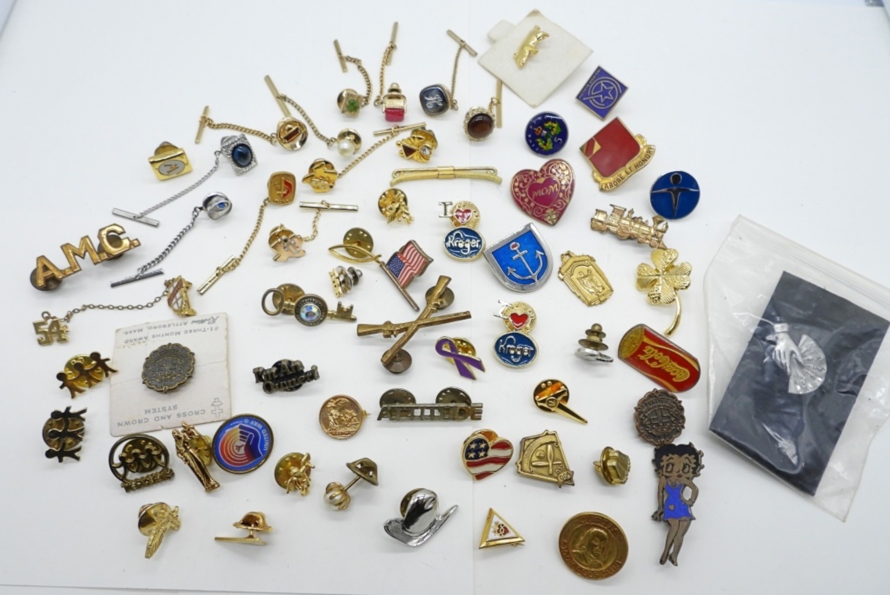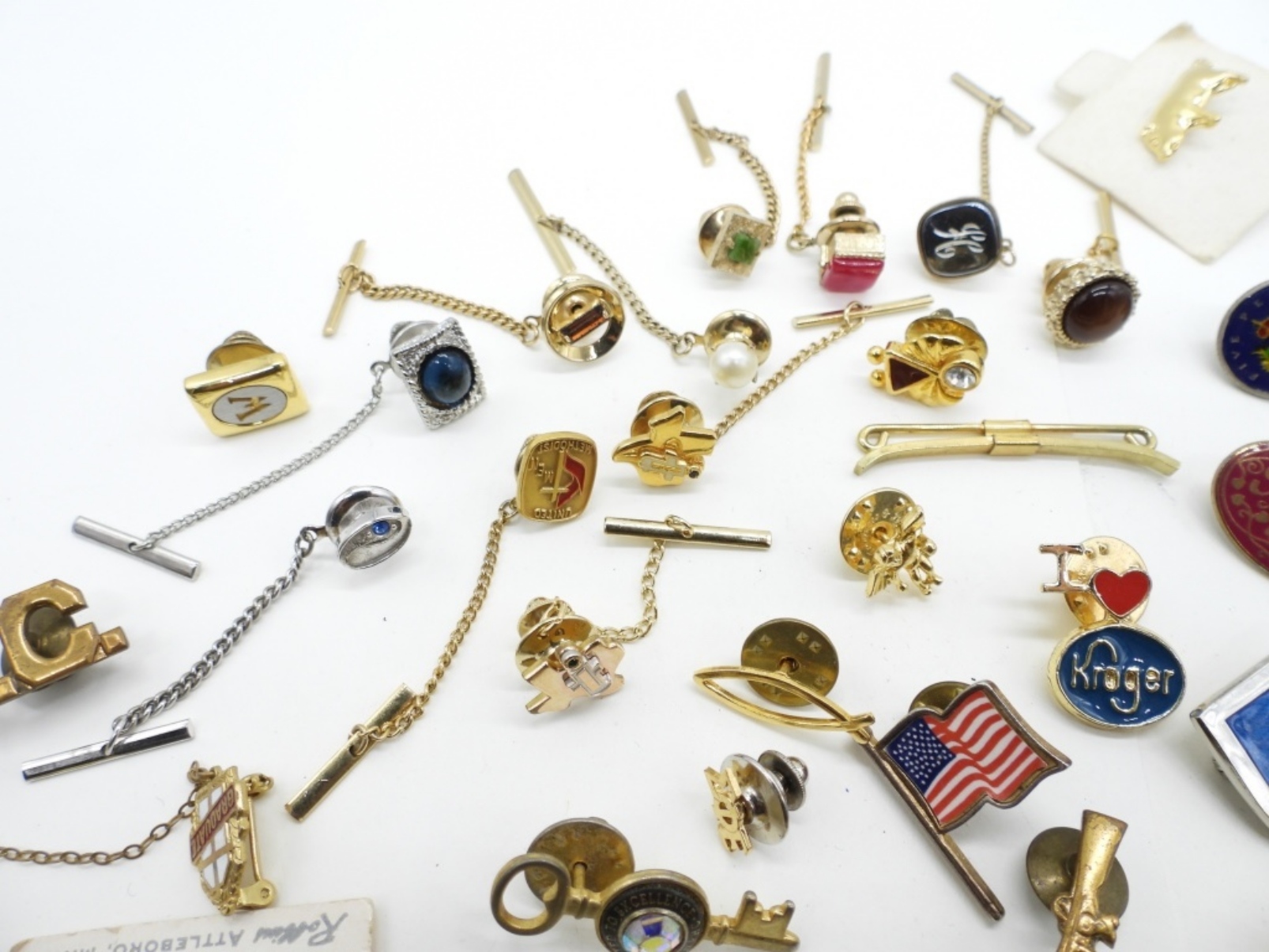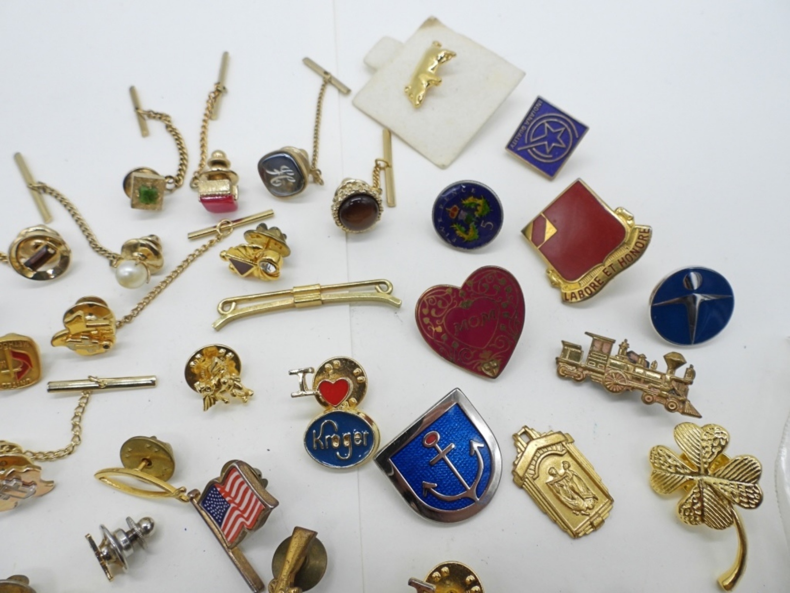 60 – GOLD AND SILVER TONE. ALL SORTS OF PINS AND TIE ACCESSORIES. 48 PINS, 12 TIE ACCESSORIES.