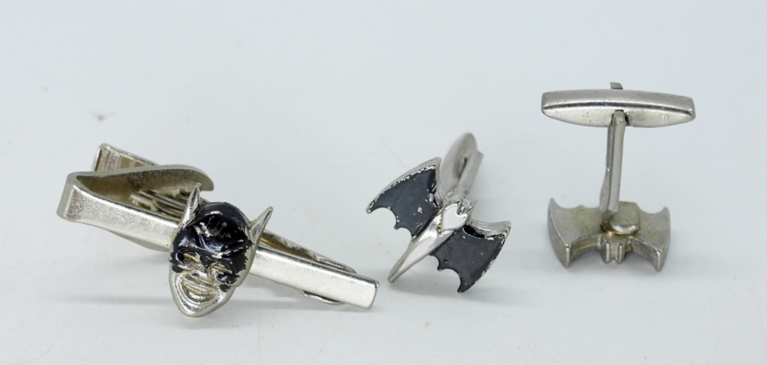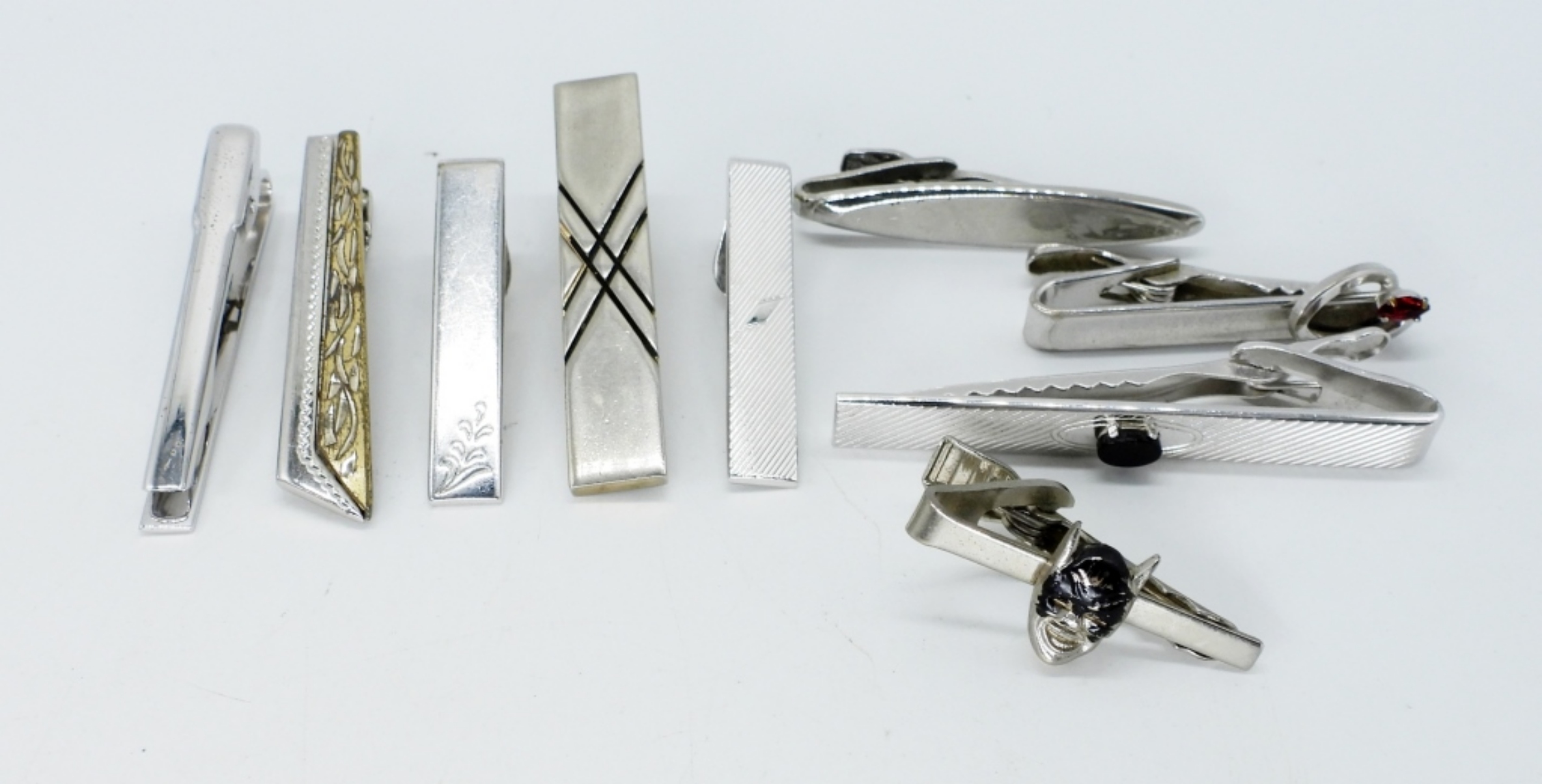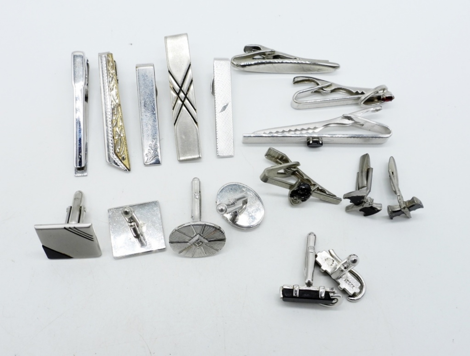 FOUR PAIR OF SILVERTONE CUFF LINKS. NINE TIE CLIPS.