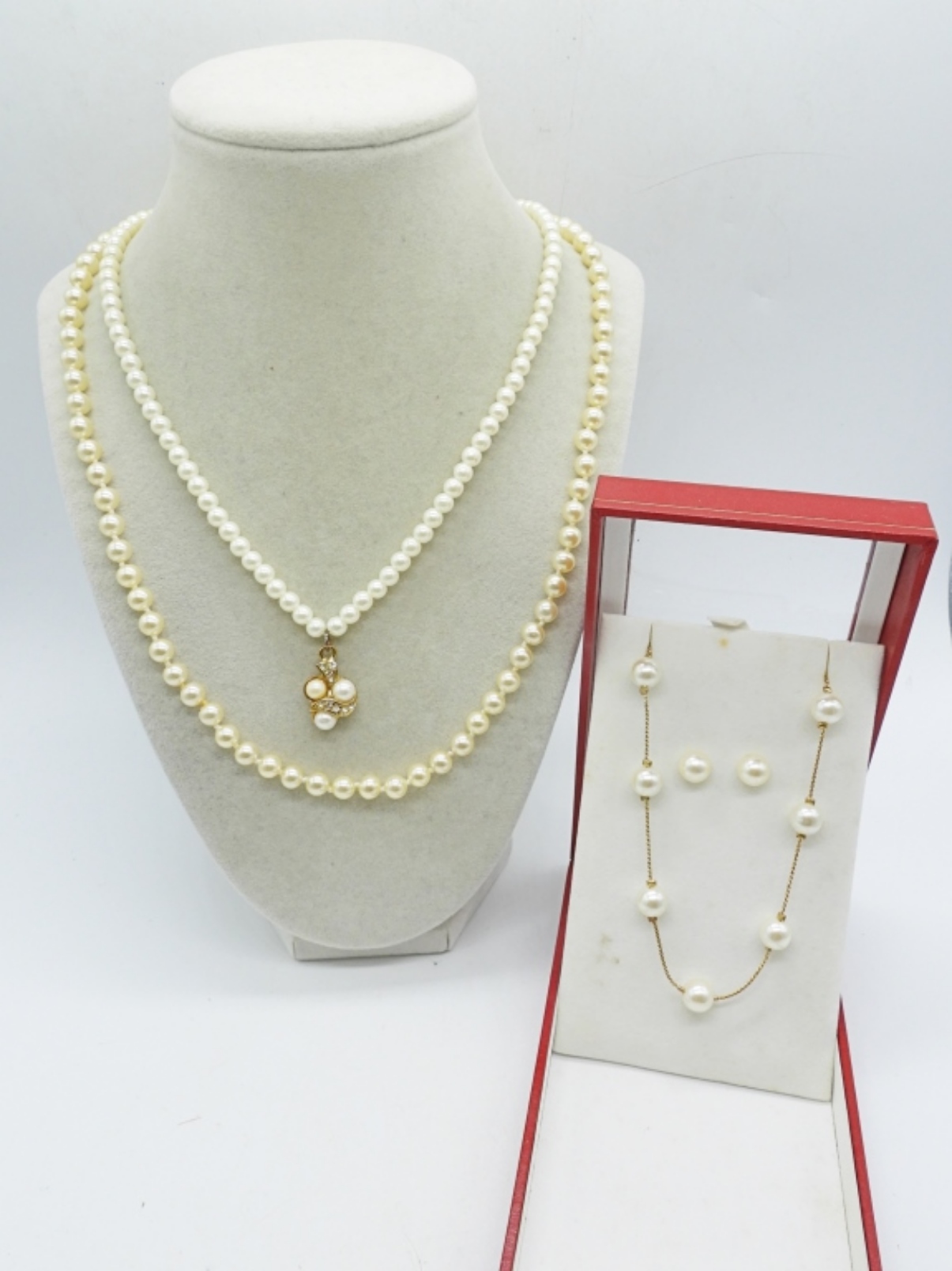 GOLD TONE PEARL NECKLACE WITH MATCHING PIERCED EARRINGS. 18″. TWO OTHER VTG PEARL NECKLACES, 18″ & 24″.