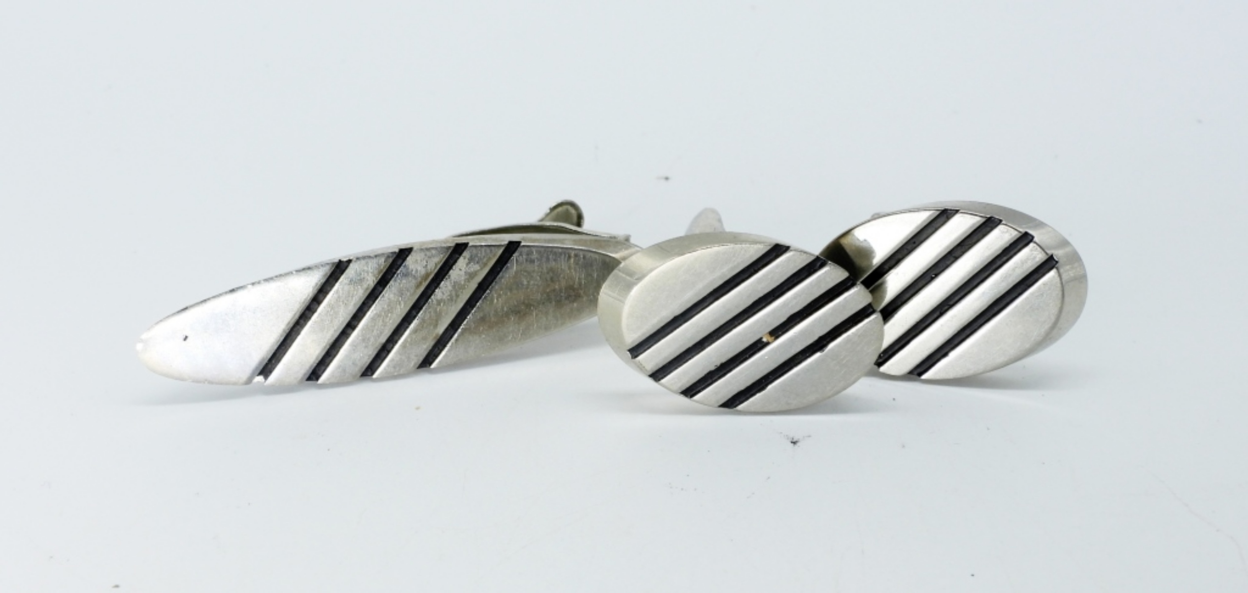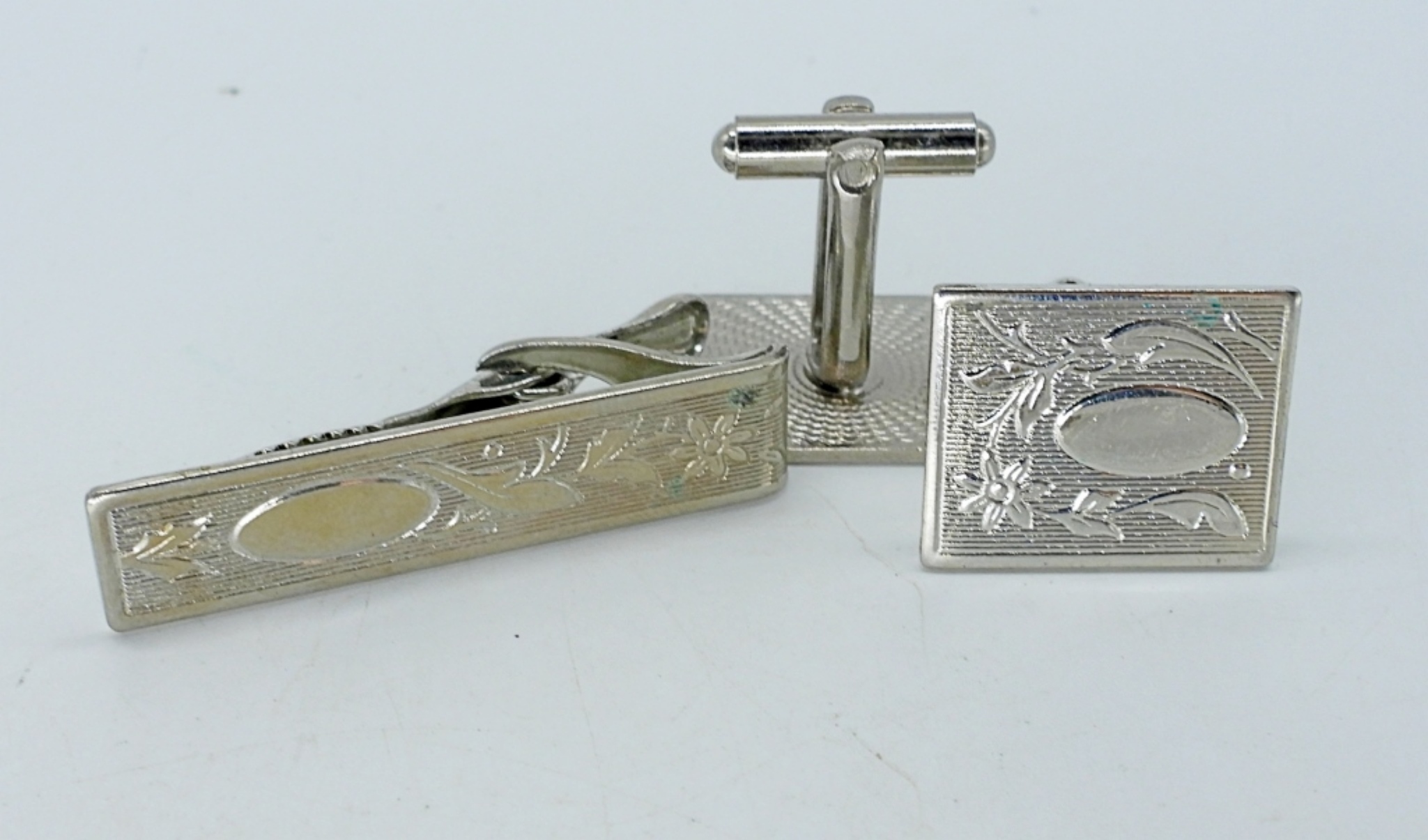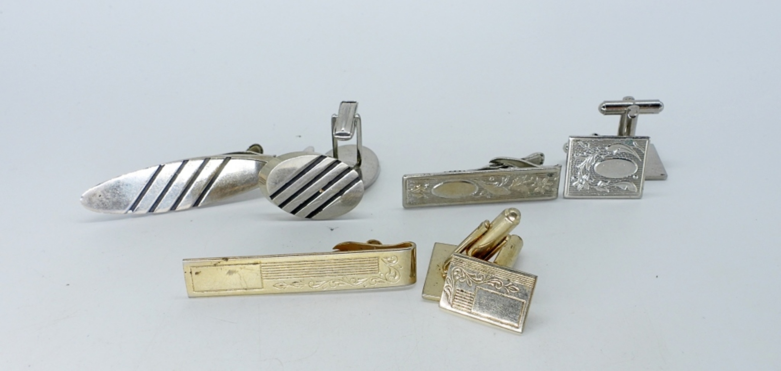 3 PAIR OF MATCHING SILVERTONE TIE CLIPS & CUFF LINKS. VINTAGE