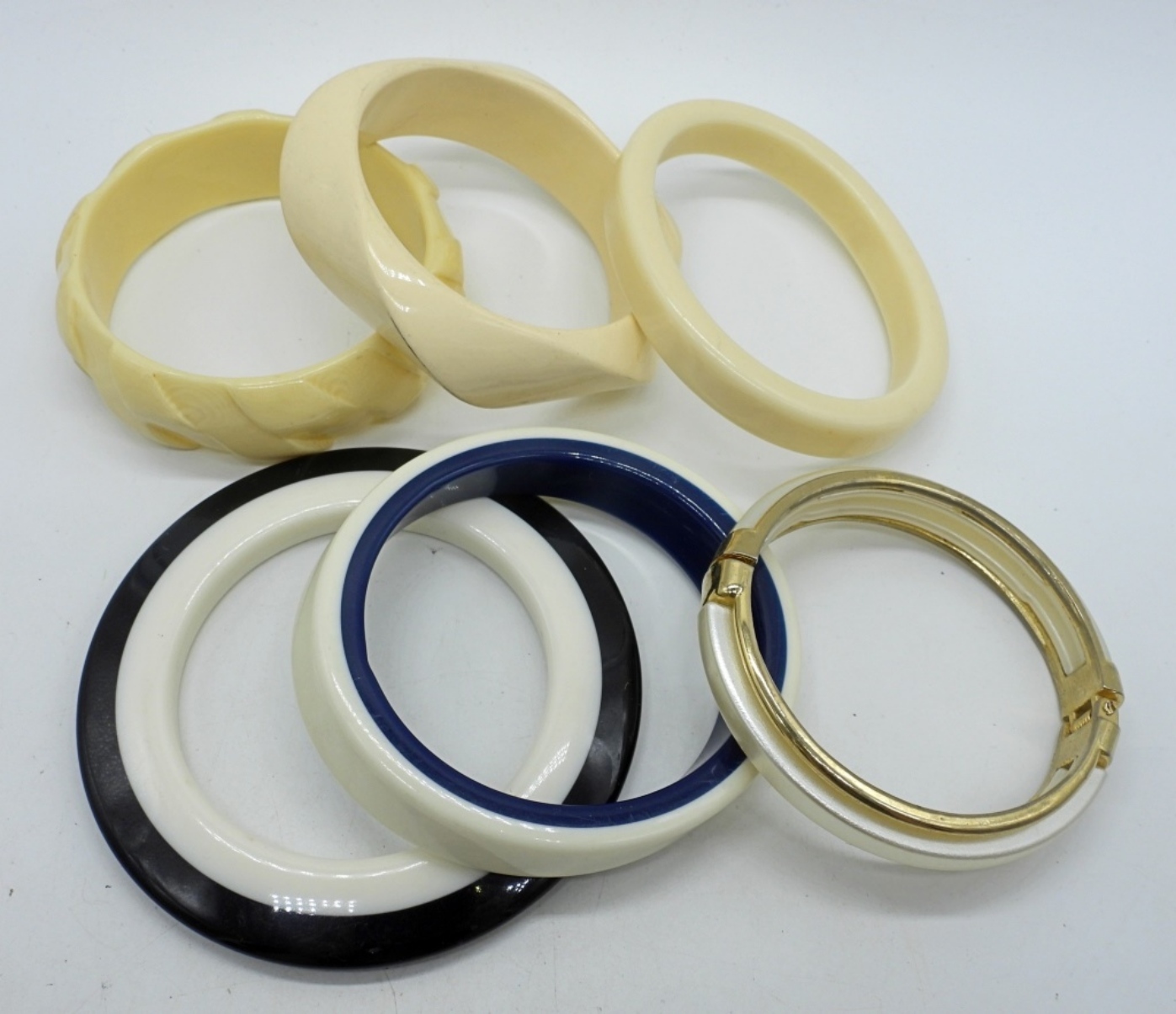 SIX VINTAGE PLASTIC BANGLE BRACELETS. 7-8″
