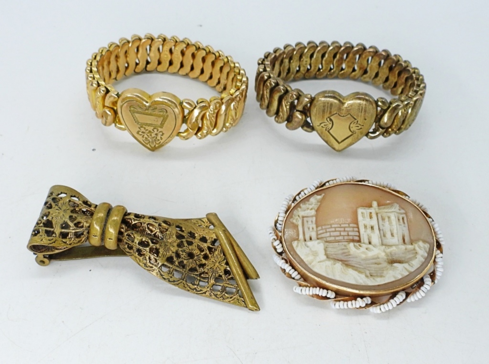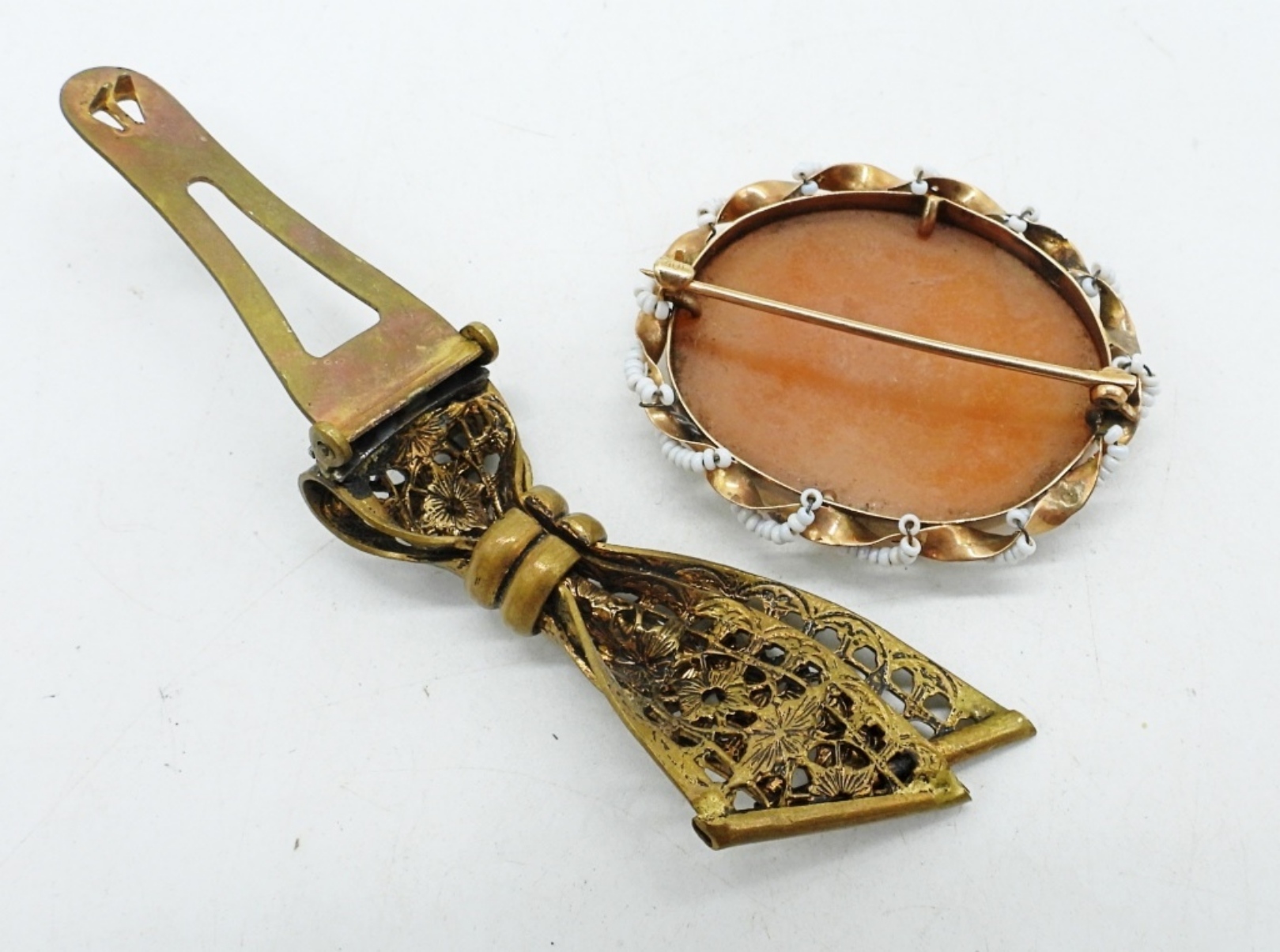 TWO GOLD TONE “AMERICAN QUEEN” BY PITMAN & KEELER (ADJUSTABLE). SEASIDE SCENE CAMEO PIN & VINTAGE CLIP.