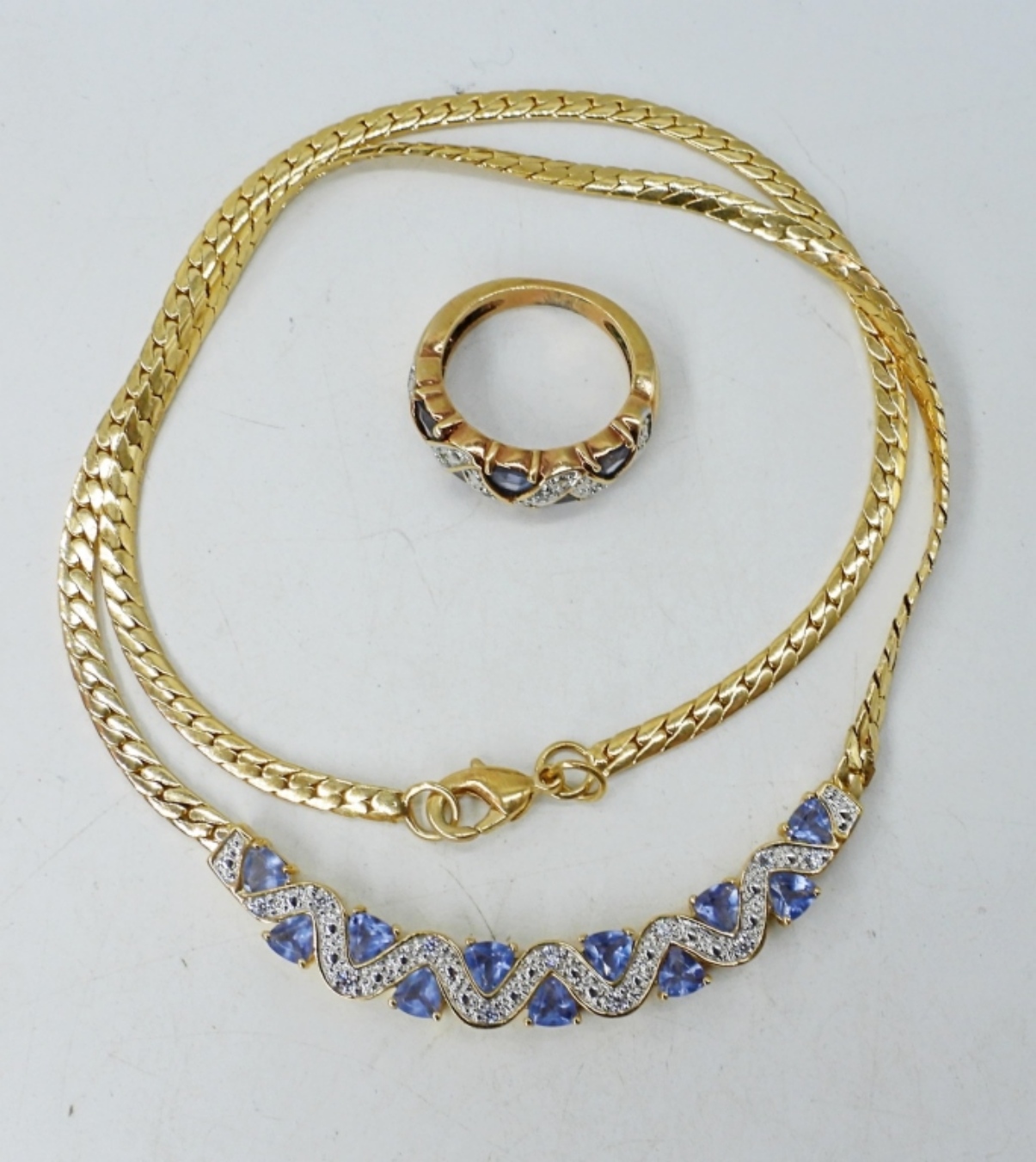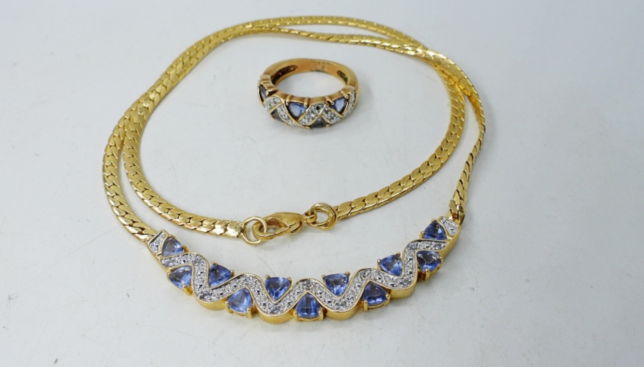 GOLD TONE NECKLACE & RING WITH SIMULATED DIAMOND AND TANZANITE. 18″ NECKLACE. RING SIZE 7