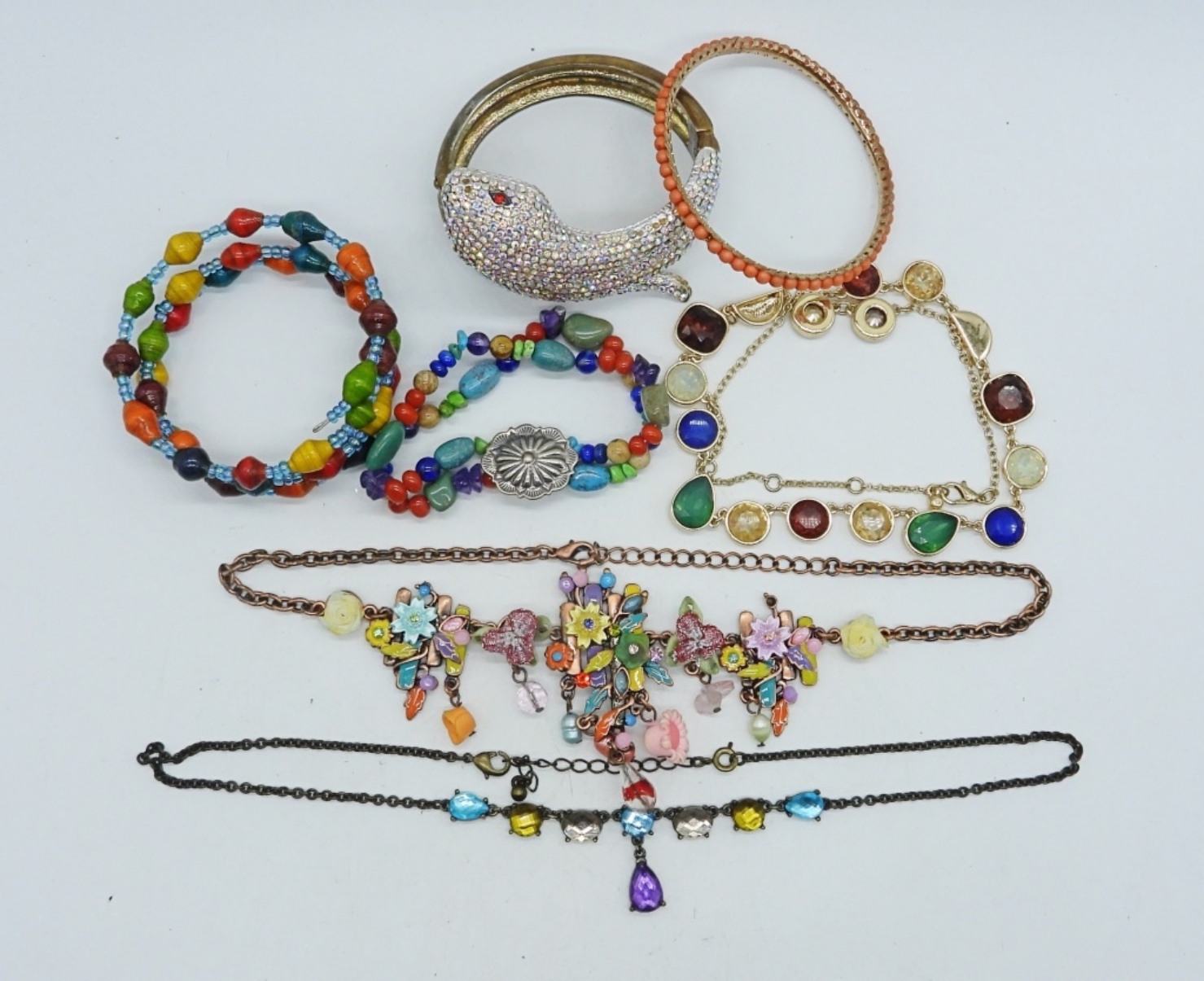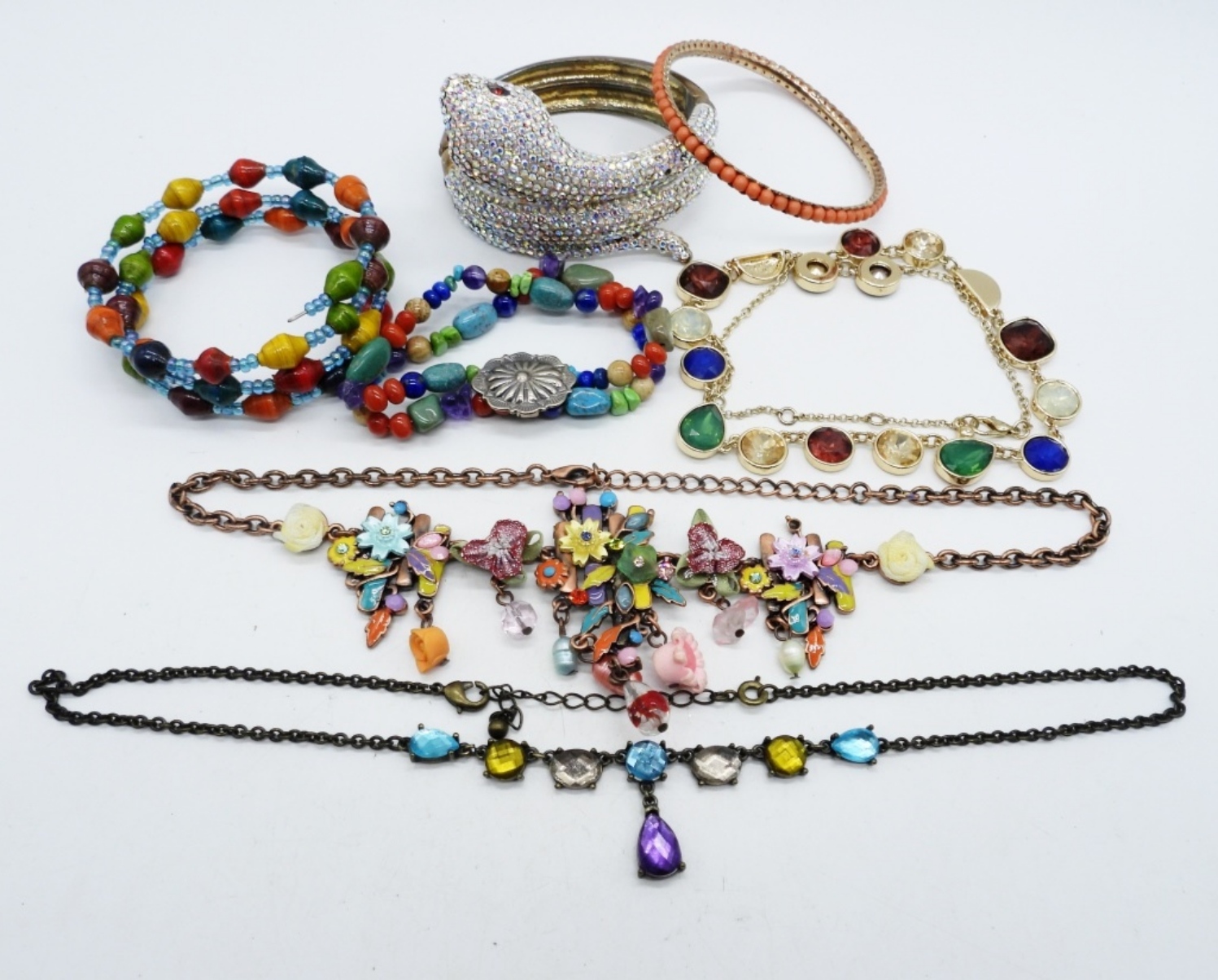 3 NECKLACES, 16-20″. FOUR BRACELETS, STRETCHY, ADJUSTABLE.
