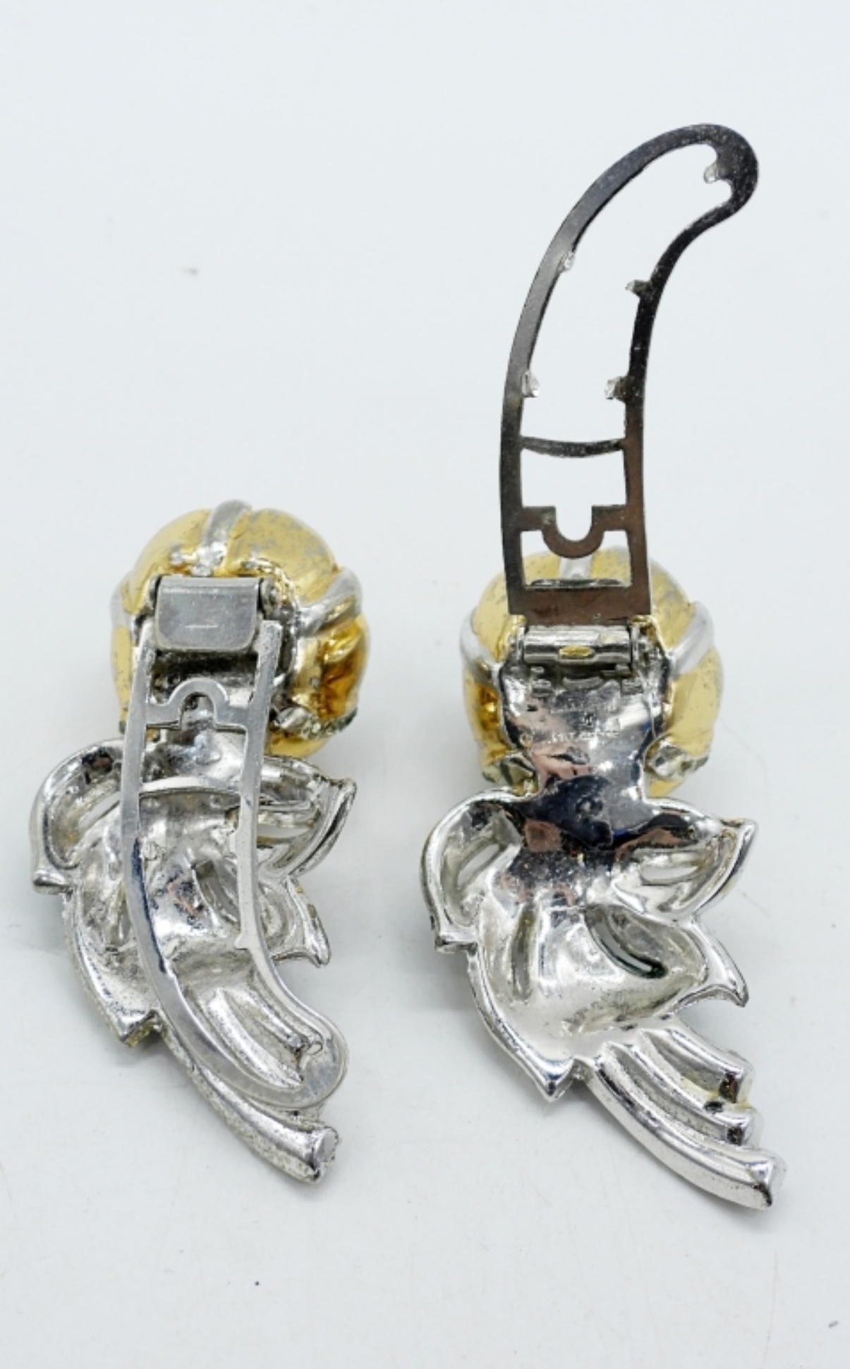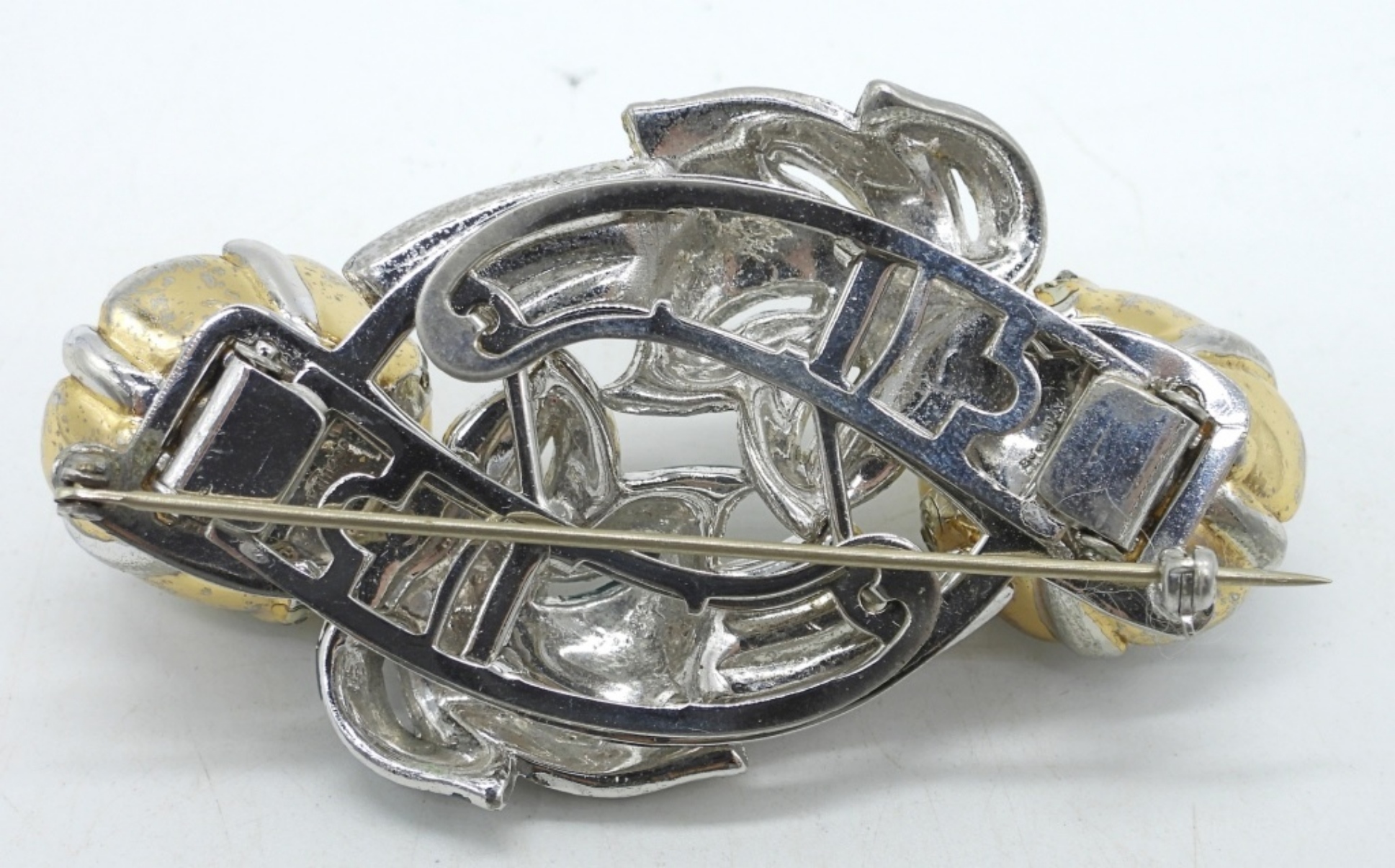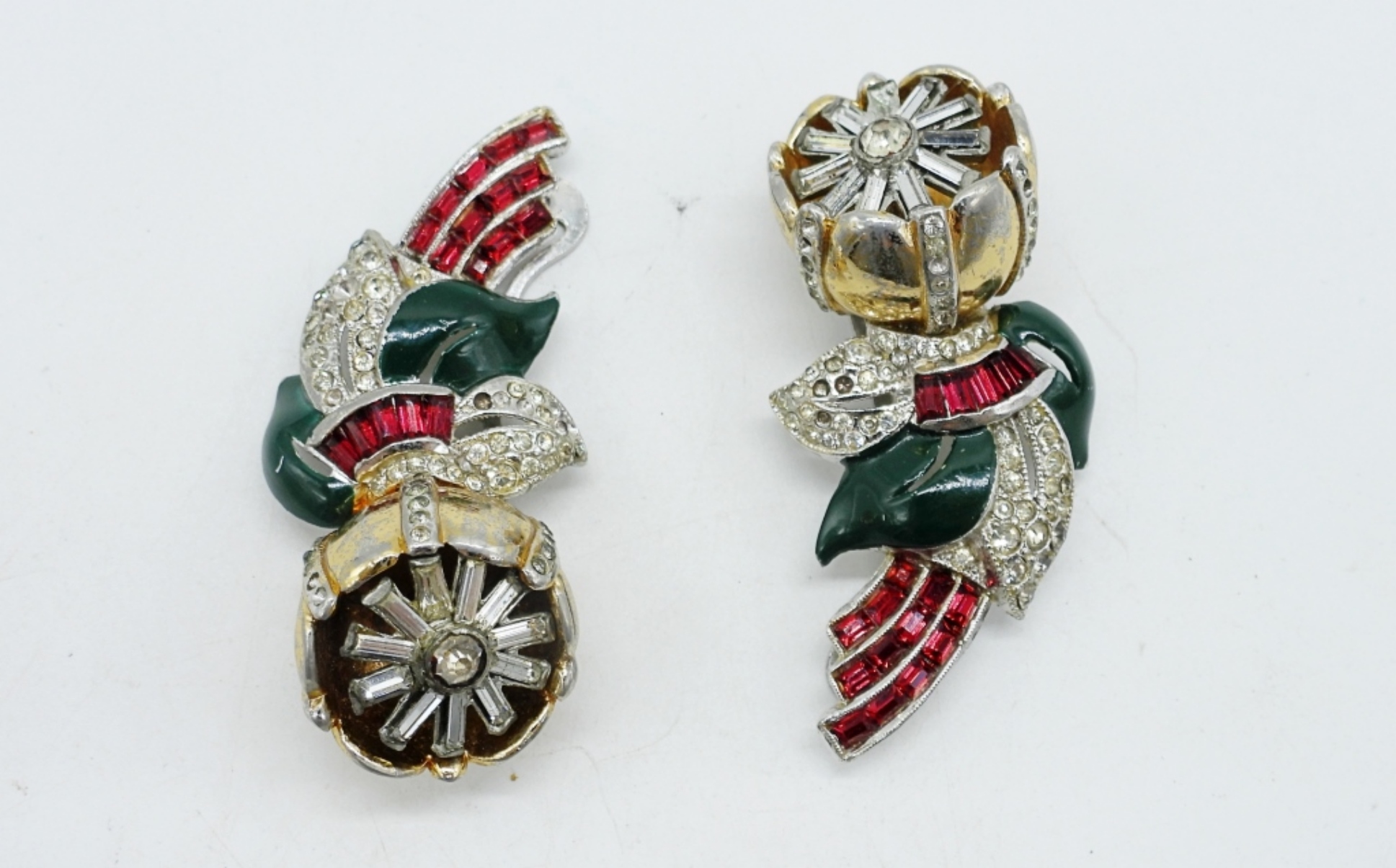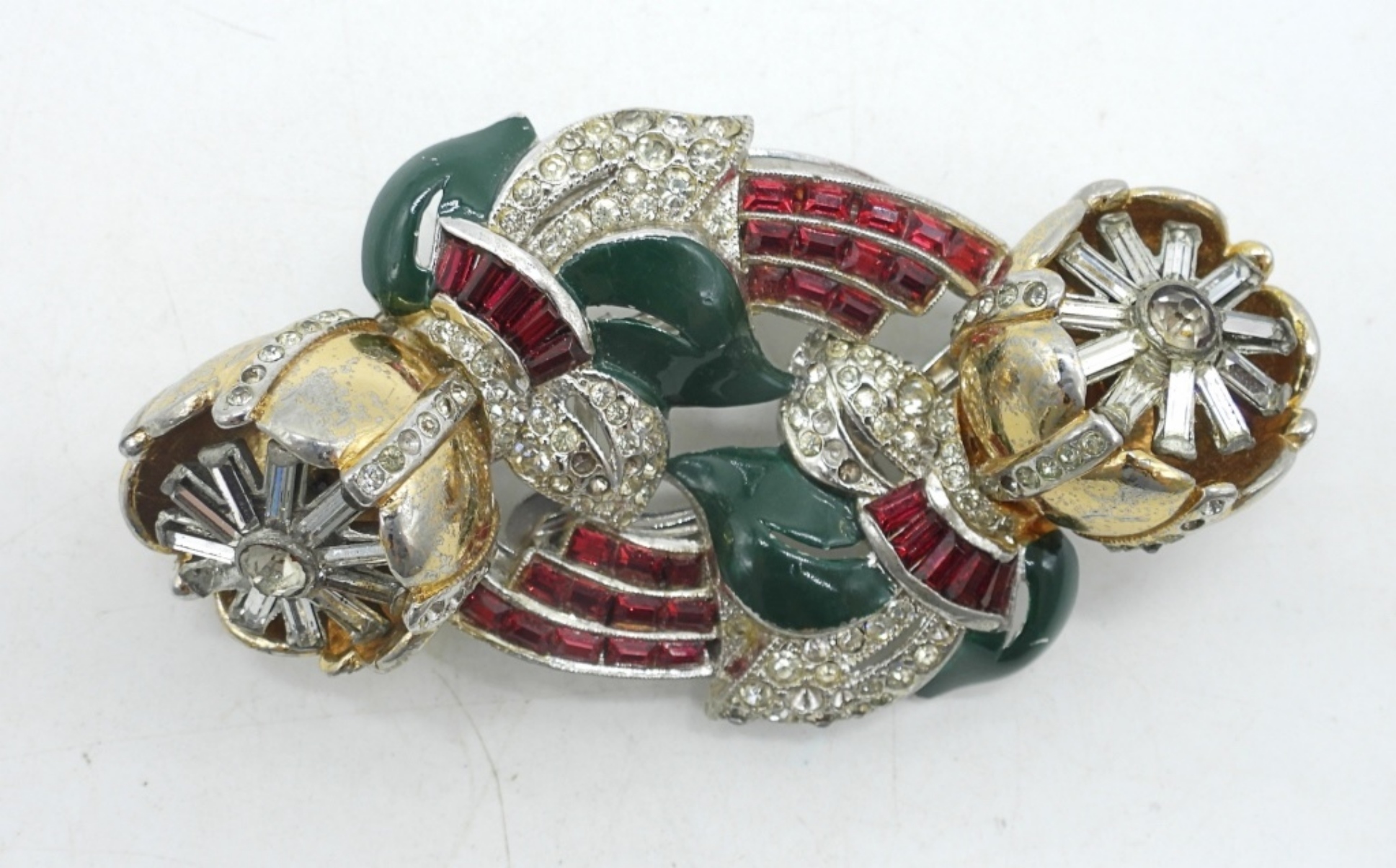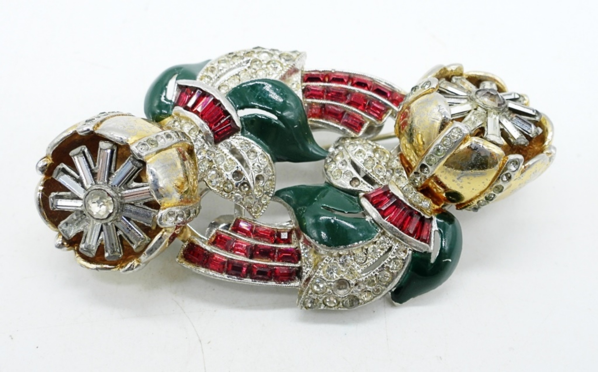 ANTIQUE CORO DUETTE “QUIVERING CAMELIA” COMBO BROOCH DRESS CLIP. RED RHINESTONES, GREEN ENAMEL. MISSING A FEW SMALL WHITE RHINESTONES. IN REALLY GOOD CONDITION! 3″ WIDE WHEN PUT ALL TOGETHER. PIN CLASP IS HARD
