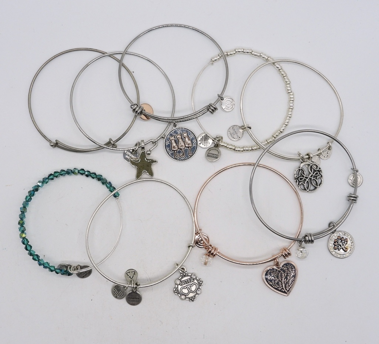NINE BRACELETS, FOUR ALEX & ANI. FIVE OTHER BRAND BUT SIMILAR BRACELETS.