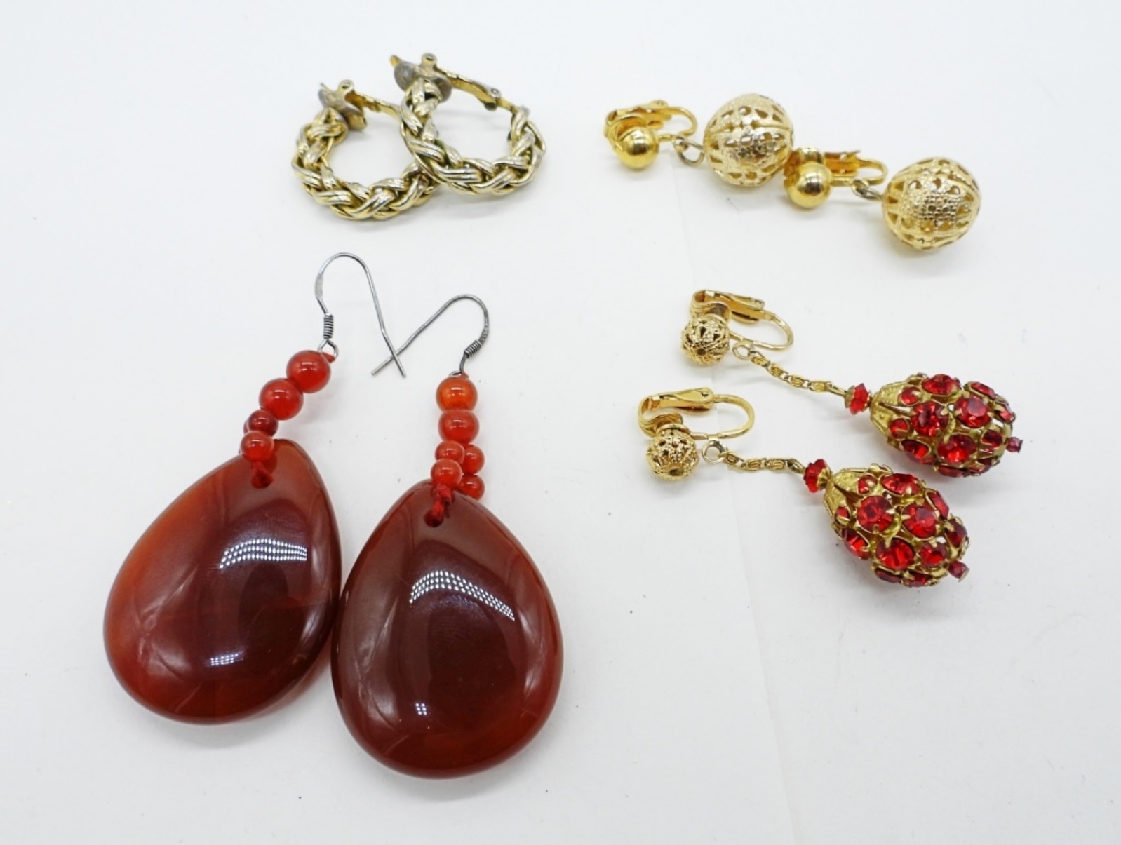 LARGE CARNELIAN DROP PIERCED EARRINGS, 3″ LONG. VINTAGE RED RHINESTONE, GOLD TONE CLIP ON EARRINGS. TWO PAIR OF VINTAGE CLIP ON GOLD TONE EARRINGS.