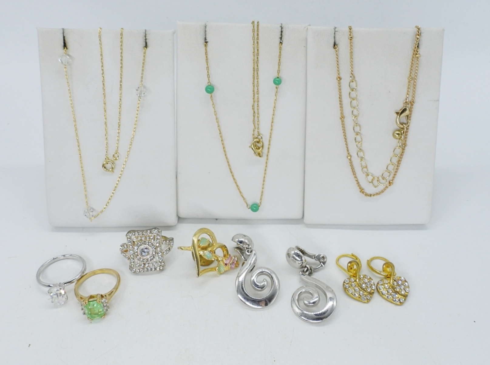3 GOLD TONE NECKLACES, 16, 18 & 24″. 3 RINGS, SIZES 5 & 7. 2 PAIR OF PIERCED EARRINGS. ONE HEART PIN.