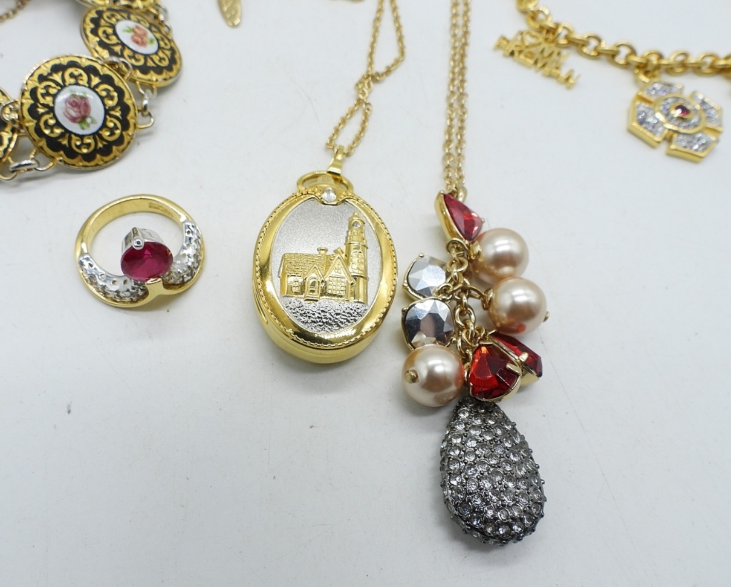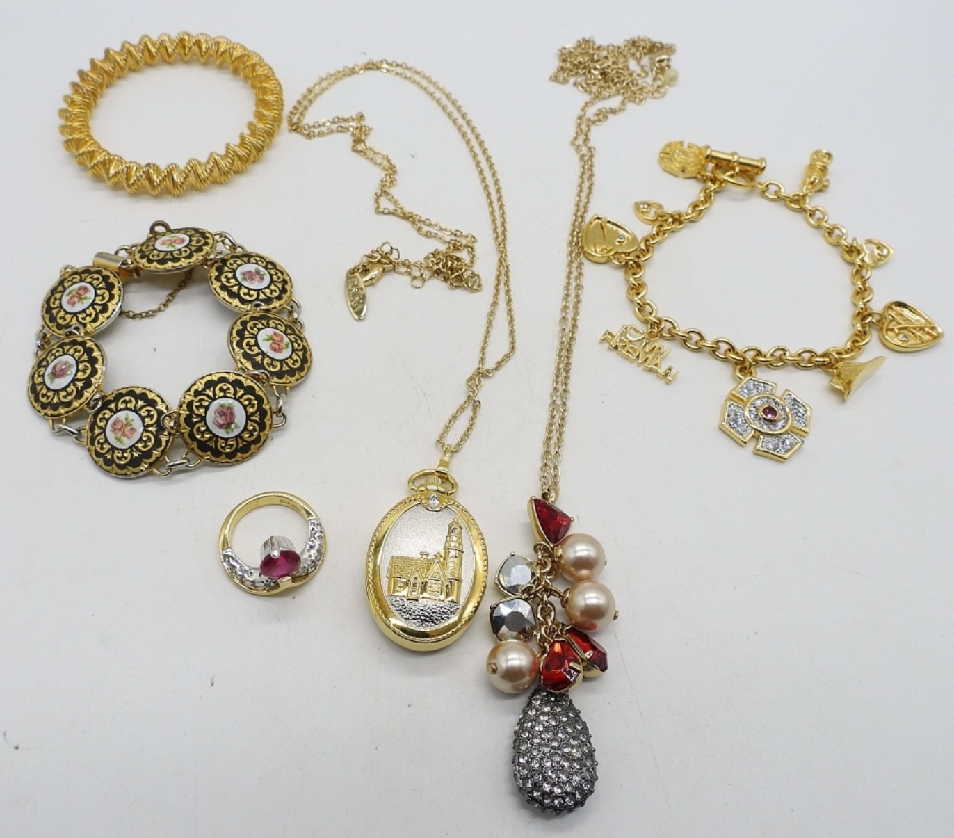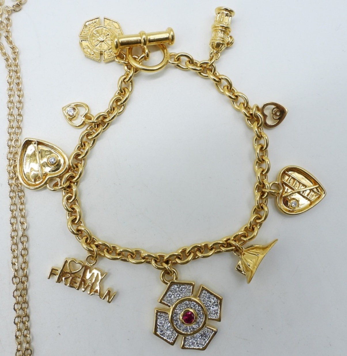 TWO NECKLACES (ONE IS A WATCH), 34″. RING SIZE 6. THREE BRACELETS. FIREMAN CHARM – 8″. A STRETCHY AND A DAMASCENE 7″.