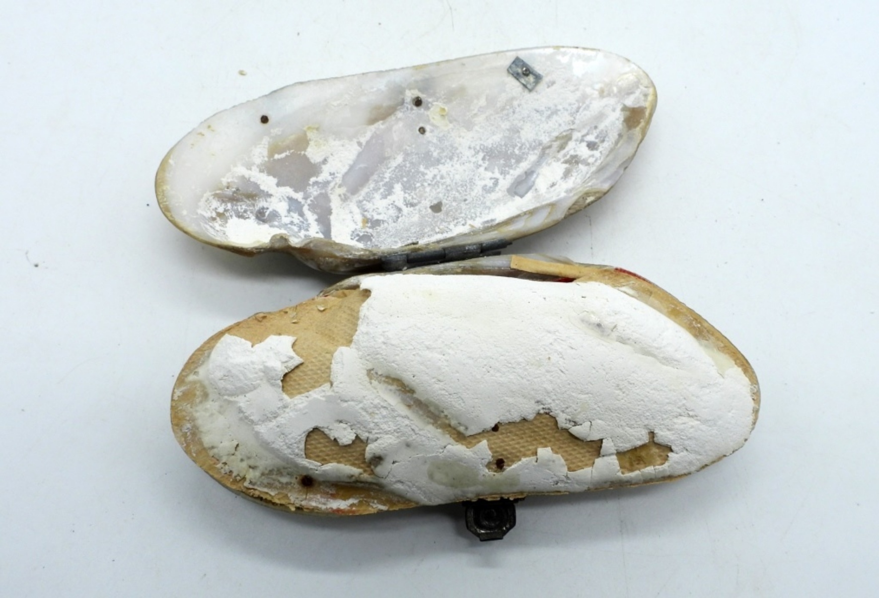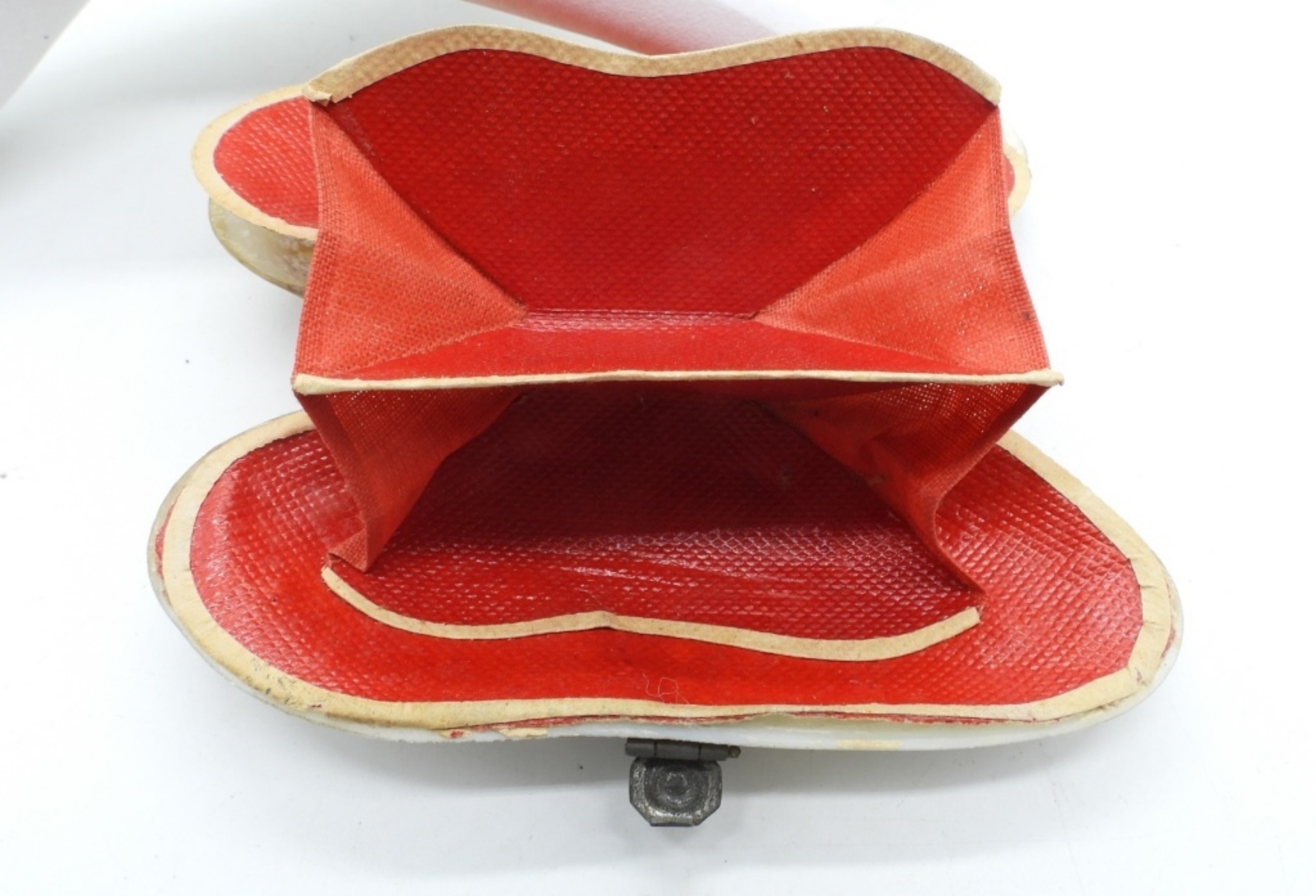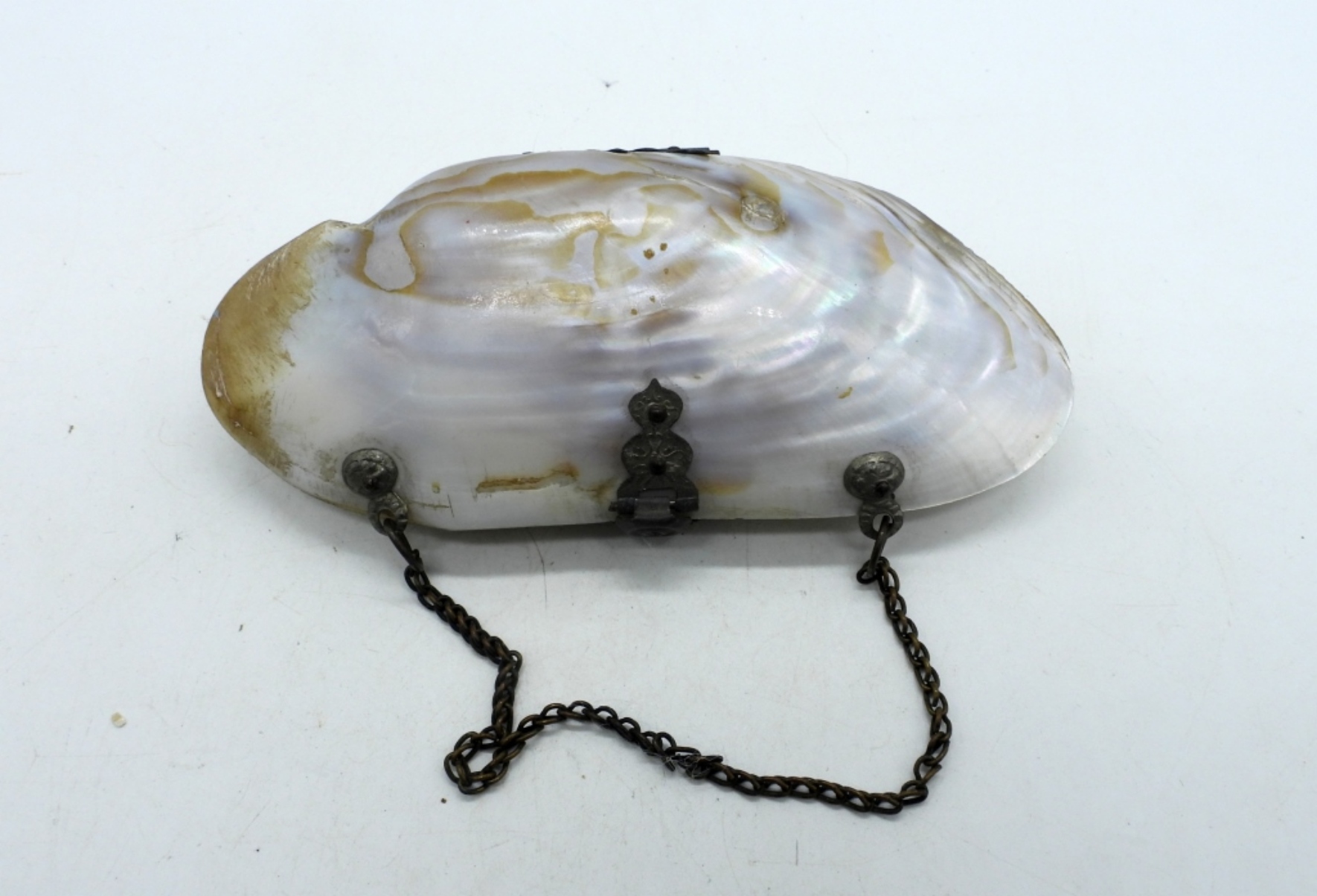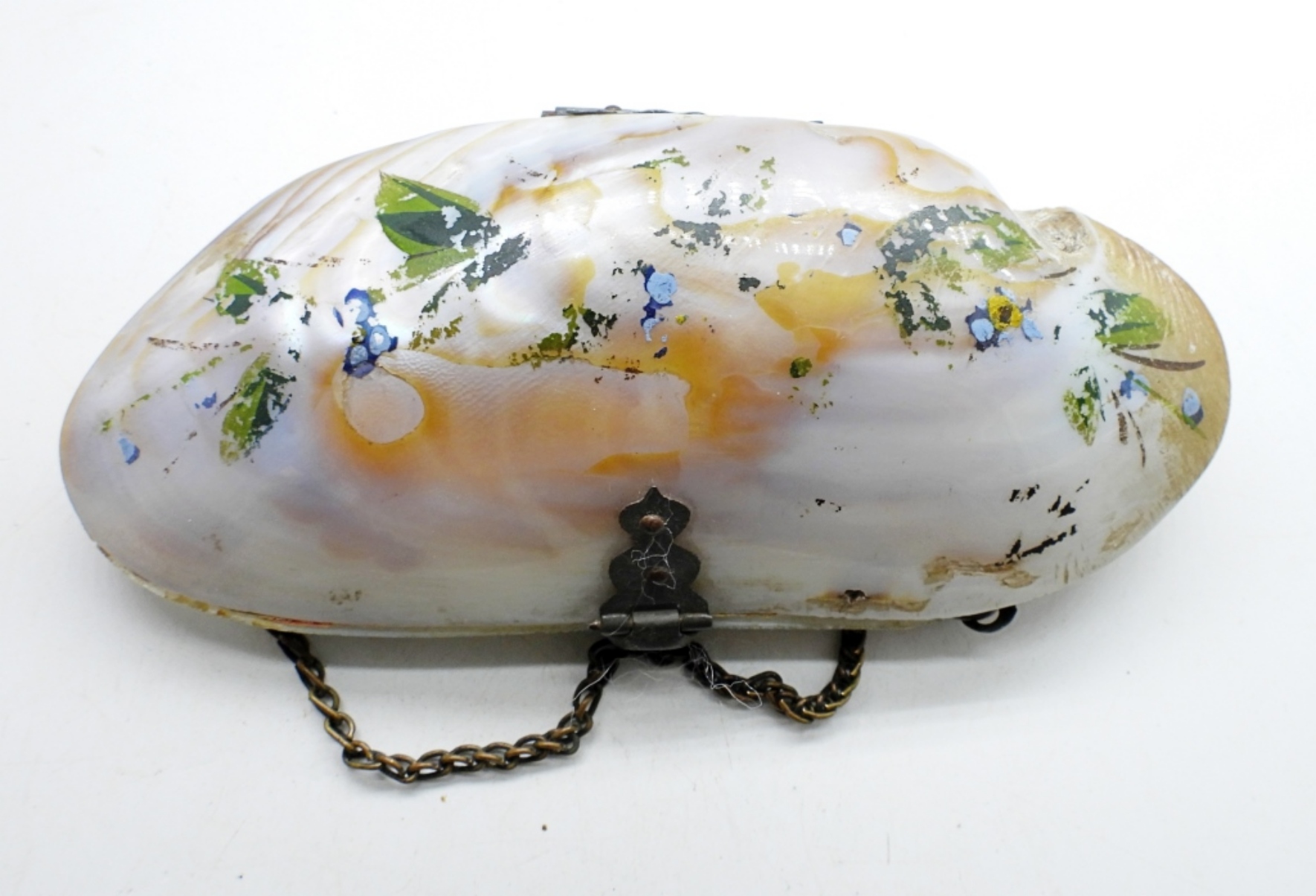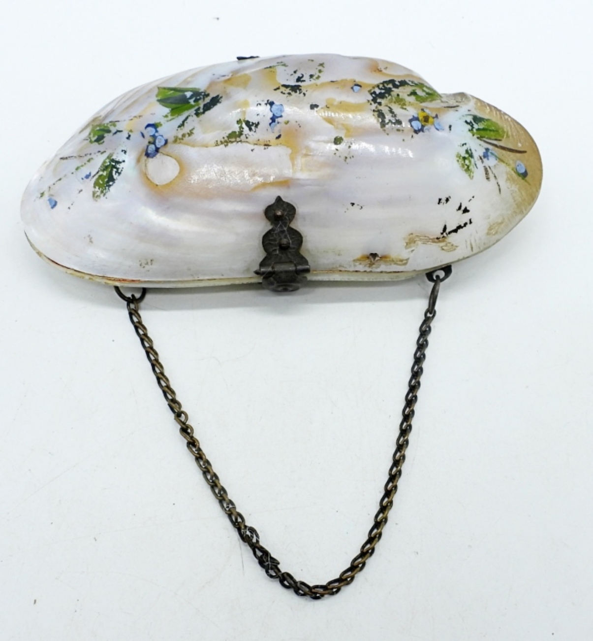 ANTIQUE CLAM SHELL COIN PURSE. POSSIBLY VICTORIAN. FADED / CHIPPED PAINTED DESIGN. THE INSIDE GLUE IS COMING LOOSE. 4.5″ WIDE, 3″ LONG.