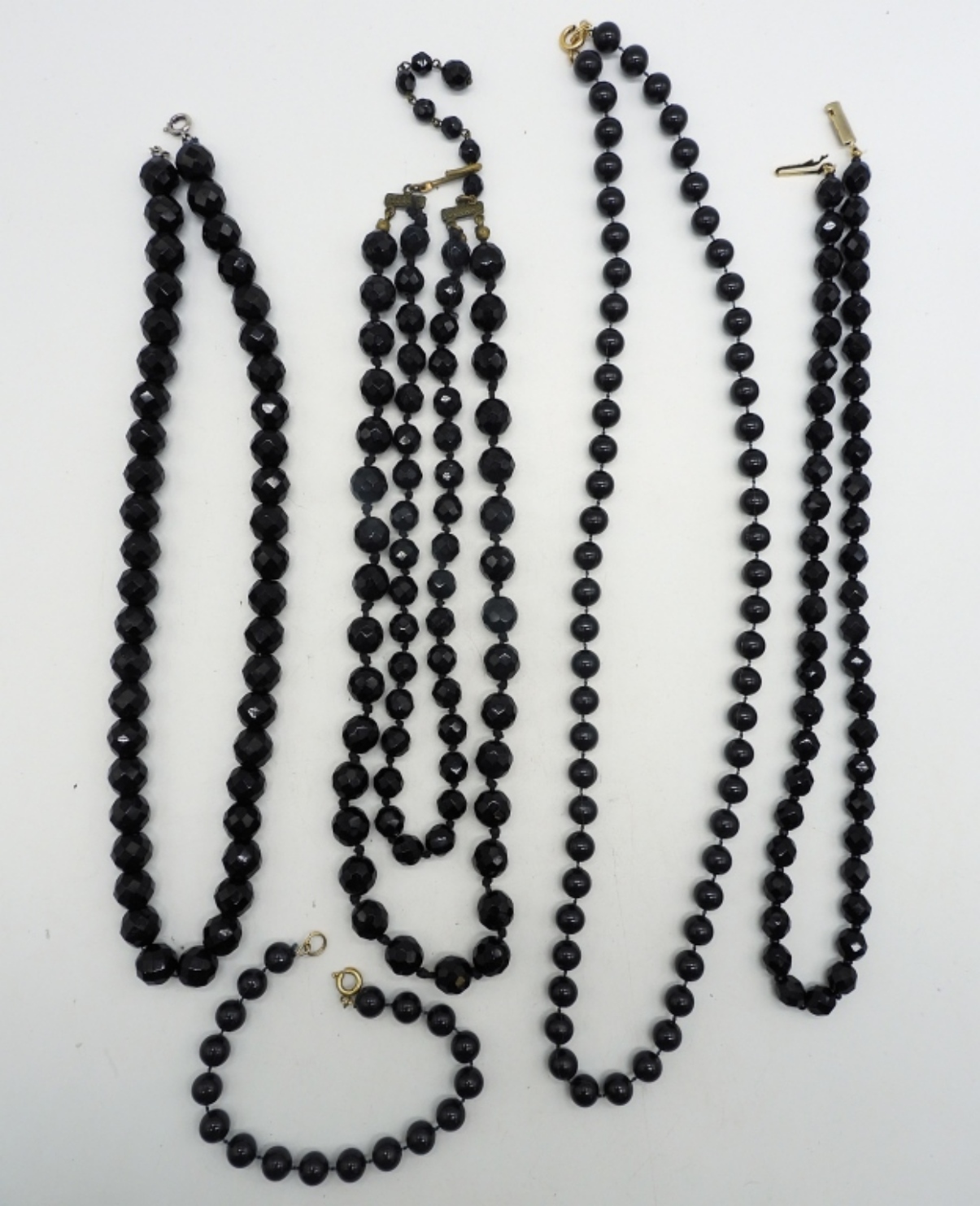 FOUR VINTAGE BLACK NECKLACES AND ONE VINTAGE MATCHING BLACK BRACELET. NECKLACES ARE 18″, 19″, 24″. BRACELET IS 7″