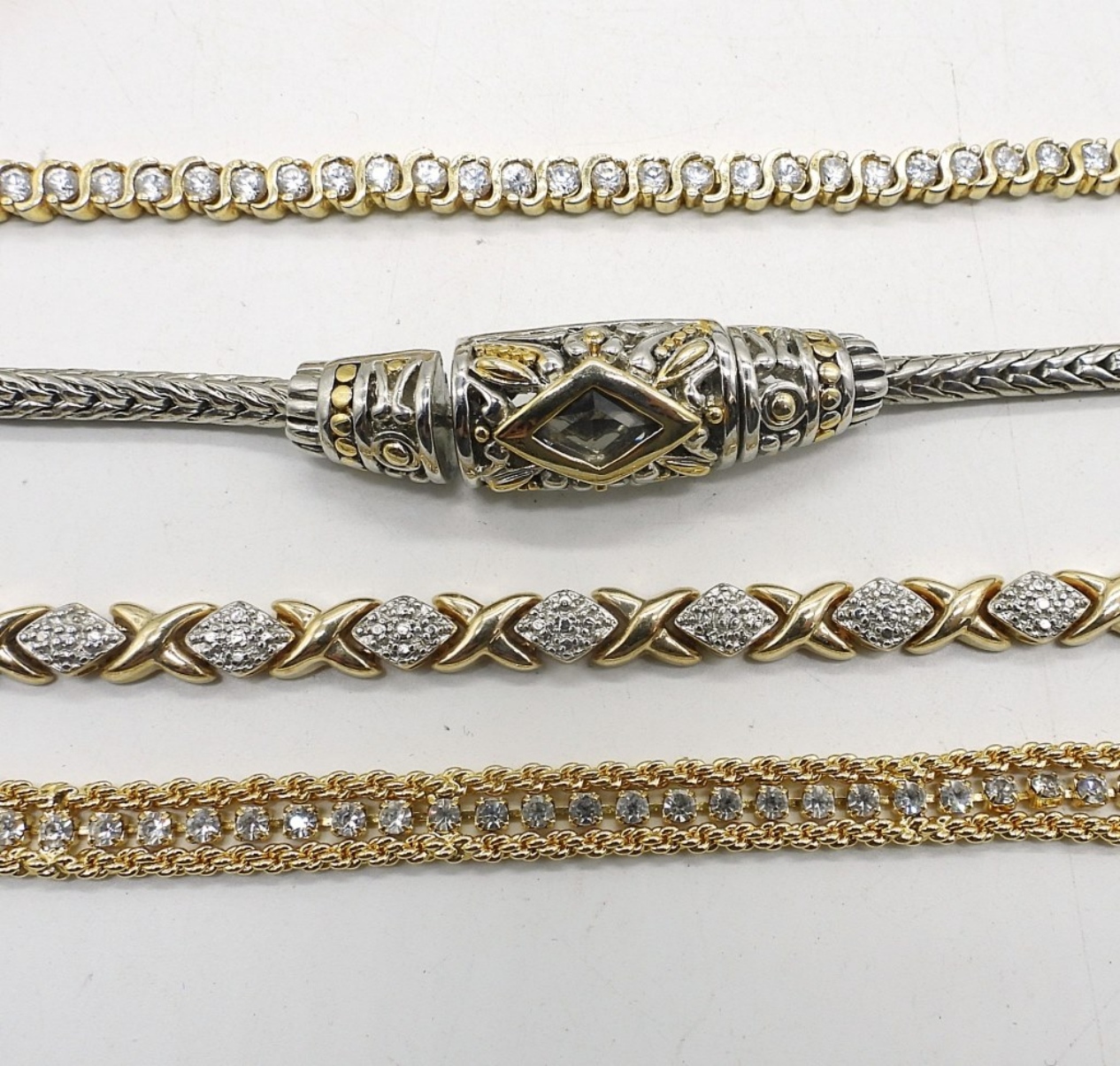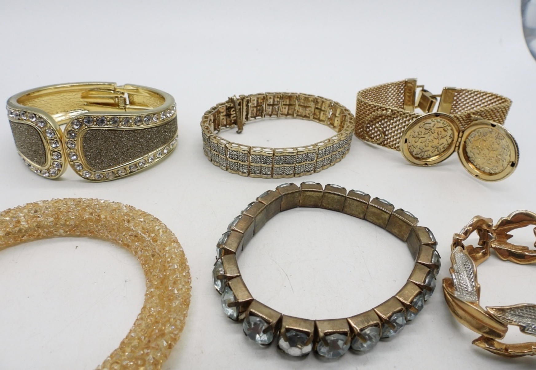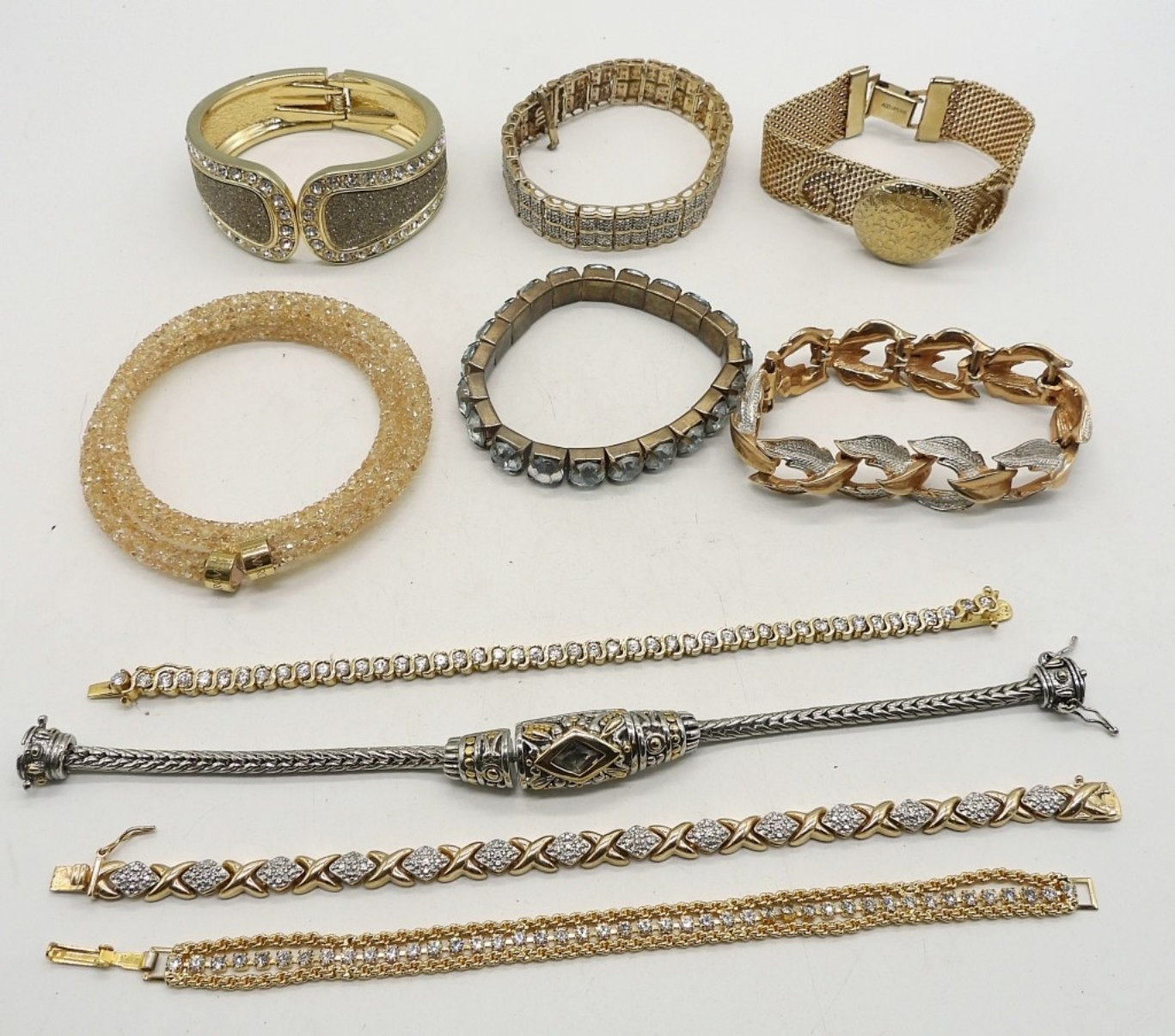 TEN GOLD TONE BRACELETS, VERY SPARKLY, VERY PRETTY. ALL STYLES. 6-8″.