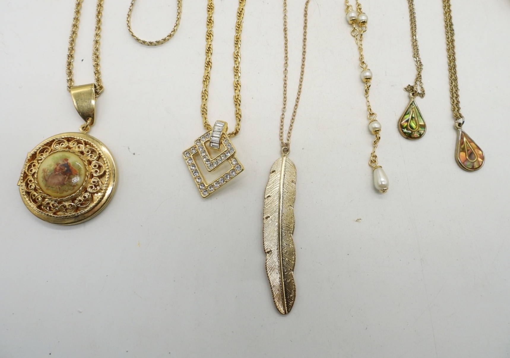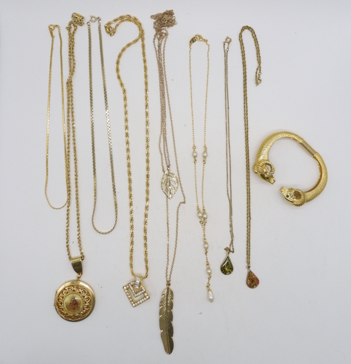 BRACELET IS AVON, RAMS HEAD. 6″. 8 NECKLACES, GOLD TONE, 16-30″