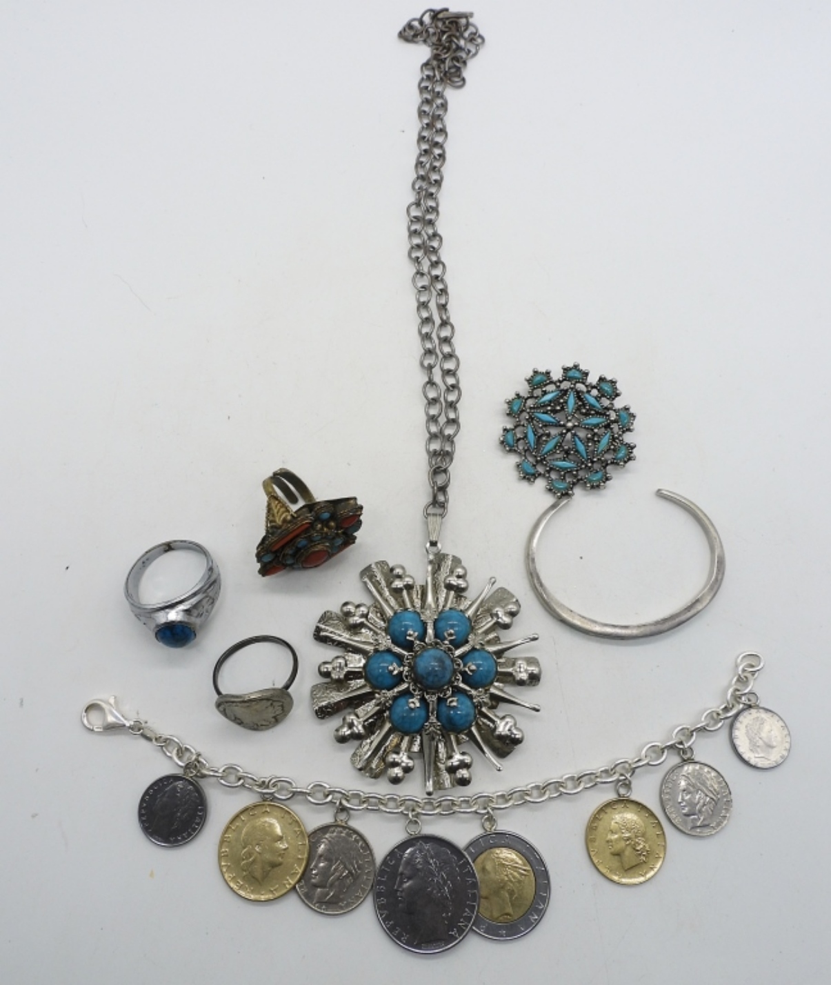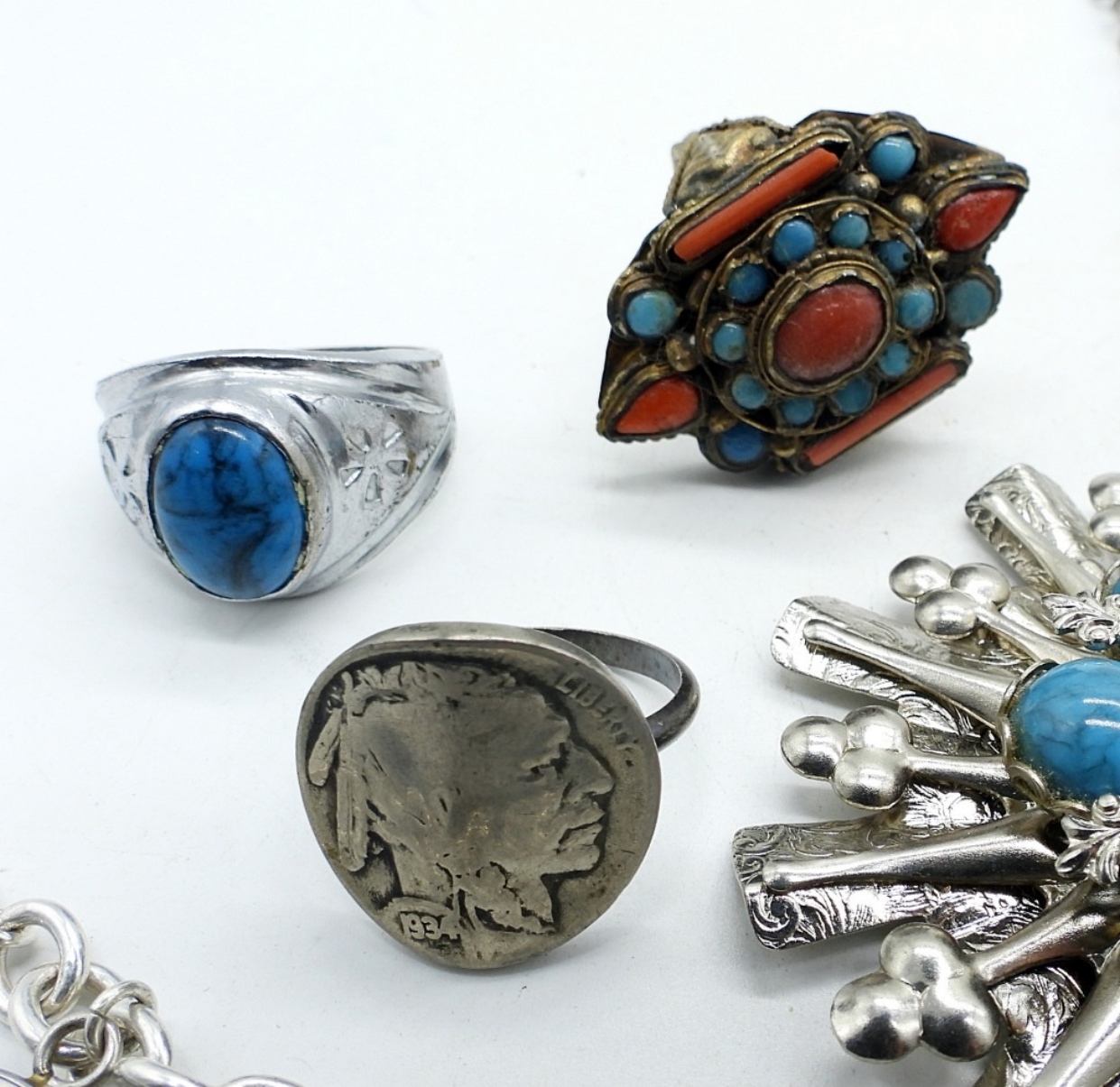 ONE NECKLACE, 20″ TWO BRACELETS, 6″ & 8″. THREE RINGS, SIZES 10 & 13. ONE PIN, 2″.