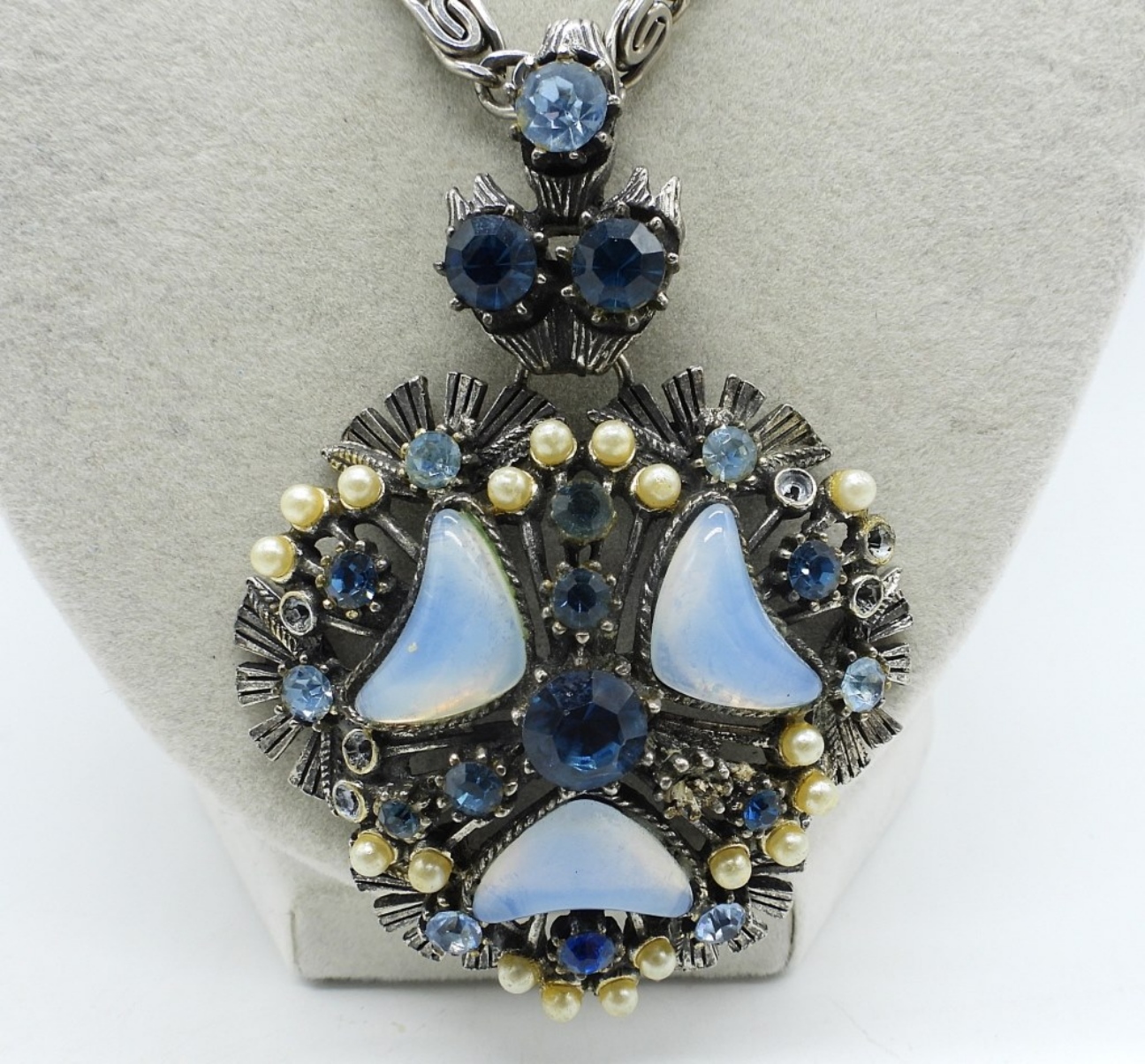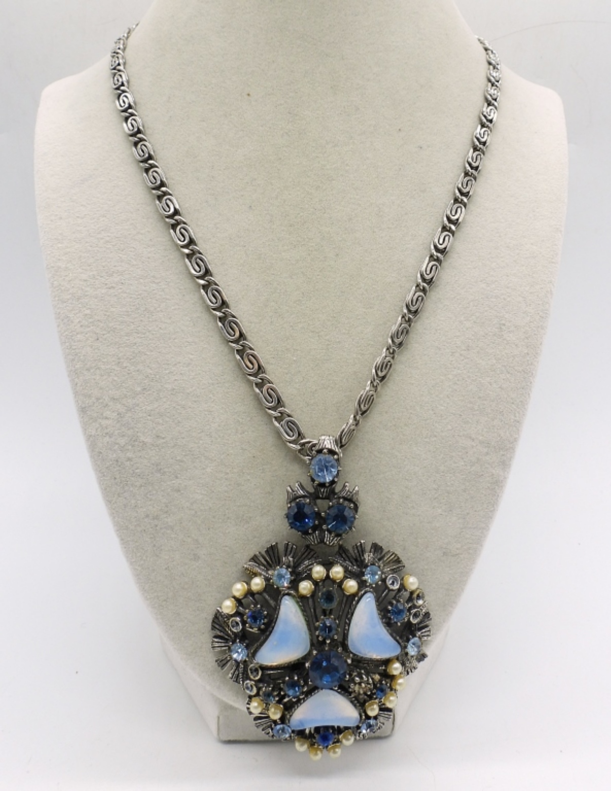 ONE LARGE SILVER TONE MOONSTONE LIKE GEMS, BLUE RHINESTONE PENDANT FROM FLORENZA, SIGNED! ON A 18″ CHAIN.