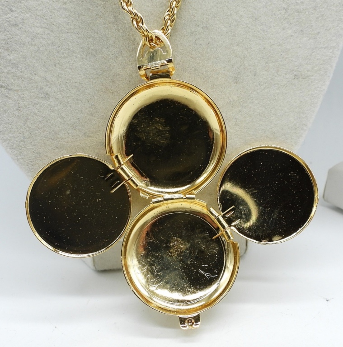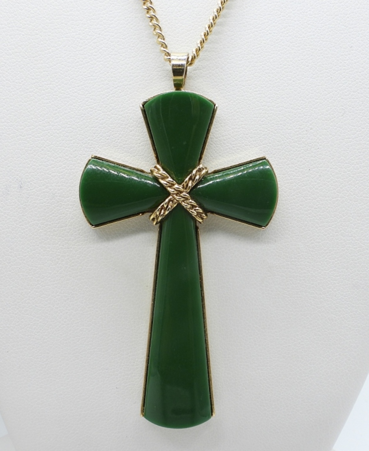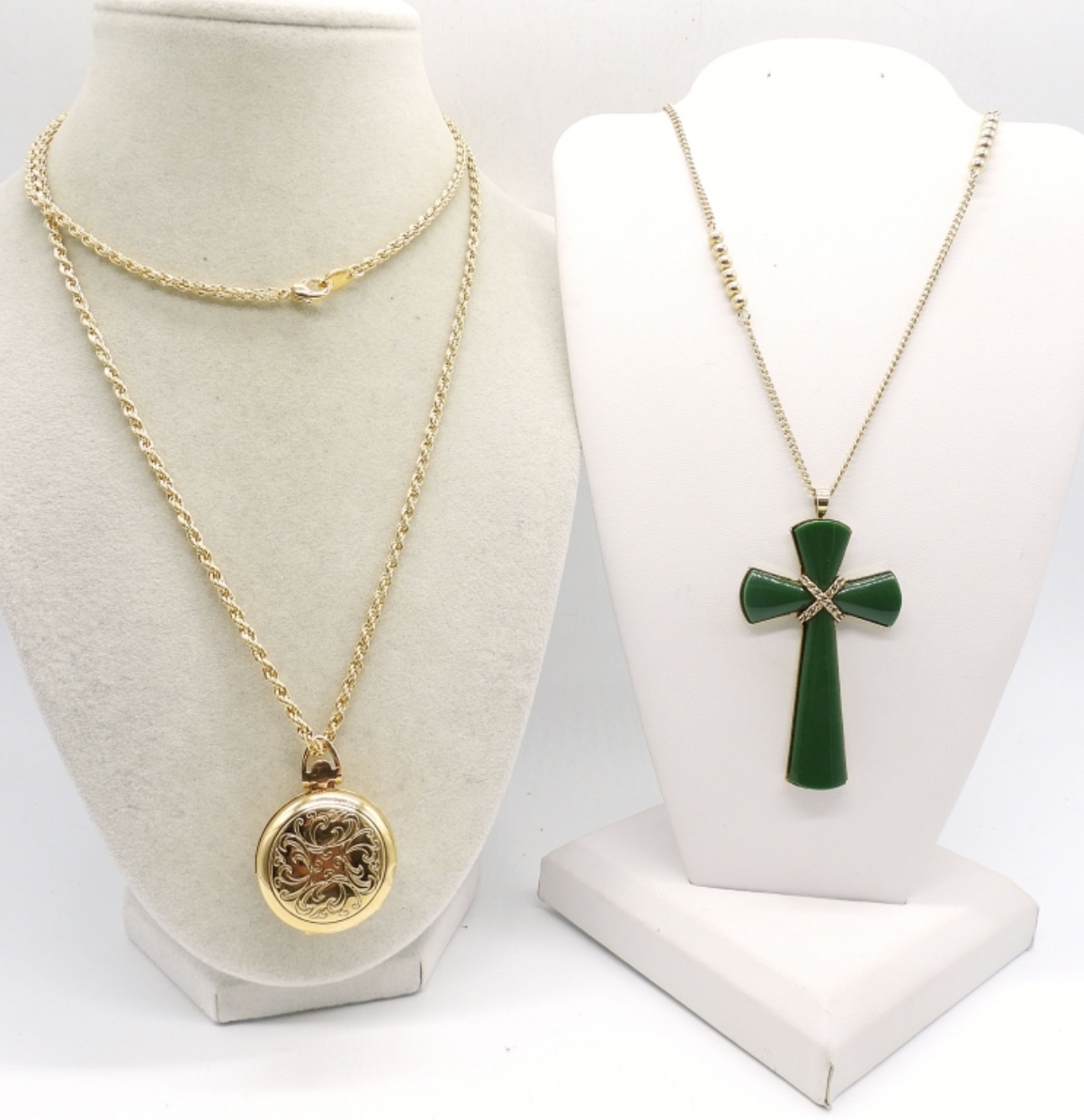 GOLD TONE, GREEN FRONT CROSS NECKLACE, 20″. AVON GOLD TONE 4 PHOTO LOCKET, 30″.
