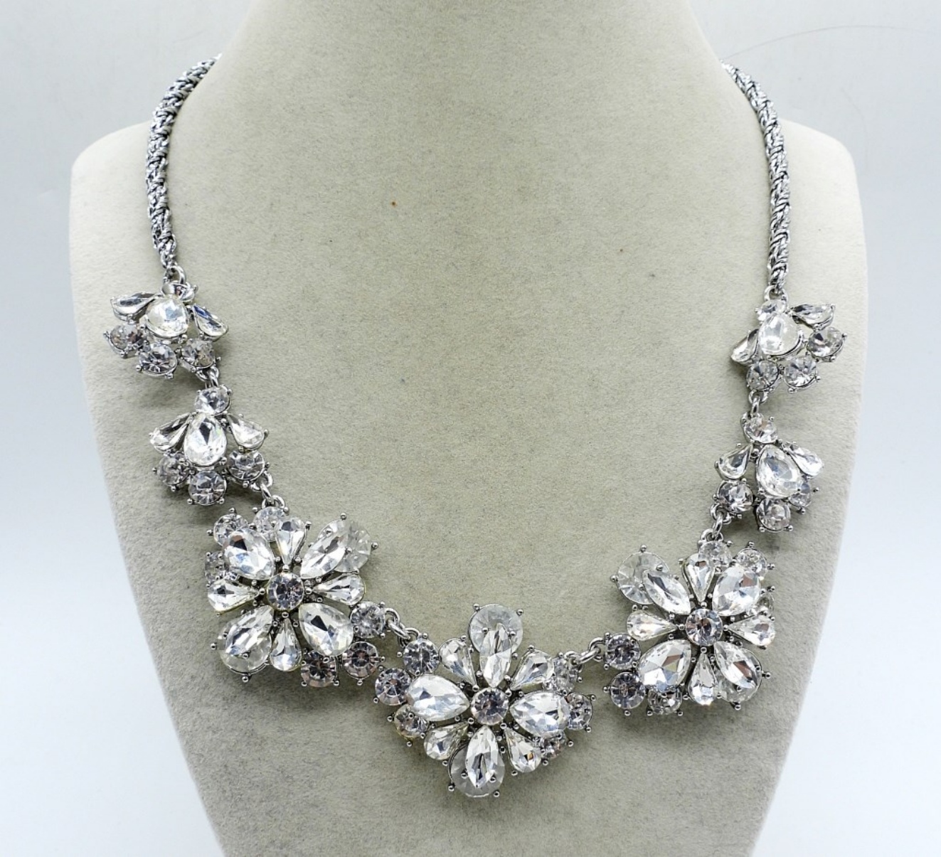 ONE GORGEOUS SILVER TONE FLOWER SHAPED RHINESTONE NECKLACE, 20″. MARKED CHARTER CLUB.