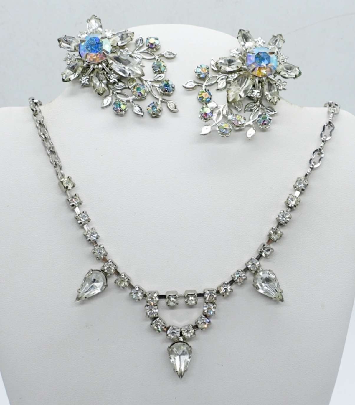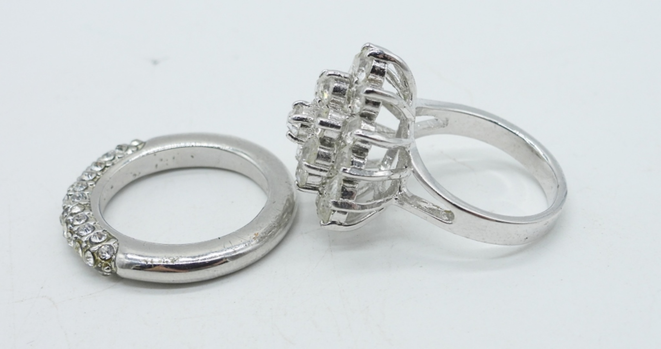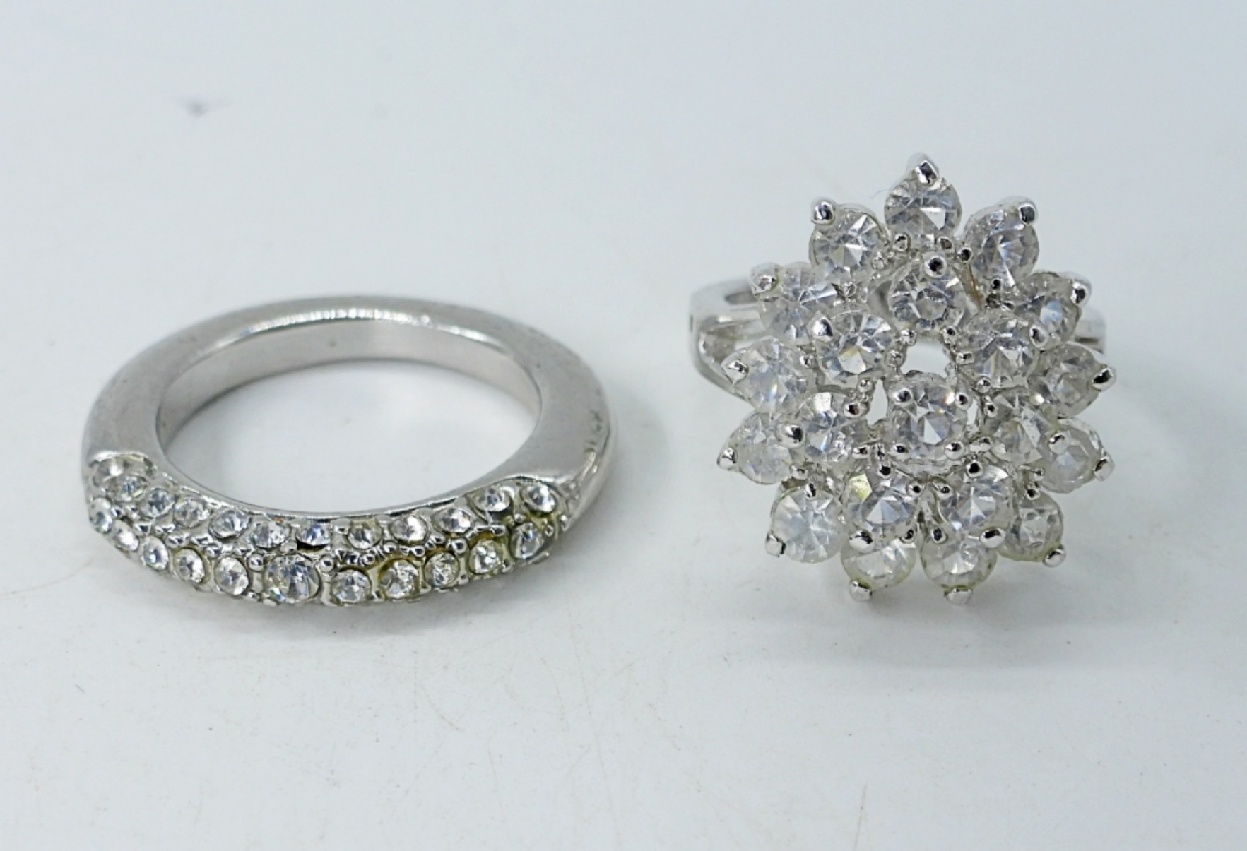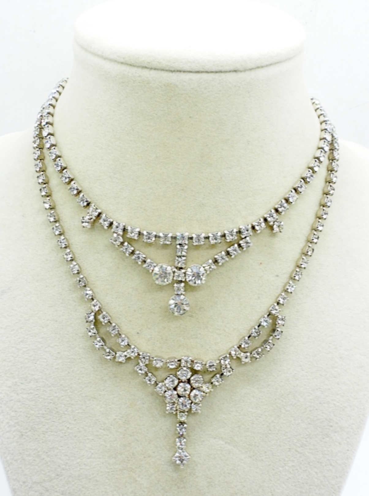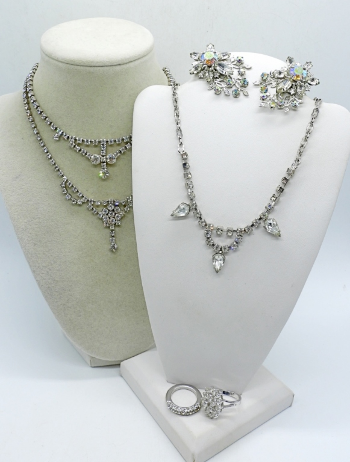 THREE GORGEOUS VINTAGE WHITE RHINESTONE NECKLACES, 15-17″. ONE PAIR CLIP ON EARRINGS. TWO RINGS, SIZE 5.5 & 7.