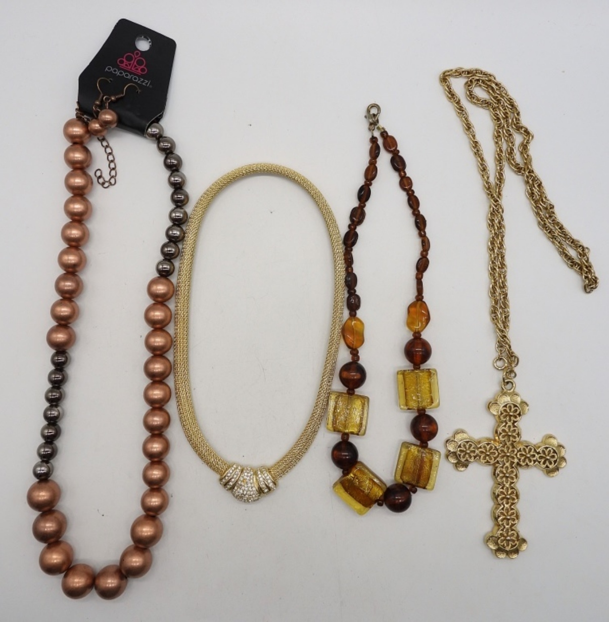 FOUR NECKLACES, GOLD TONES, EARTH TONES. 16″, 20″, 26″. ONE PAIR PIERCED EARRINGS