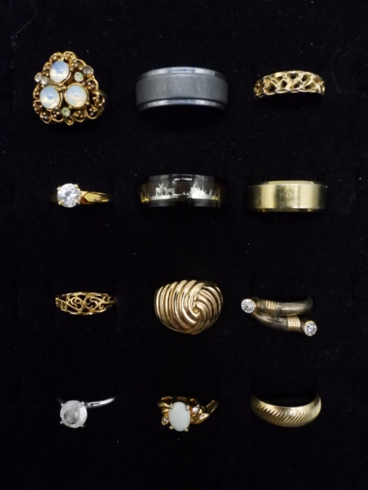 12 GOLD AND SILVER TONE FASHION RINGS, ONE TUNGSTEN. SIZES 4-12