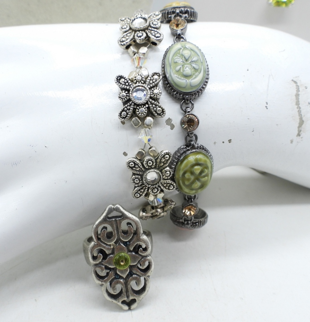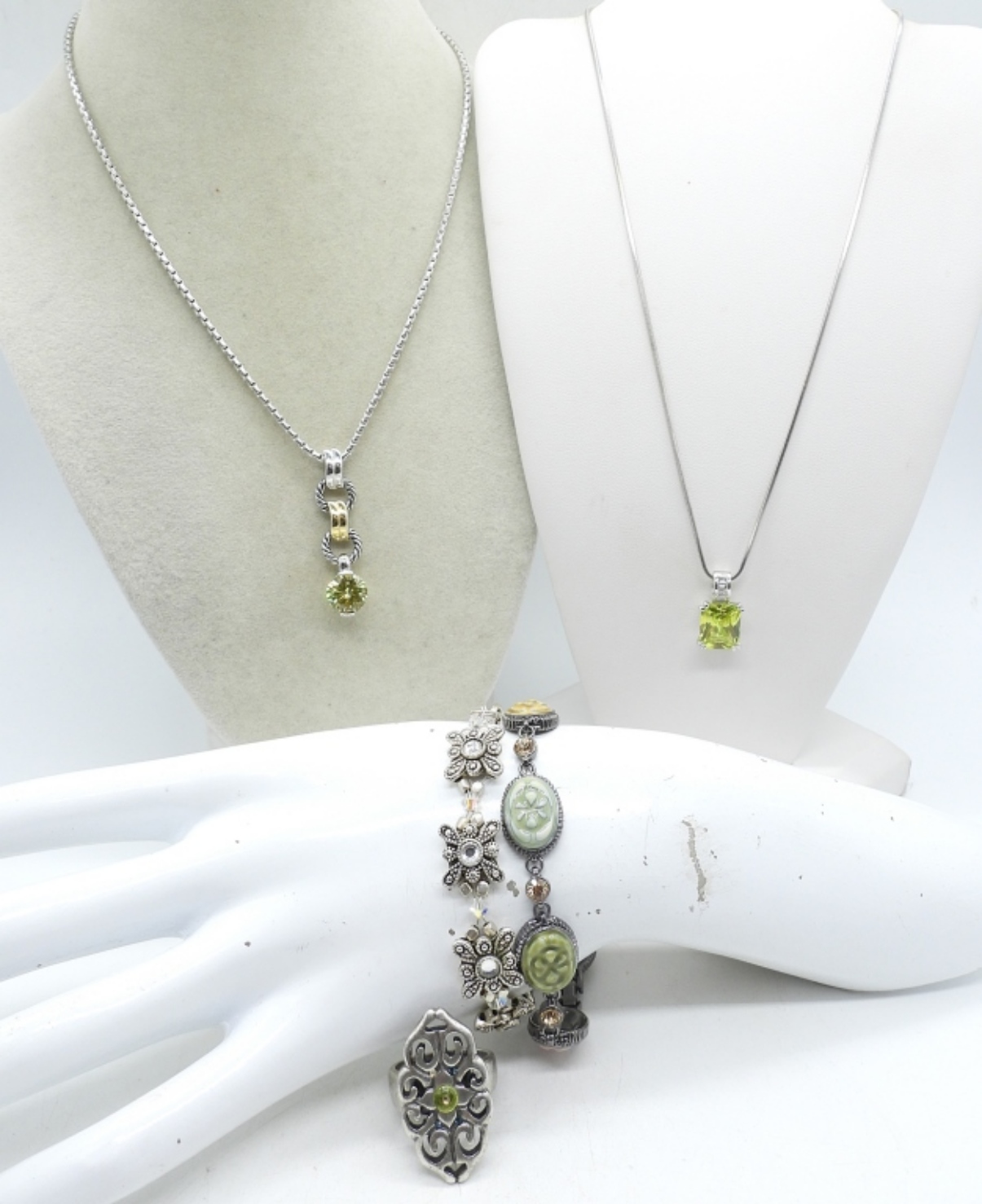 TWO NECKLACES, 17-18″. TWO SILVER TONE BRACELETS, 7-7.5″. RING SIZE 8.