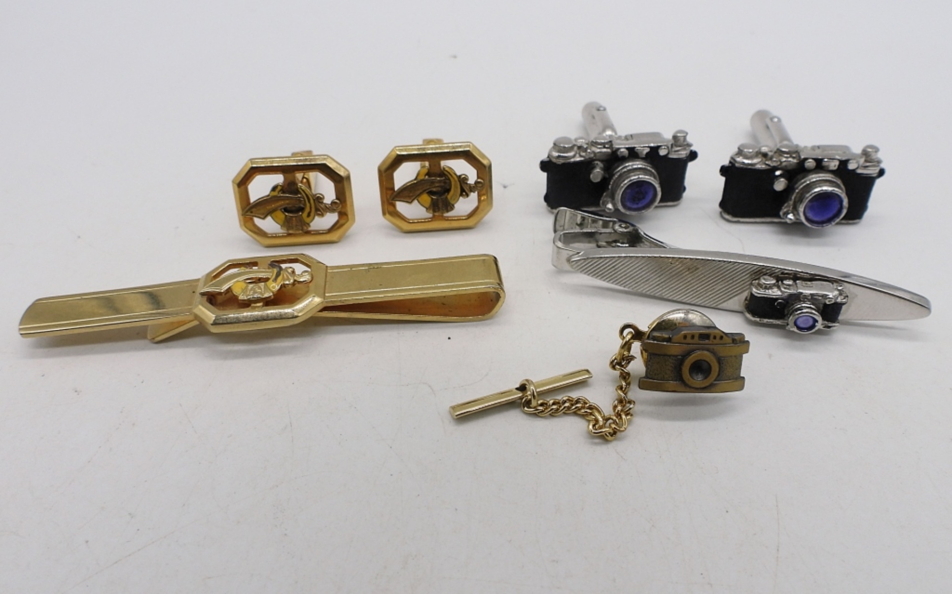 VINTAGE. CAMERA SHAPED CUFF LINKS, TIE PIN & TIE CLIP. SHRINERS TIE BAR AND MATCHING CUFF LINKS.