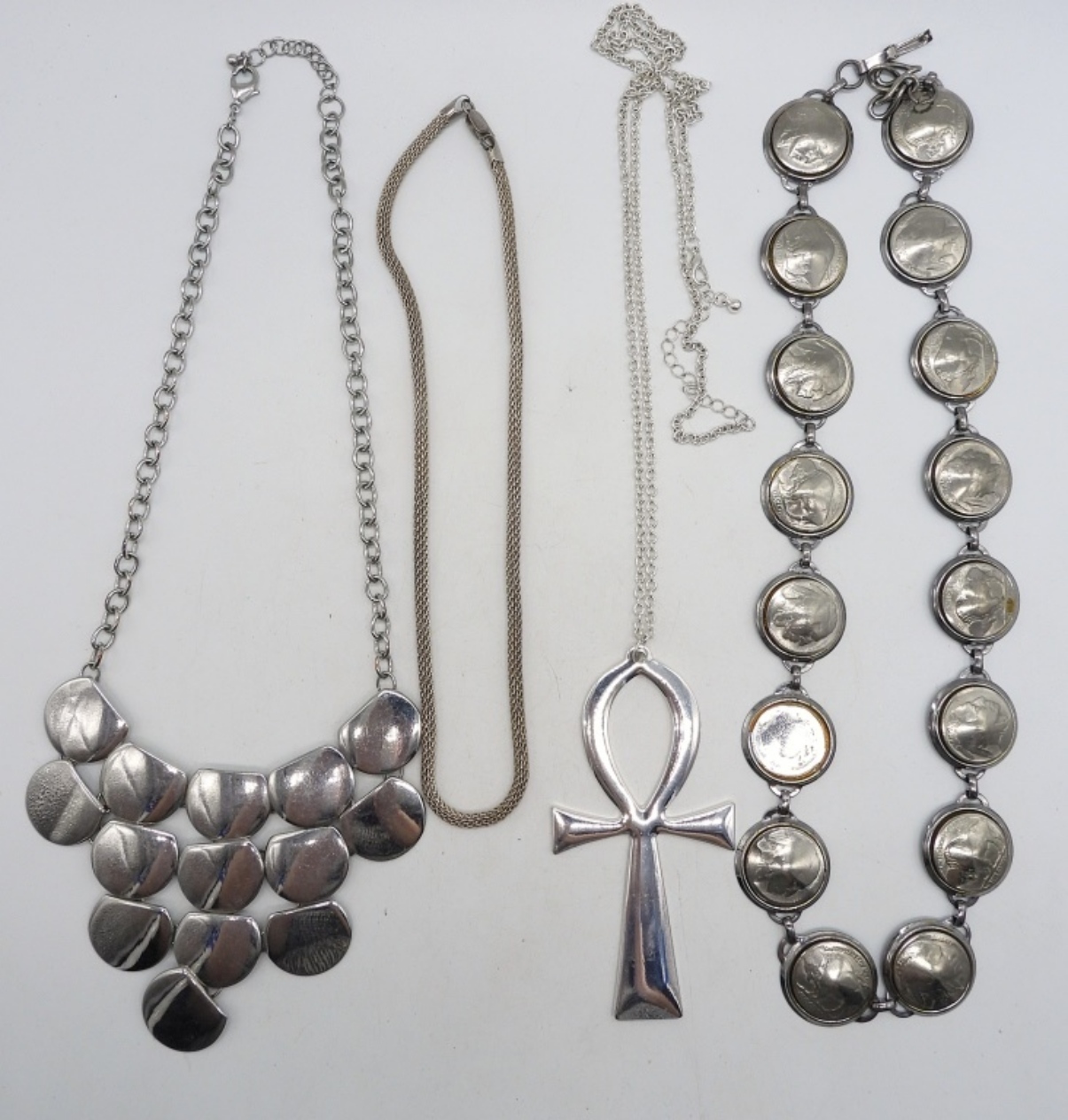 25″ FASHION BELT, METAL, NICKELS. MISSING ONE COIN. THREE SILVER TONE FASHION NECKLACES. 17″, 20″ & 34″.