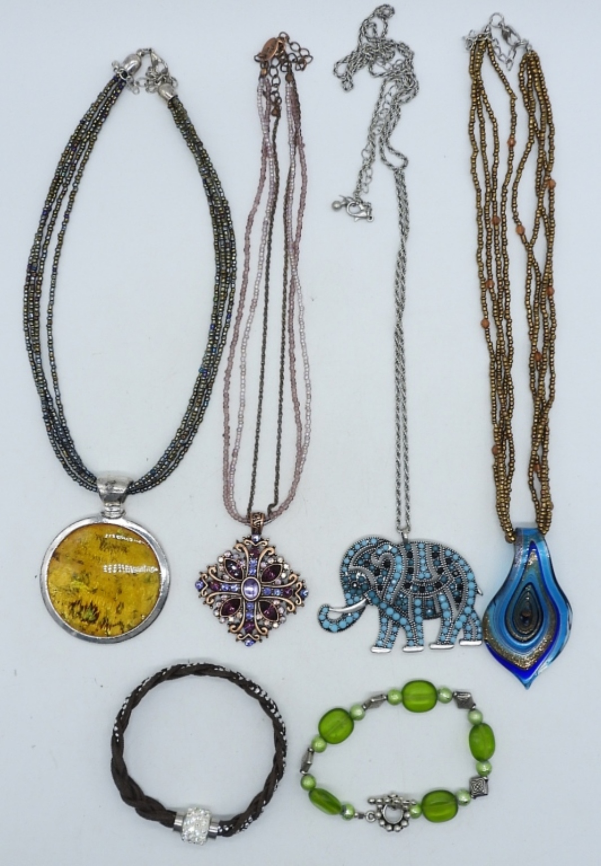 FOUR NECKLACES, 18-34″. TWO BRACELETS, STRETCHY & 7″.
