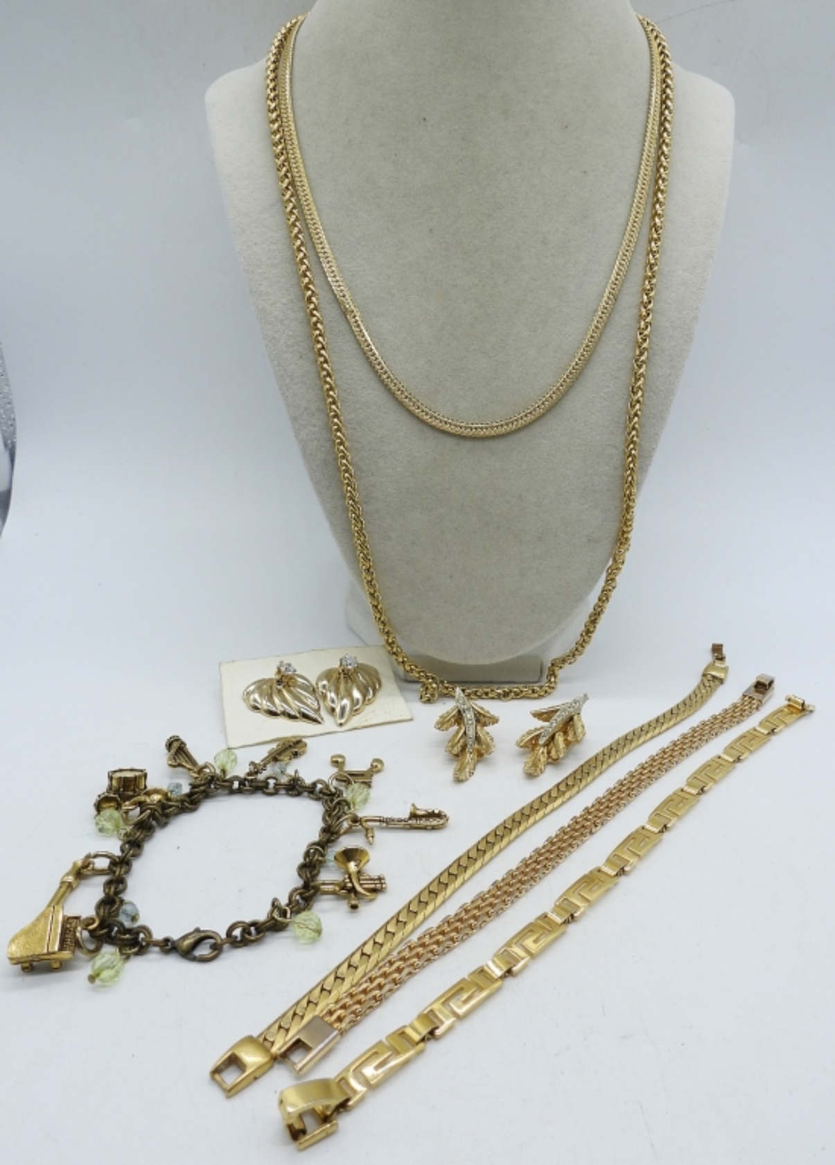 2 GOLD TONE CHAIN NECKLACES, 18″ & 26″. 4 GOLD TONE BRACELETS, 7-8″. ONE PAIR OF PIERCED EARRINGS AND ONE PAIR OF VINTAGE CLIP ONS.