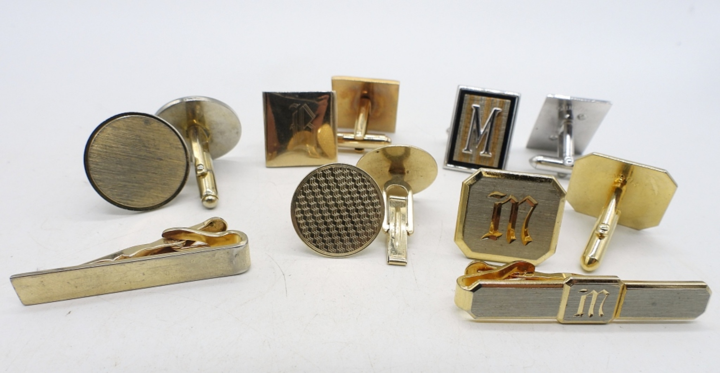 VINTAGE CUFF LINKS AND TIE CLIPS. GOLD AND SILVER TONES.